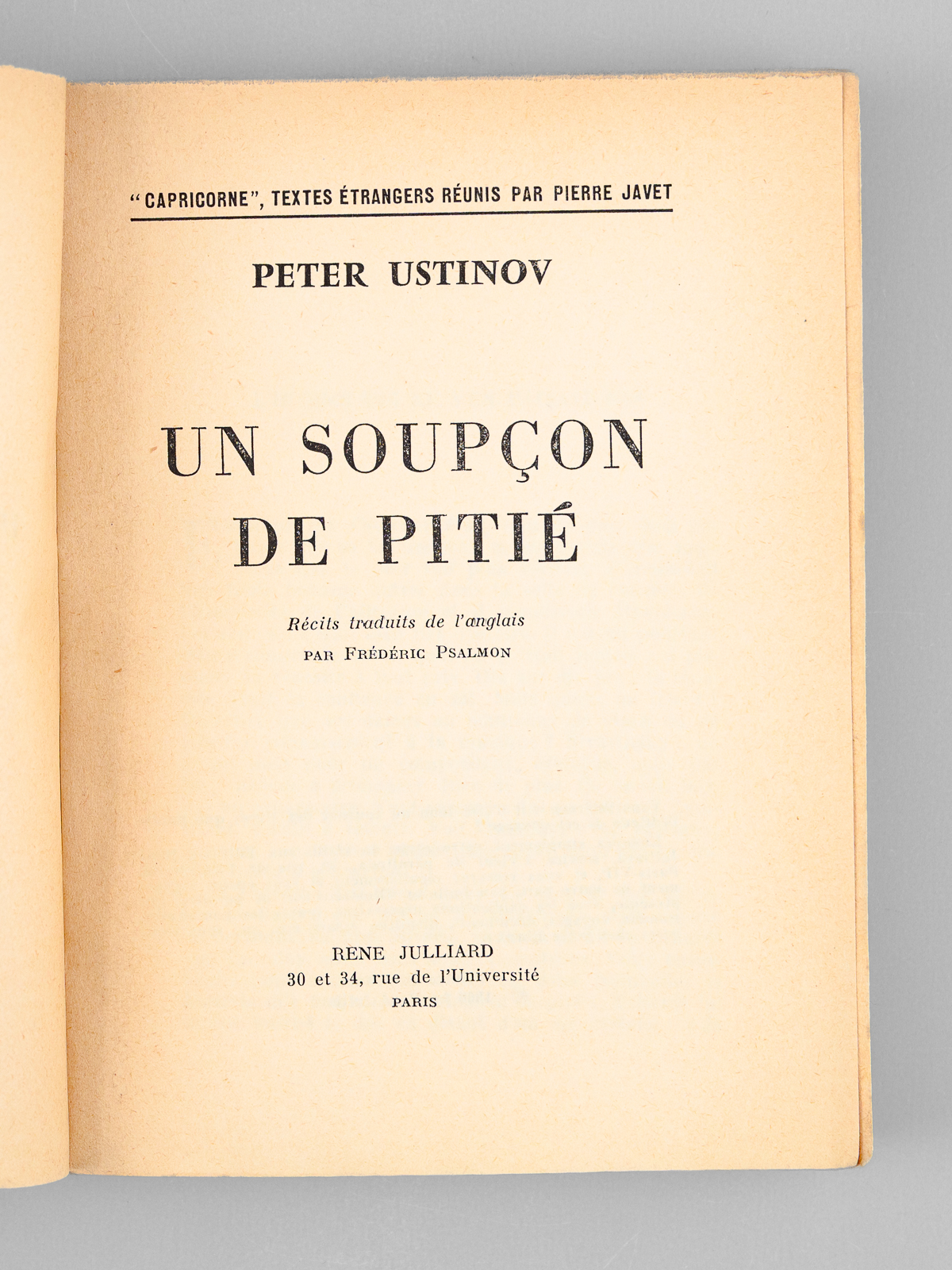 Exemplaire du service de presse marqué S.P., Récit traduit de l'anglais par Frédéric Salmon, 1 vol. in-8 br., coll. Capricorne, Julliard, Paris, 1960, 246 pp. Commentaire : Bel envoi humoristique de Peter Ustinov à Maurice Druon : 'A Don Maurizio Druonini della Rovere, génuflexions en permanence'. Bon état (couv. lég. frottée, bon exemplaire par ailleurs)
