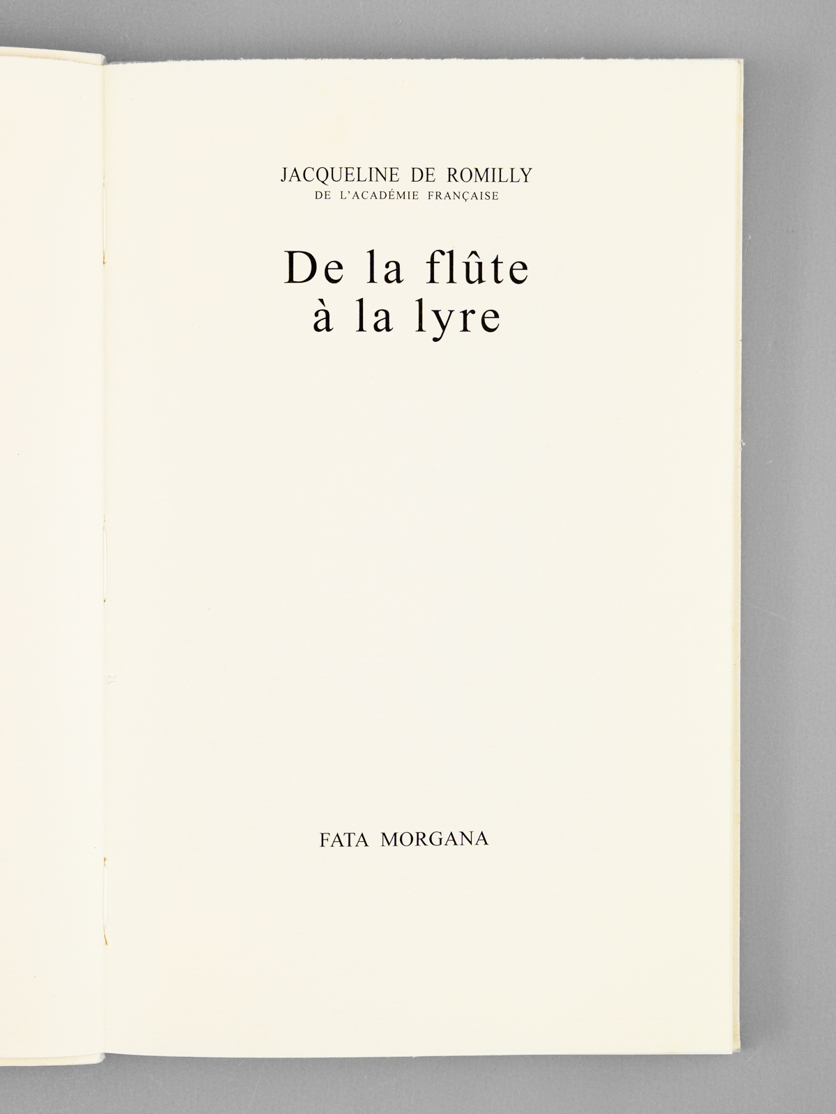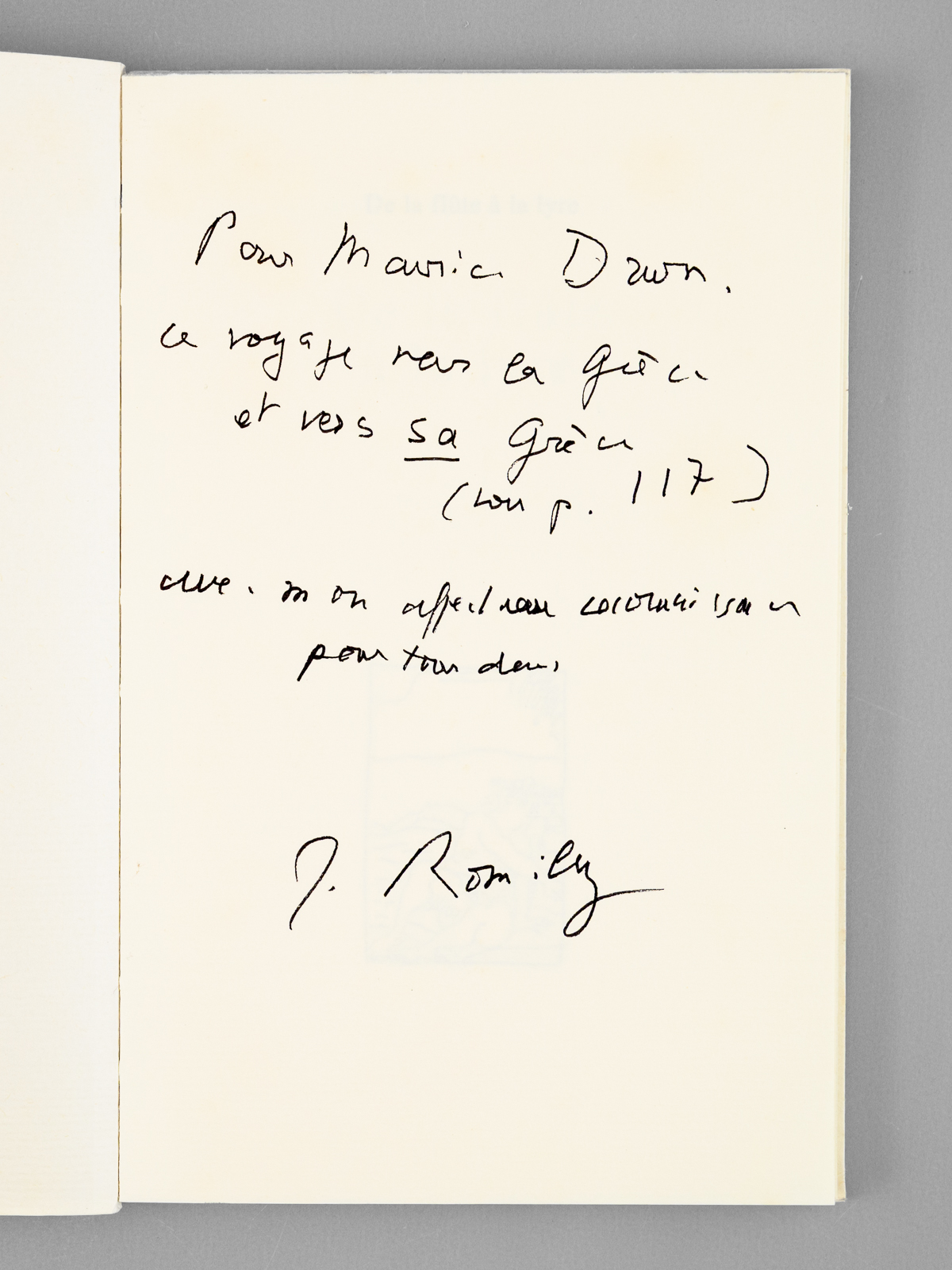 Envoi ms. de l'auteur, vignettes d'André Derain, 1 vol. in-8 br., Fata Morgana, 2004, 120 pp. Commentaire : Exemplaire encore non-coupé. Bel envoi de l'auteur à l'académicien Maurice Druon et son épouse : 'Pour Maurice Druon, ce voyage vers la Grèce et vers sa Grèce (voir p. 117). Avec mon affectueuse reconnaissance pour tous deux.' Maurice Druon (1918-2009), auteur notamment de la célèbre saga historique des Rois maudits, fut élu à l'Académie Française en 1968. Il en devint le Secrétaire Perpétuel, de 1985 à 1999. Jacqueline de Romilly, quant à elle, fut élue à l'Académie Française en 1988. Etat très satisfaisant (rouss. sur tr. sup., bon état par ailleurs) pour cet exemplaire, d'une origine prestigieuse.