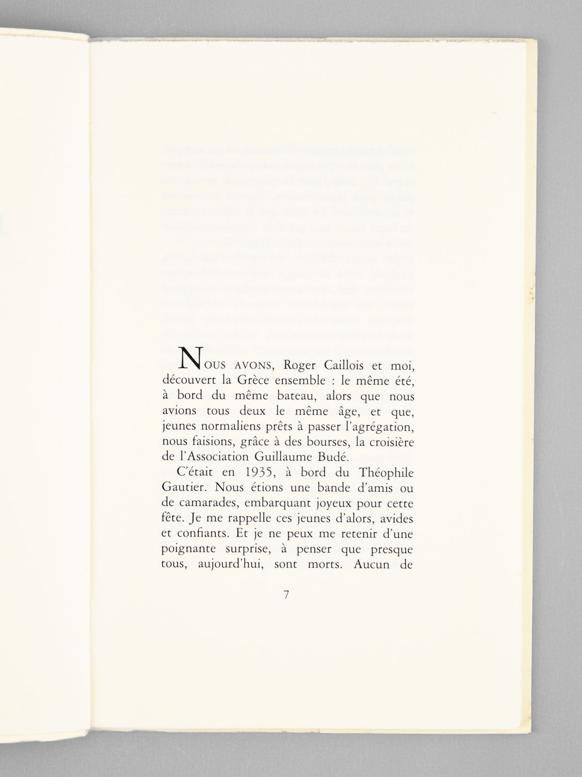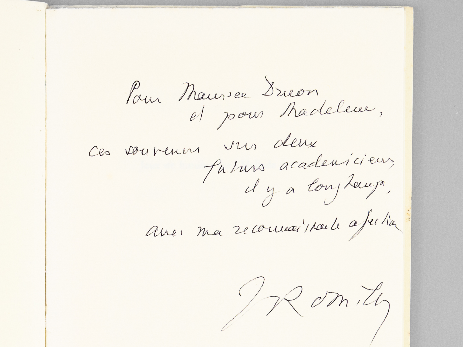 Commentaire : Bel envoi de l'auteur à l'académicien Maurice Druon et à son épouse : 'Pour Maurice Druon et pour Madeleine, ces souvenirs sur deux futurs académiciens, il y a longtemps. Avec ma reconnaissante affection.' Maurice Druon (1918-2009), auteur notamment de la célèbre saga historique des Rois maudits, fut élu à l'Académie Française en 1968. Il en devint le Secrétaire Perpétuel, de 1985 à 1999. Jacqueline de Romilly, quant à elle, fut élue à l'Académie Française en 1988. Etat très satisfaisant (rouss. sur tr. sup., bon état par ailleurs) pour cet exemplaire, d'une origine prestigieuse. Les deux académiciens évoqués dans la dédicace sont l'auteur et Rogers Caillois (1913-1978).