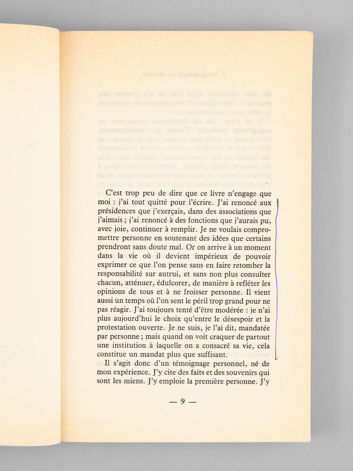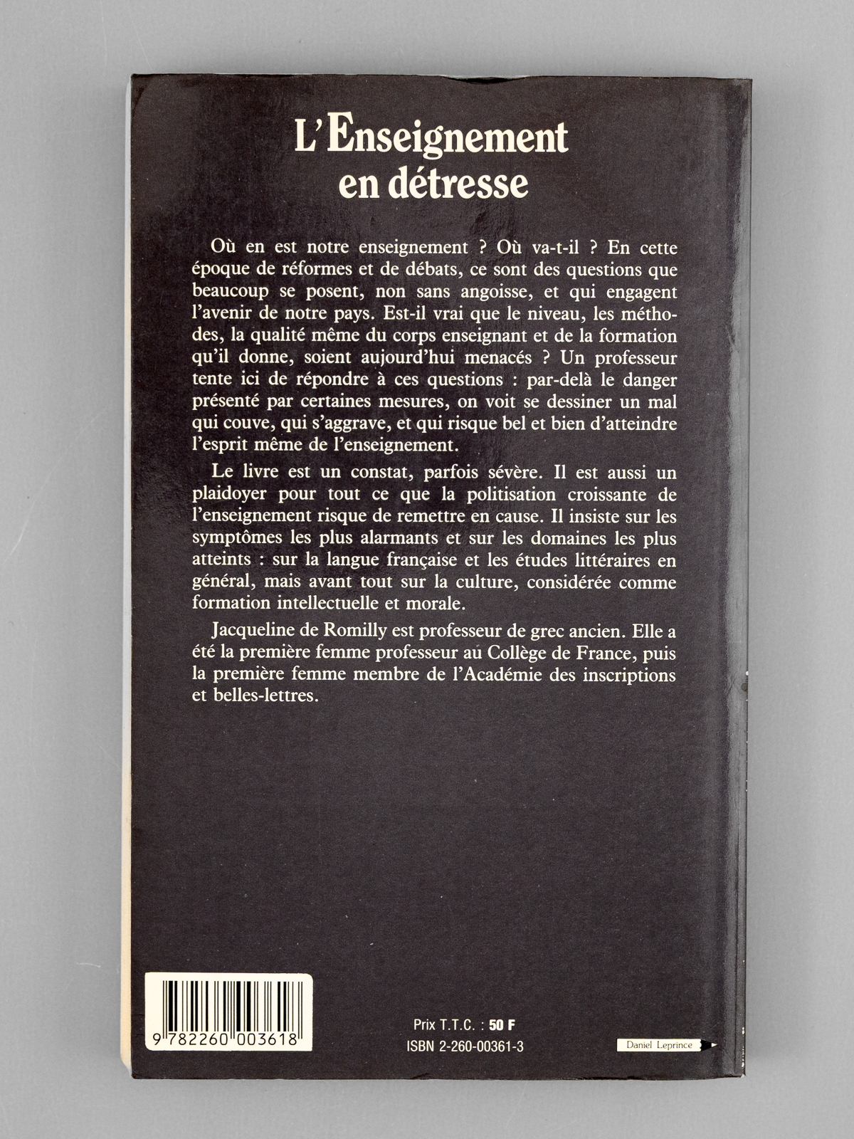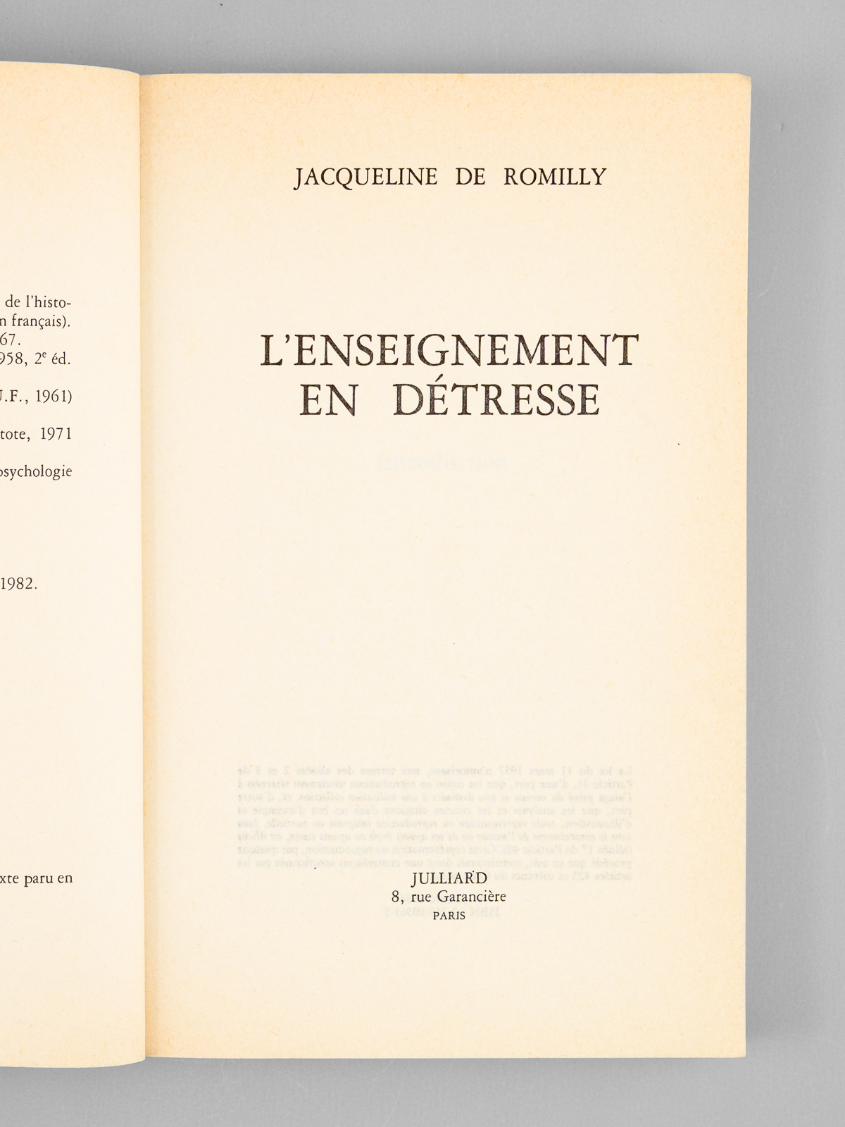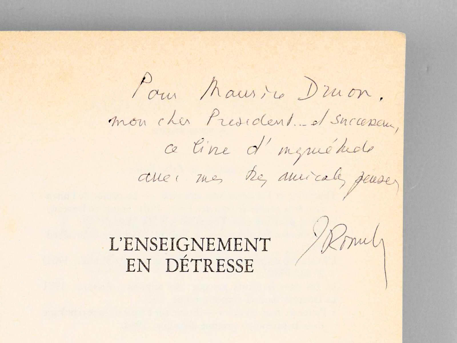 Envoi ms. de l'auteur, 1 vol. in-12 br., Julliard, 1984, 218 pp. Commentaire : Bel envoi de l'auteur à l'académicien Maurice Druon : 'Pour Maurice Druon, mon cher Président ... et successeur, ce livre d'inquiétude, avec mes très amicales pensées.' Maurice Druon (1918-2009), auteur notamment de la célèbre saga historique des Rois maudits, fut élu à l'Académie Française en 1968. Il en devint le Secrétaire Perpétuel, de 1985 à 1999. Jacqueline de Romilly, quant à elle, fut élue à l'Académie Française en 1988. Etat très satisfaisant (lég. rouss. sur tr., bon état par ailleurs) pour cet exemplaire, d'une origine prestigieuse. Multiples marques aux stylos en marge et pages écornées volontairement par Maurice Druon, qui montrent l'attention qu'il a porté à la lecture de ce livre...
