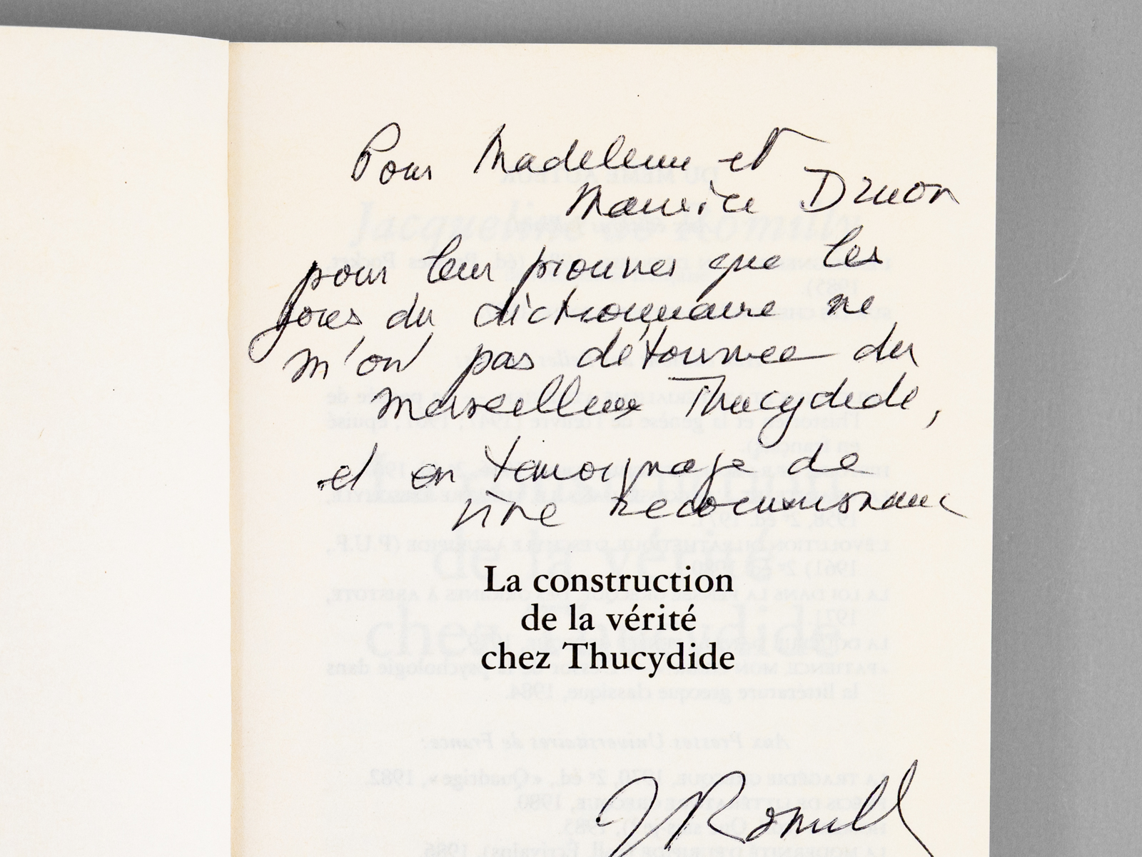 Commentaire : Bel envoi de l'auteur à l'académicien Maurice Druon et à son épouse : 'Pour Madeleine et Maurice Druon, pour leur prover que les joies du dictionnaire ne m'ont pas détournée du merveilleux Thucydide, et en témoignage de ma vive reconnaissance.' Maurice Druon (1918-2009), auteur notamment de la célèbre saga historique des Rois maudits, fut élu à l'Académie Française en 1968. Il en devint le Secrétaire Perpétuel, de 1985 à 1999. Jacqueline de Romilly, quant à elle, fut élue à l'Académie Française en 1988. Etat très satisfaisant (lég. rouss. sur tr. sup., bon état par ailleurs) pour cet exemplaire, d'une origine prestigieuse. La lecture de Thucydide eut une grande importance dans le choix de la jeune Jacqueline David, de se lancer dans une carrière d'helléniste.