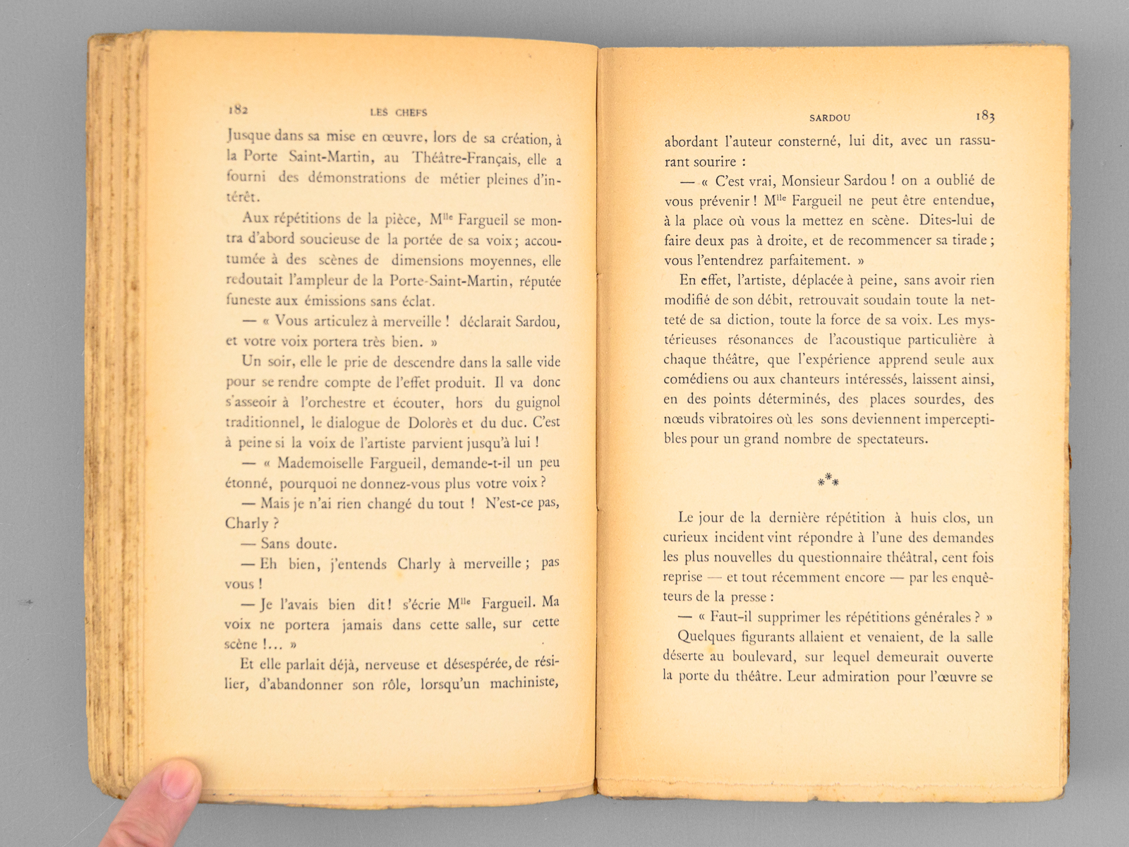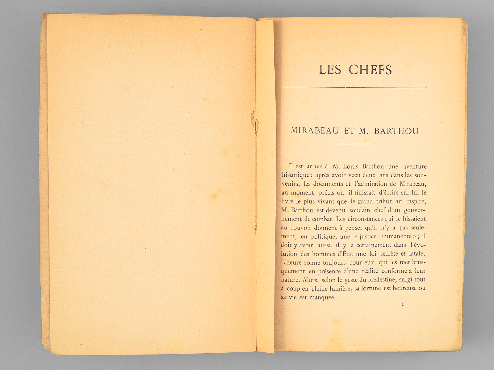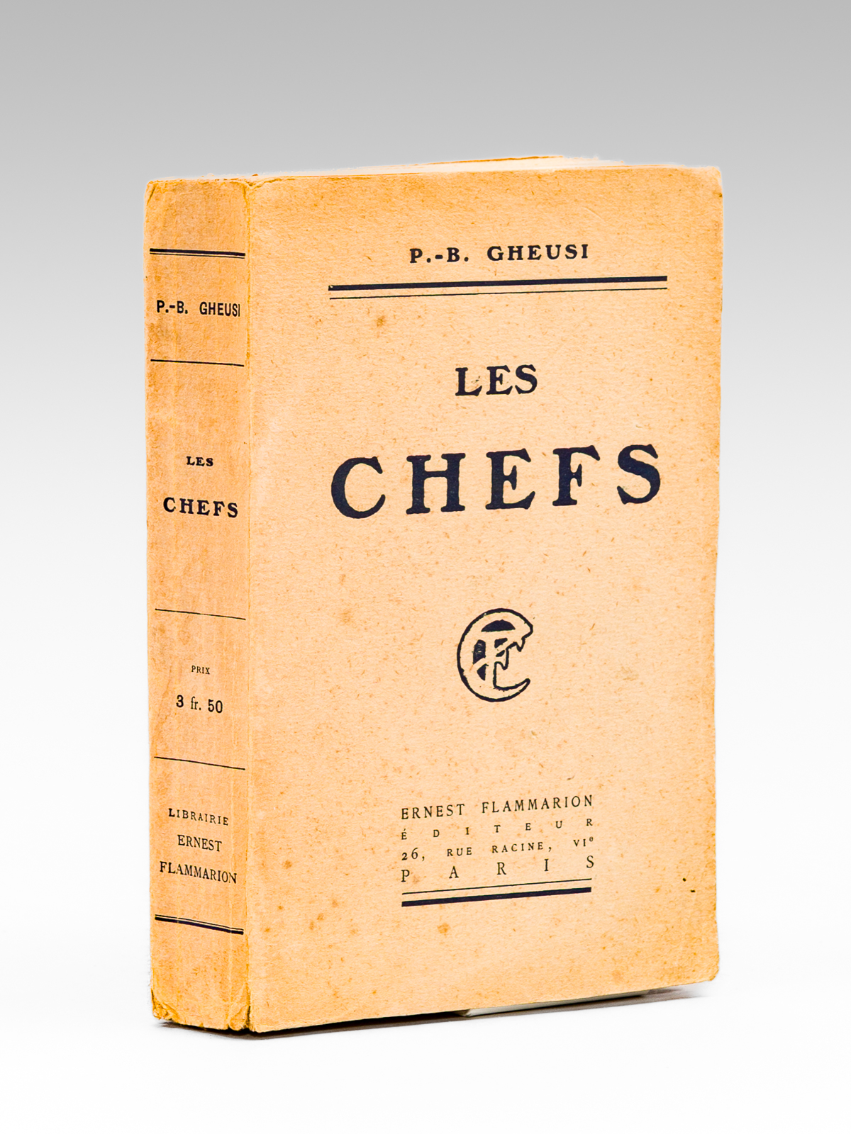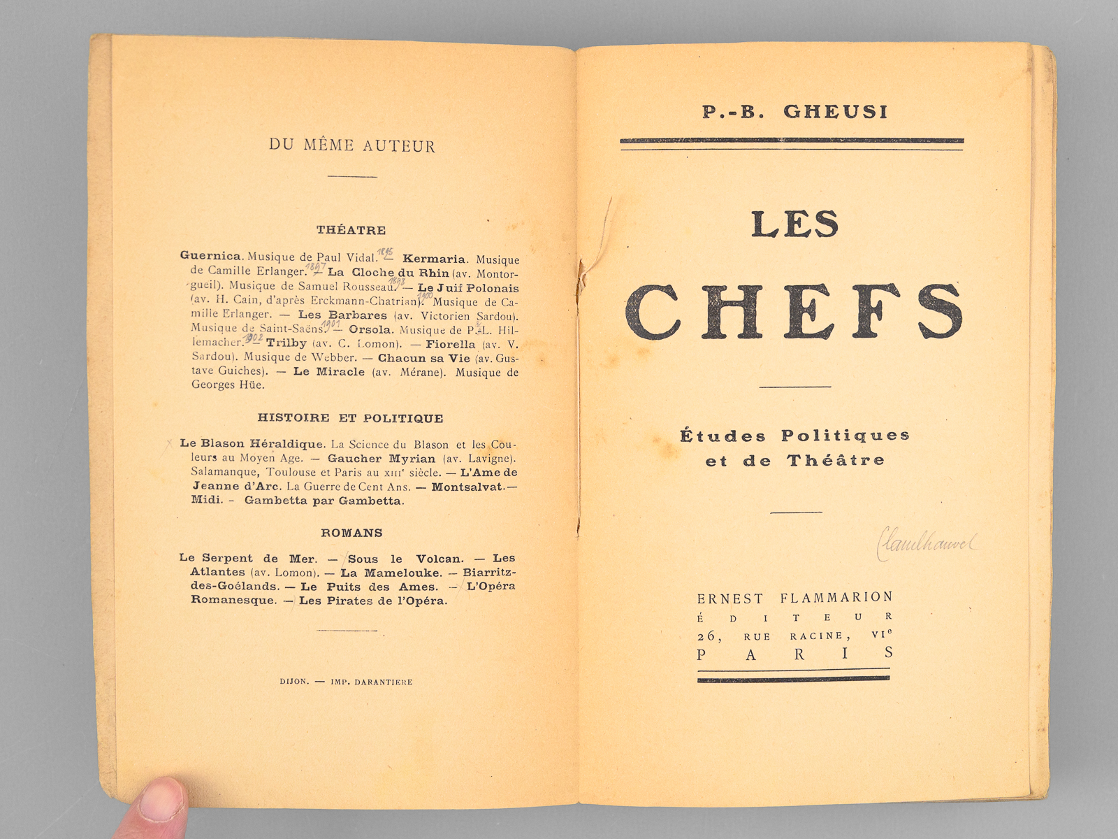 Commentaire : Bon état (petit ex libris ms.) pour cet essai du journaliste, écrivain et directeur du Théâtre National de l'Opéra-Comique, P.-B. Gheusi. Dans le présent essai, Gheusi traite des divers sujets suivants : Mirabeau et Louis Barthou ; Ernest Constans ; Gambetta ; Madame Adam ; Victorien Sardou ; La Mort de Madame Atkyns (Charlotte Walpole) ; Chantecler ; Florent Willems ; Orsola ; Victor Hugo Basque ; Les Grands lyriques.
