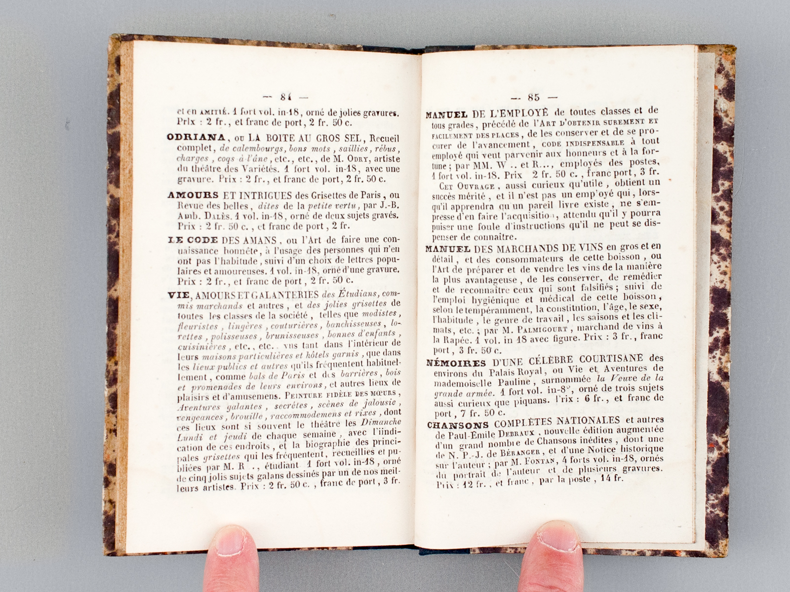 Commentaire : Rare exemplaire de ce petit ouvrage, typique des productions de l'éditeur L. Terry. On remarquera à la fin de l'ouvrage un extrait de son catalogue, signalant notamment la célèbre 'Pornologie ou histoire nouvelle universelle & complète de la débauche de la prostitution' du docteur J. Morel de Rubempré, lequel a rédigé l'introduction du présent ouvrage. Comme le plus souvent dans les éditions Terry, libraire au Palais Royal Galerie de Valois (ce qui voulait déjà dire beaucoup), les préoccupations morales paraissent simplement justifier l'étude de sujets scabreux... Bon état (plats un peu frottés). Gay Lemmonyer, II, 714 (qui signale seulement l'édition de 1842, de 76 pages).