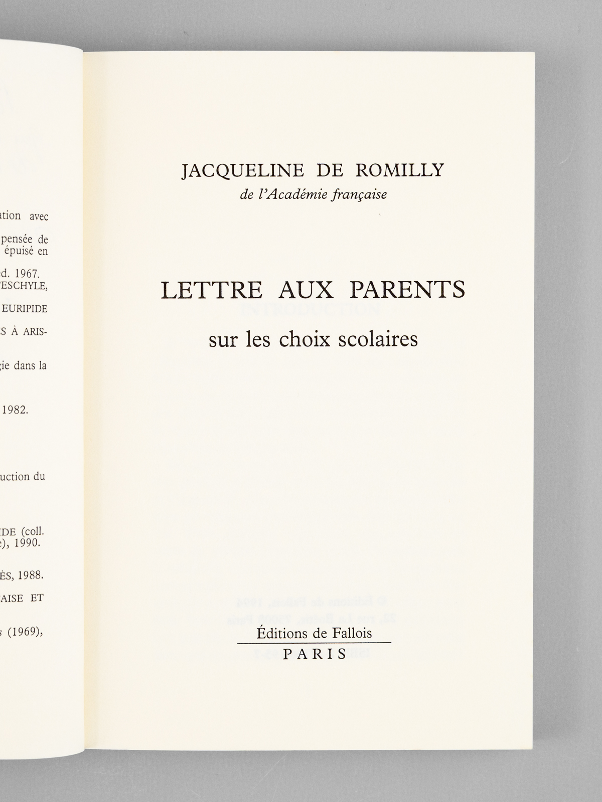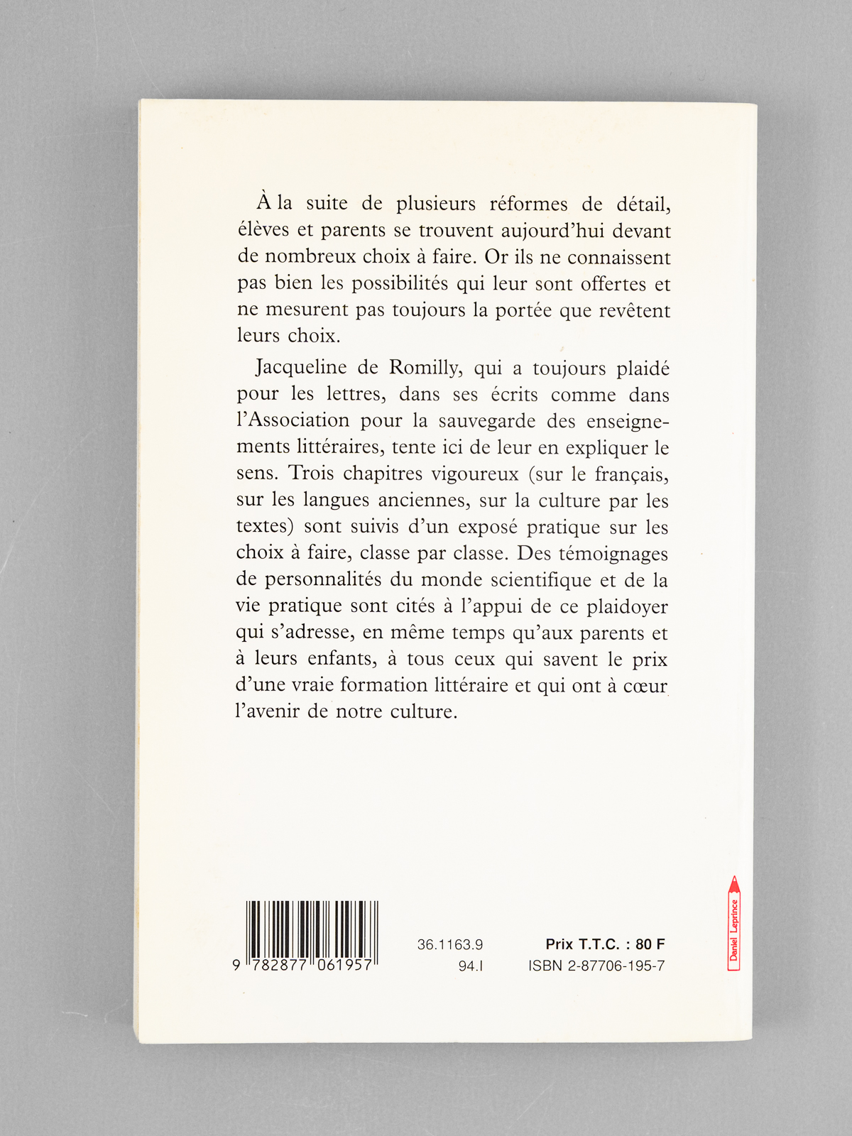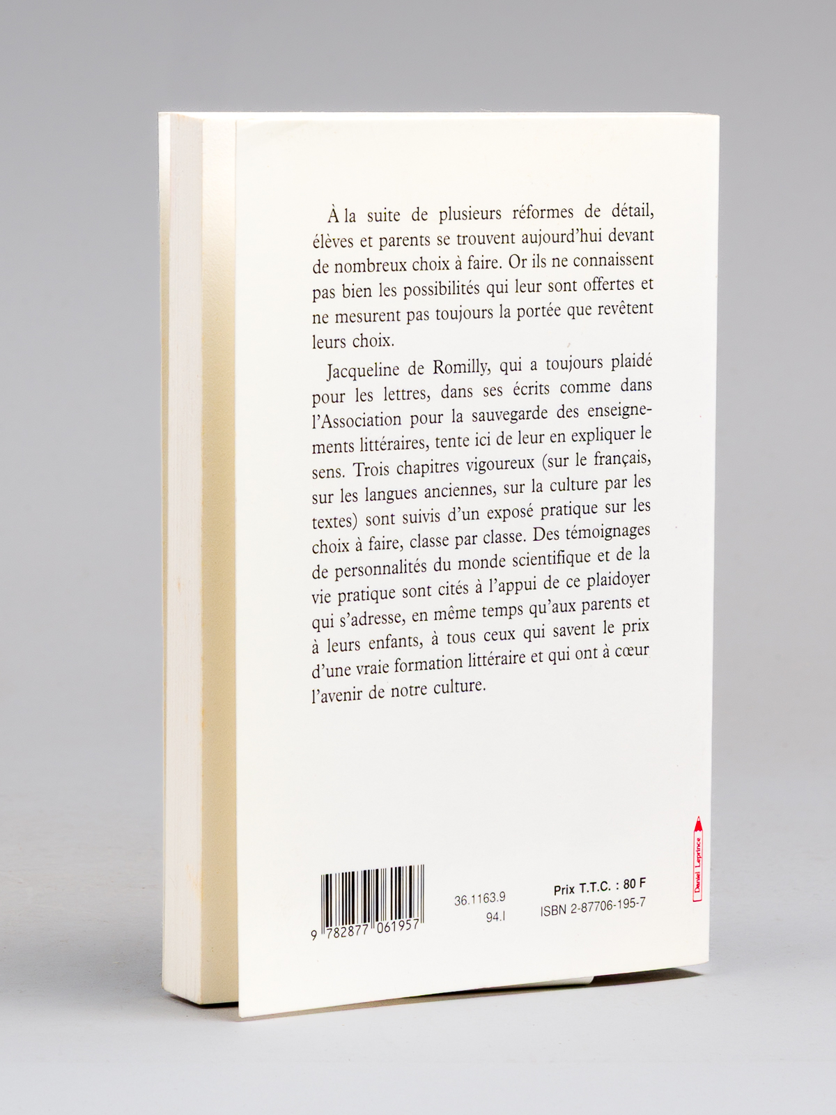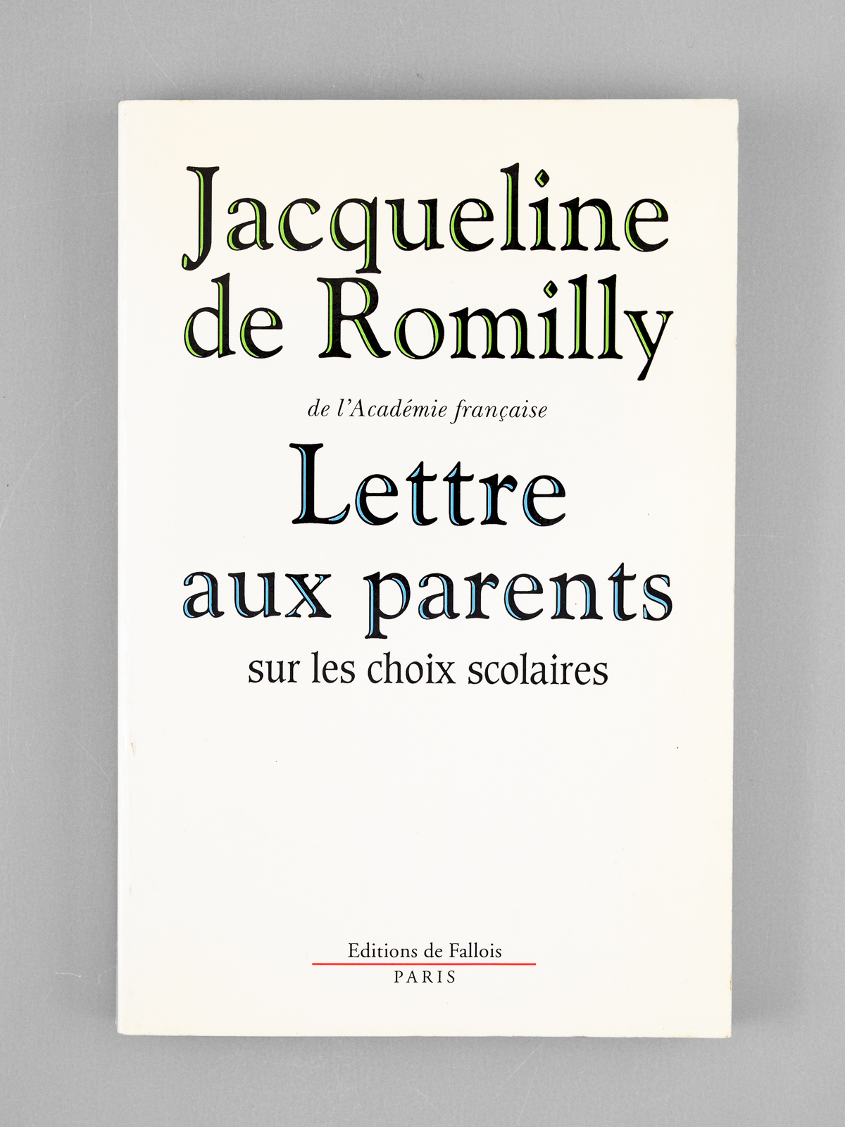 Envoi ms. de l'auteur, 1 vol. in-12 br., Editions de Fallois, Paris, 1993, 143 pp. Commentaire : Bel envoi de l'auteur à l'académicien Maurice Druon et à son épouse : 'Pour Maurice Druonqui a recommandé la lecture de ce petit livre avant de l'avoir vu en entier! Avec mes remerciements et mes voeux chaleureux pour tous deux!' Maurice Druon (1918-2009), auteur notamment de la célèbre saga historique des Rois maudits, fut élu à l'Académie Française en 1968. Il en devint le Secrétaire Perpétuel, de 1985 à 1999. Jacqueline de Romilly, quant à elle, fut élue à l'Académie Française en 1988. Etat très satisfaisant (lég. rouss. sur tr. sup., bon état par ailleurs) pour cet exemplaire, d'une origine prestigieuse.