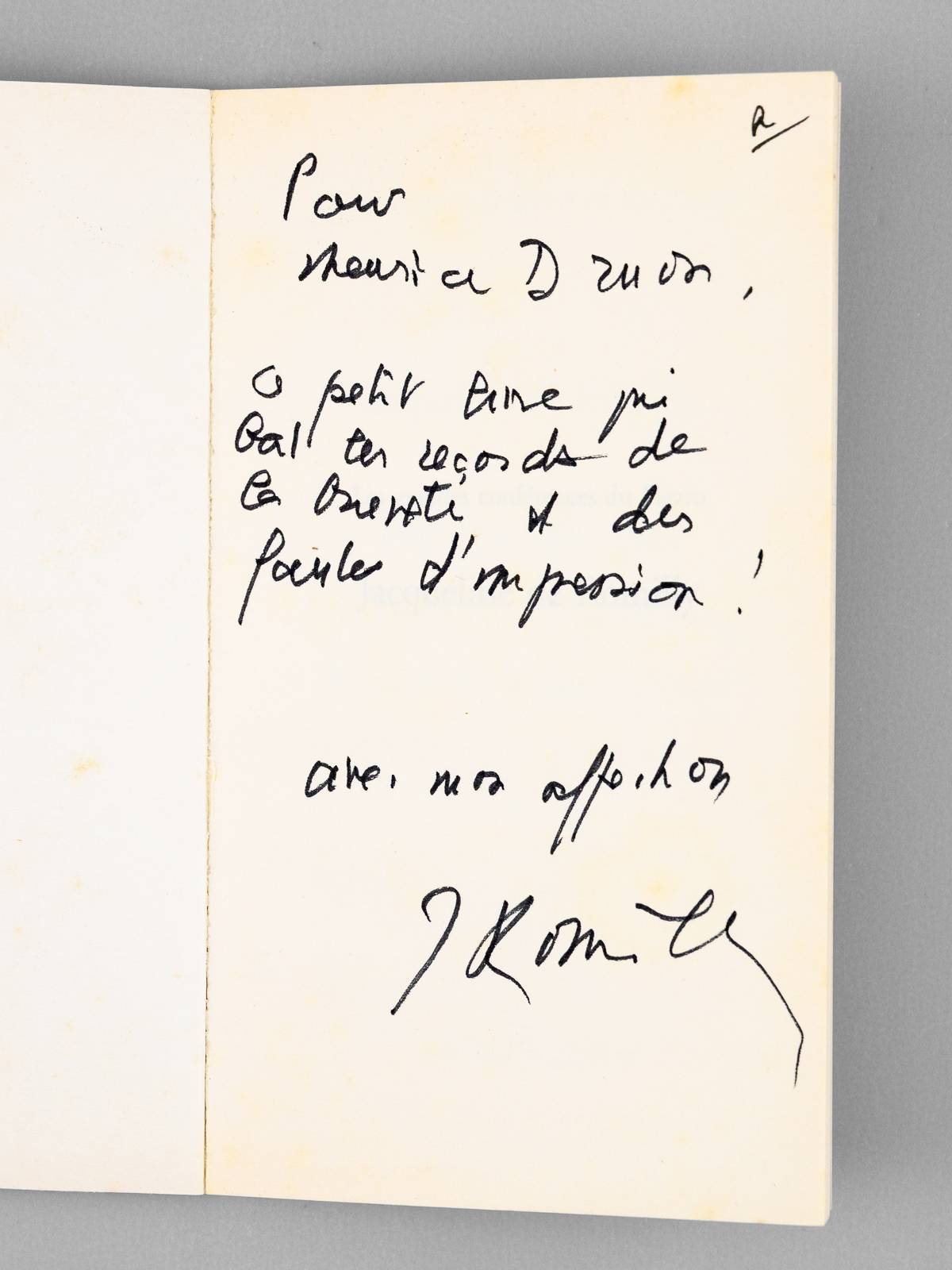 Envoi ms. de l'auteur, 1 vol. in-12 br., col. Les grandes conférences du Figaro, Editions 1, 1998, 56 pp. Commentaire : Envoi de l'auteur à l'académicien Maurice Druon : 'Pour Maurice Druon, ce peiti livre qui bat des records de bieveté et des fautes d'impression ! Avec mon affection.'. Maurice Druon (1918-2009), auteur notamment de la célèbre saga historique des Rois maudits, fut élu à l'Académie Française en 1968. Il en devint le Secrétaire Perpétuel, de 1985 à 1999. Jacqueline de Romilly, quant à elle, fut élue à l'Académie Française en 1988. Etat très satisfaisant (lég. rouss. sur tr. sup., bon état par ailleurs) pour cet exemplaire, d'une origine prestigieuse.