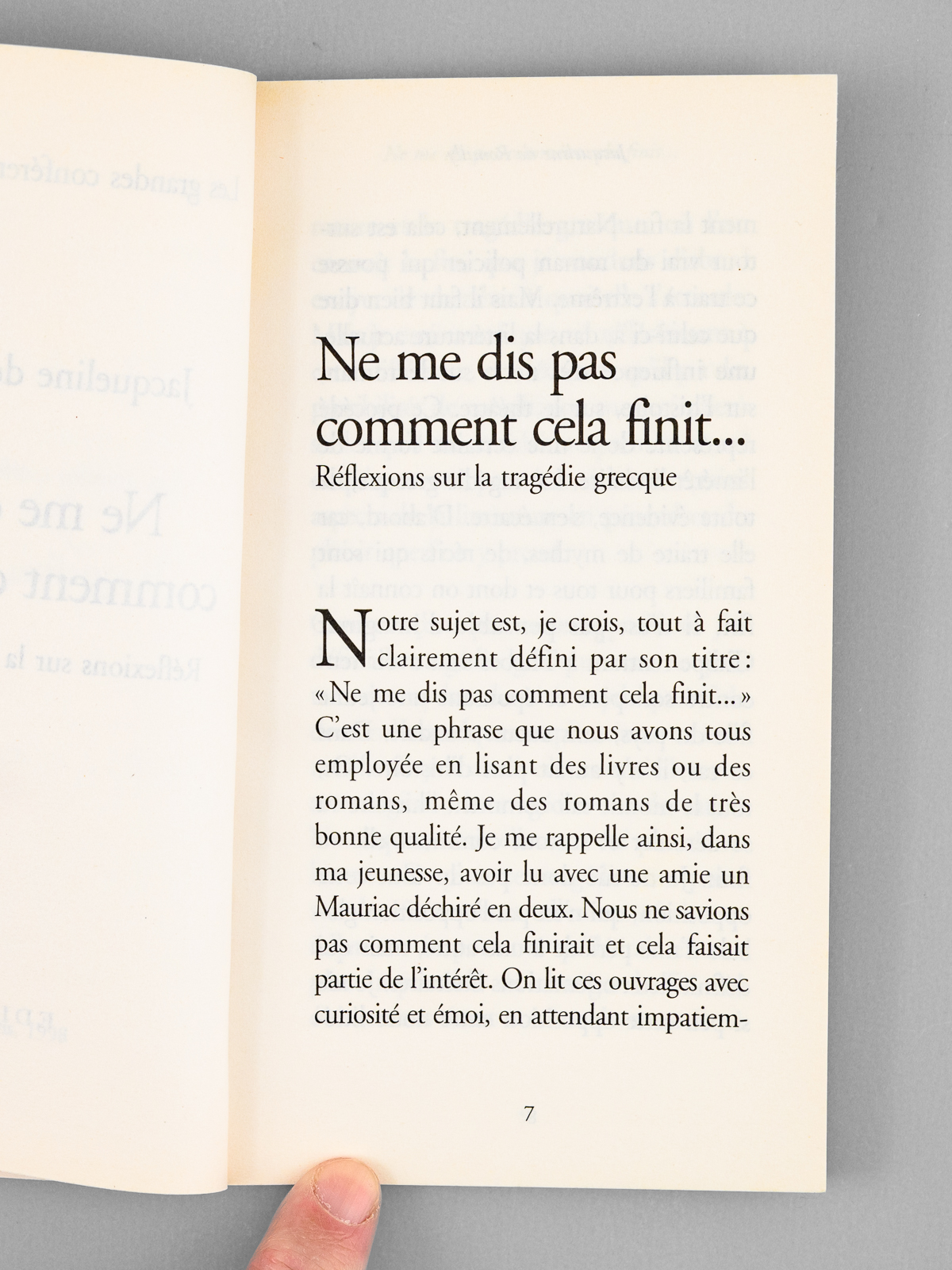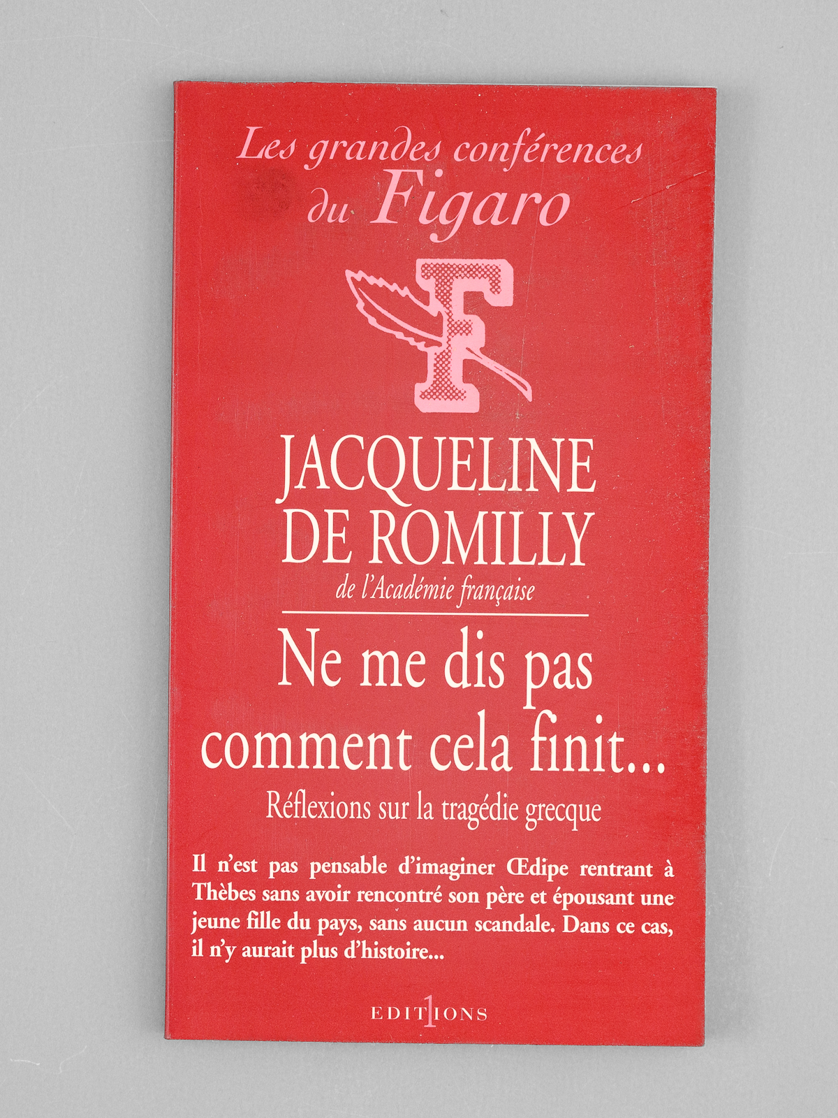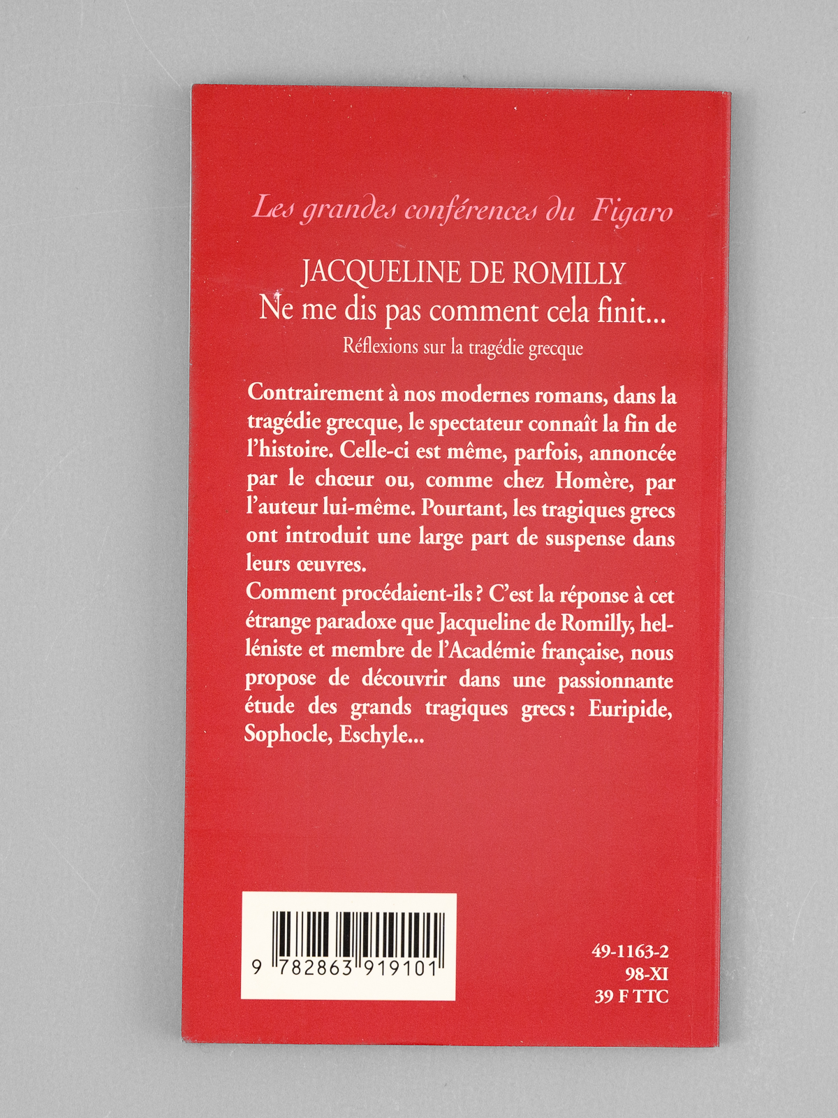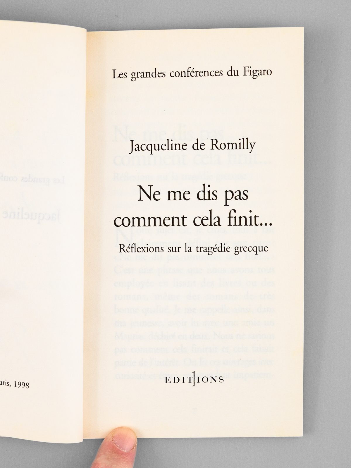 Ne me dis pas comment cela finit... Réflexions sur la tragédie grecque. [ Livre signé par l'auteur ] - Auteur: de Romilly, Jacqueline (1913-2010) ; Trédé, Monique - Année d'édition: 1998