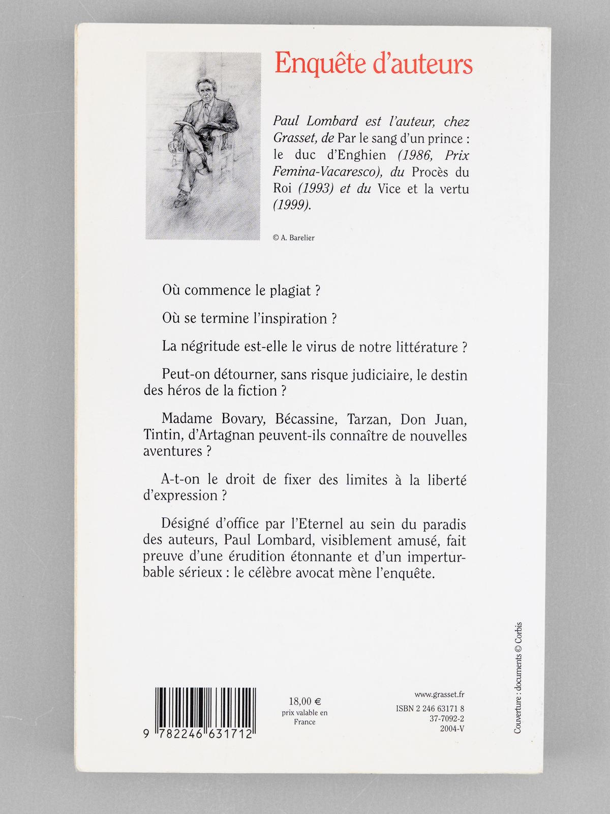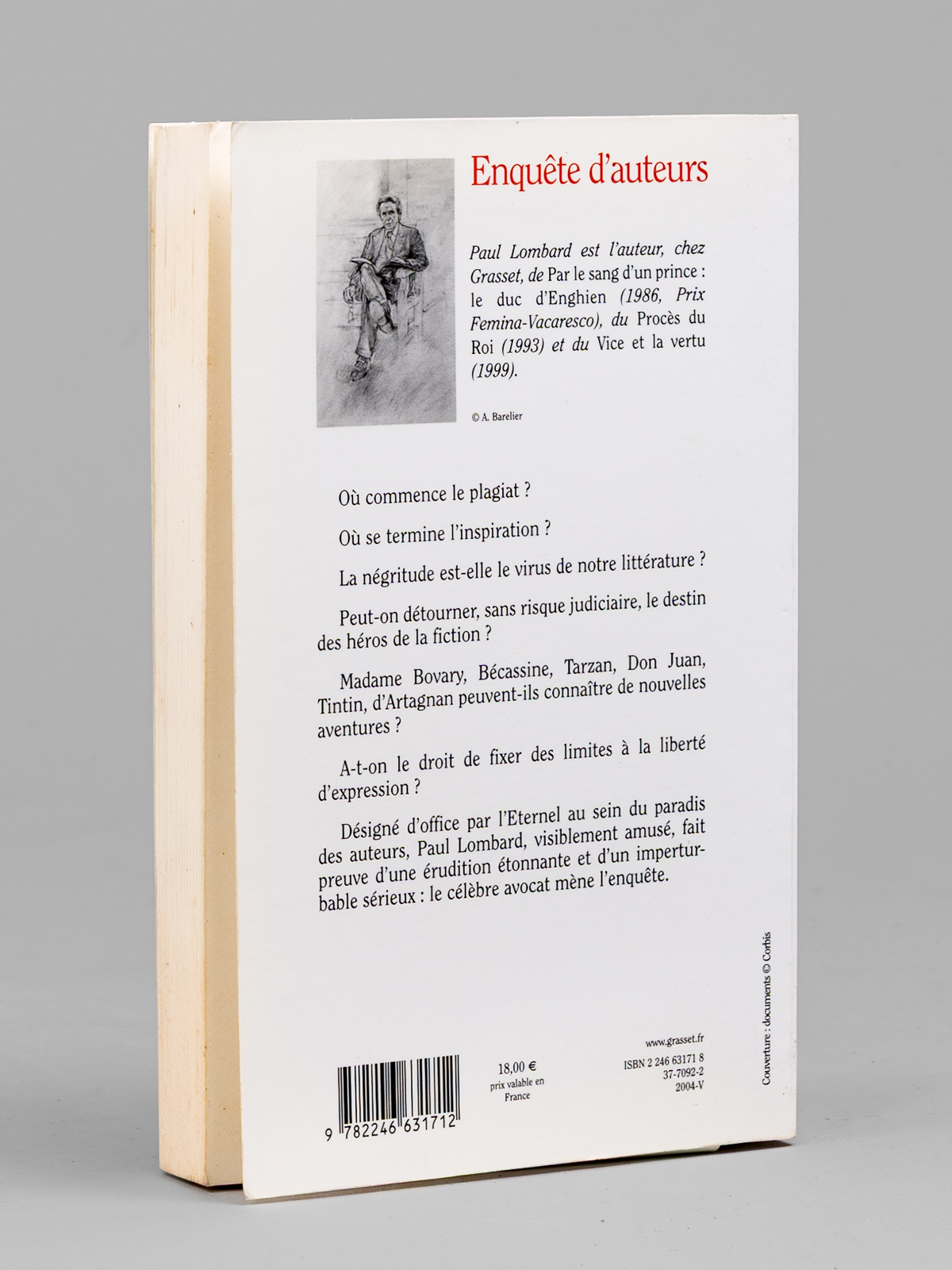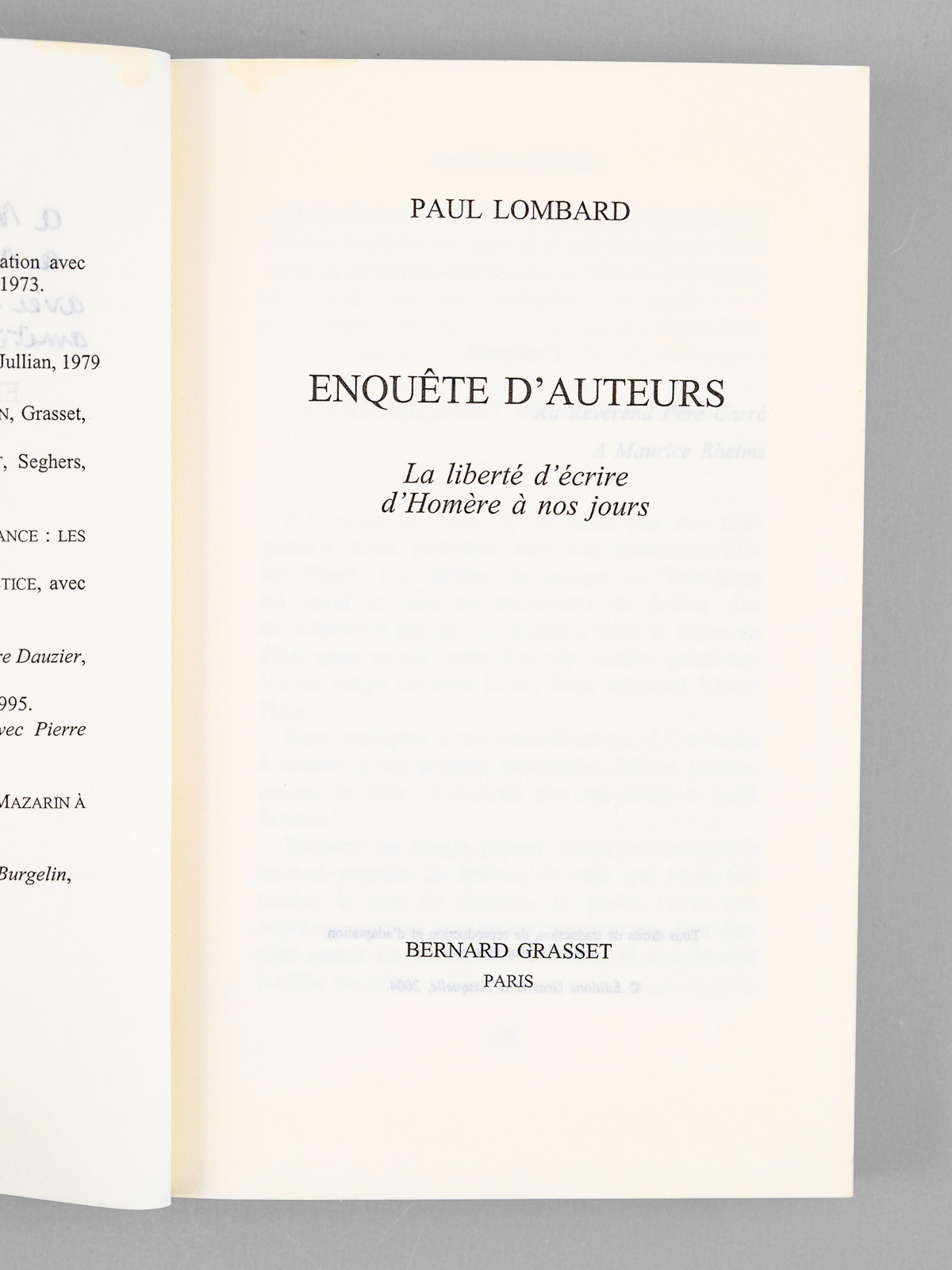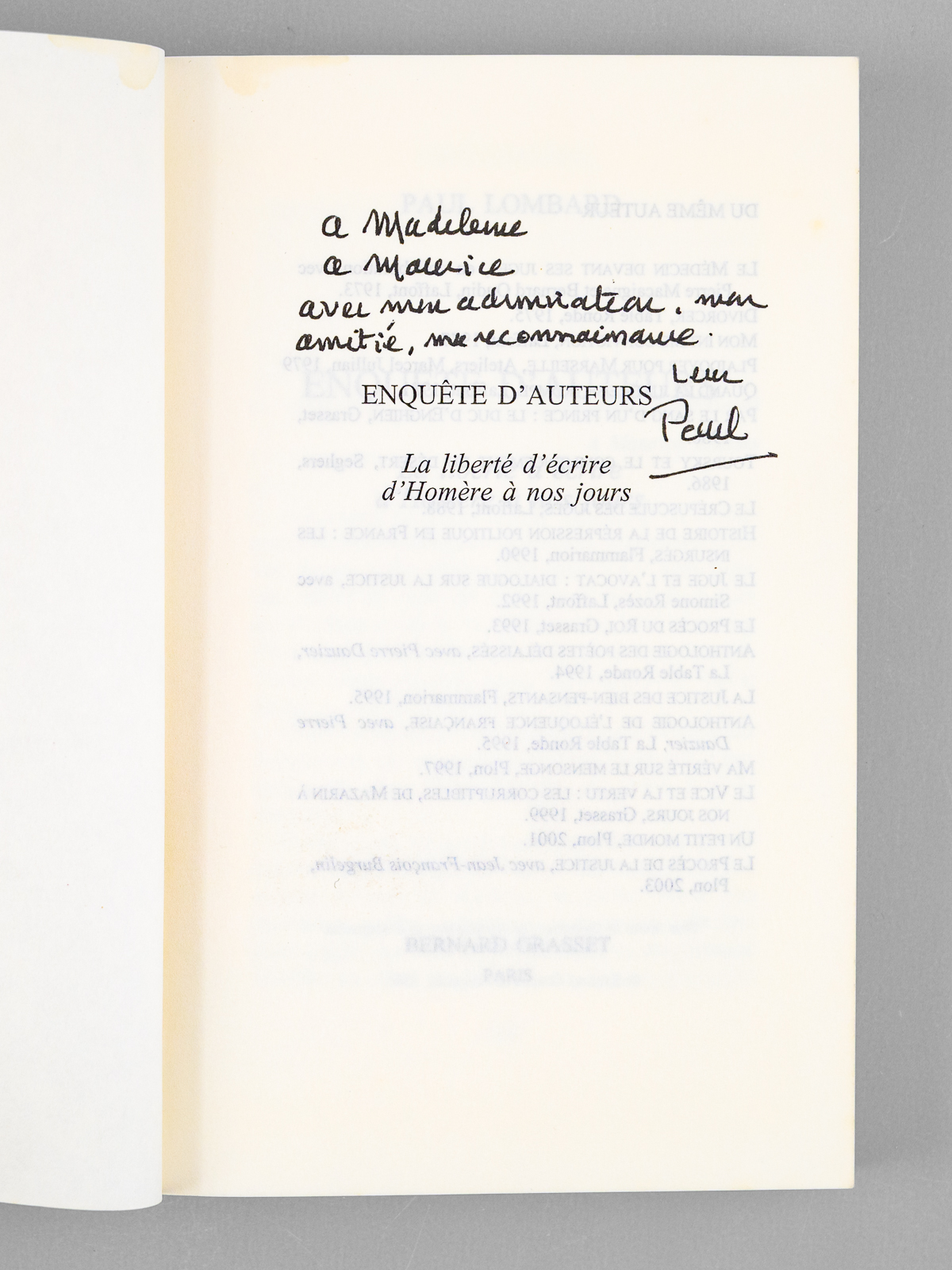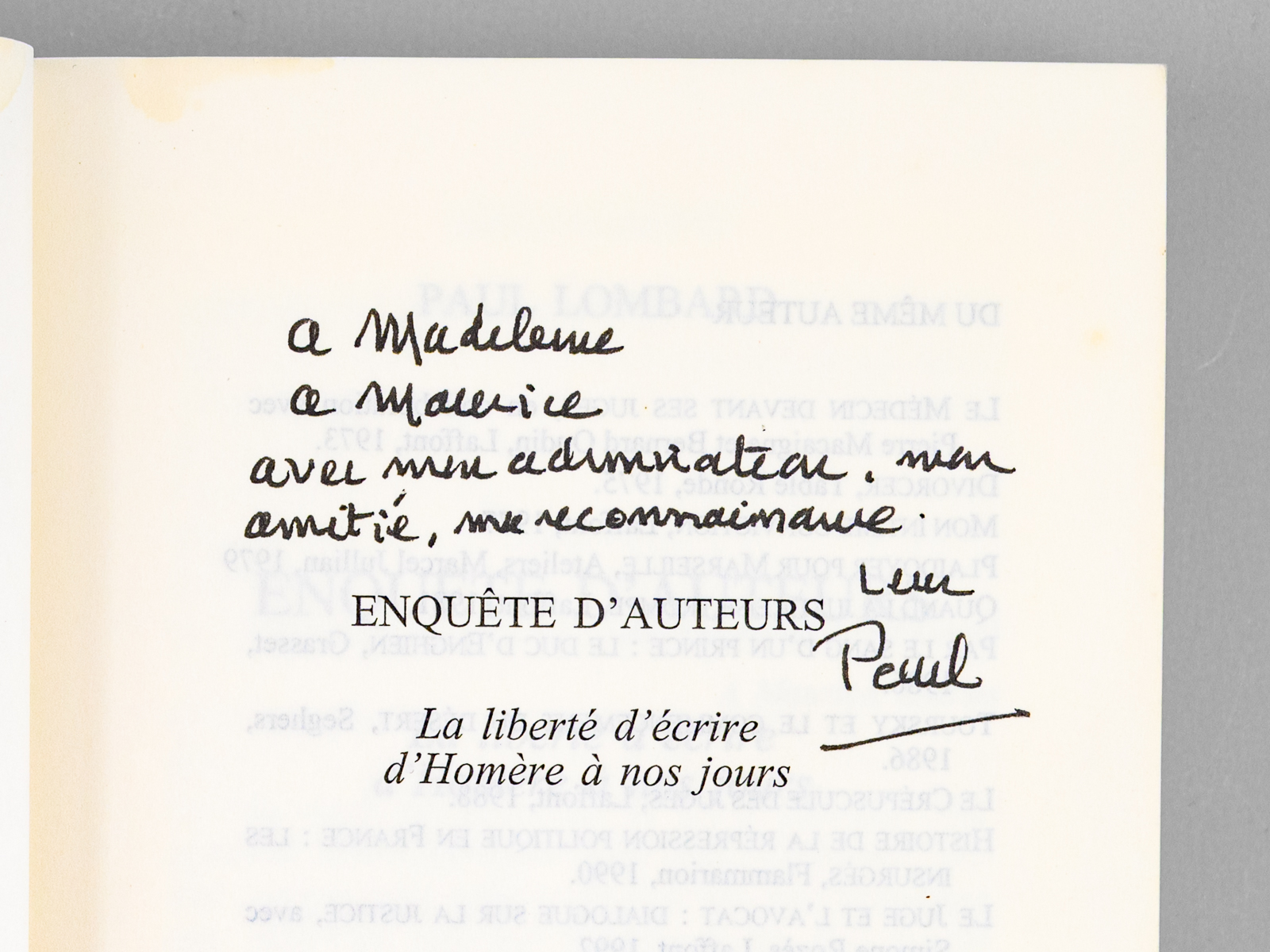 Enquête d'auteurs. La liberté d'écrire, d'Homère à nos jours [ Livre signé par l'auteur - Envoi à Maurice Druon ] - Auteur: LOMBARD, Paul (1927-2017) - Année d'édition: 2004