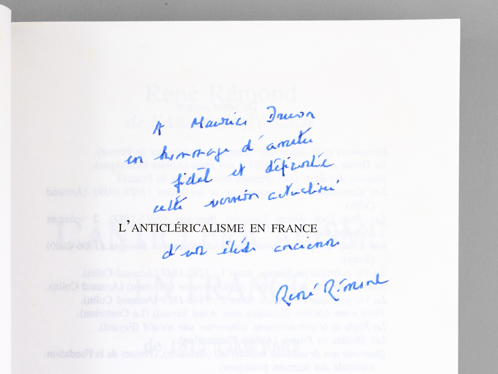 Nouelle édition revue et corrigée, Envoi ms. de l'auteur, 1 vol. in-8 br., Fayard, 1999, 420 pp. Commentaire : Bel envoi de l'auteur à Maurice Druon : 'A Maurice Druon, en hommage d'amitié fidèle et déférente, cette version actualisé d'une étude ancienne'. Etat très satisfaisant (lég. rousseurs sur tr. sup., bon état par ailleurs). L'auteur et le dédicataire furent tous deux académiciens. Maurice Druon (1918-2009), auteur notamment de la célèbre saga historique des Rois maudits, avait été élu à l'Académie Française en 1968, et en devint le secrétaire perpétuel, de 1985 à 1999. René Rémond, quant à lui, venait d'être élu (en 1998), au fauteuil de François Furet. Une belle dédicace de l'historien René Rémond, à un dédicataire prestigieux