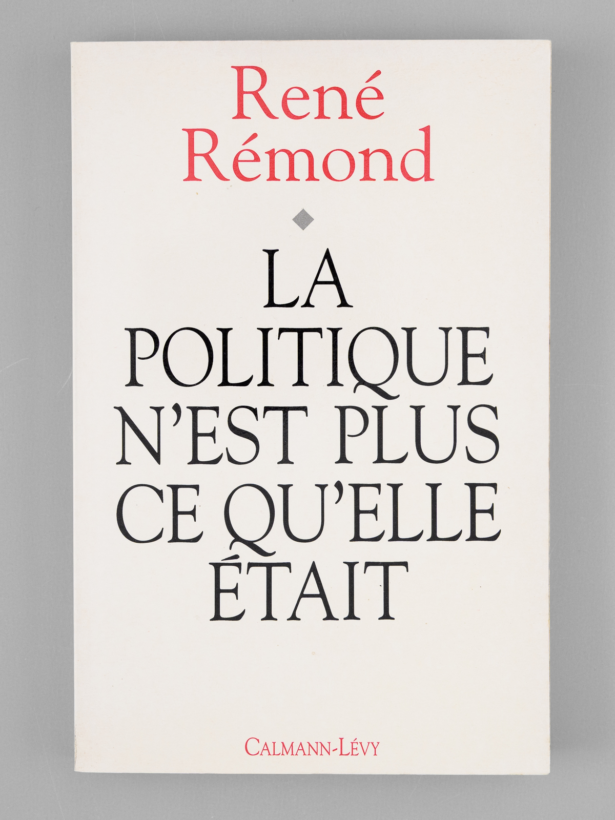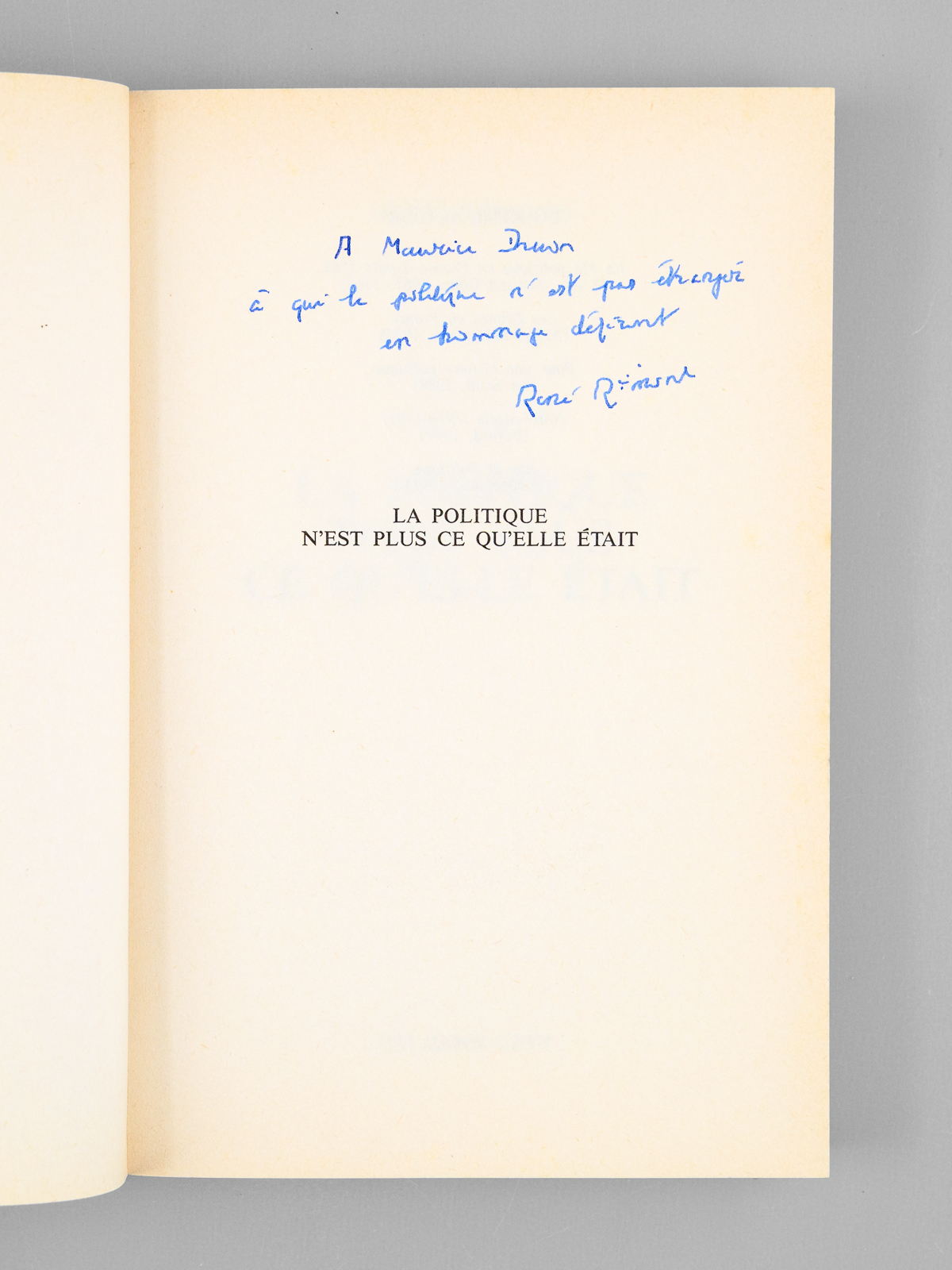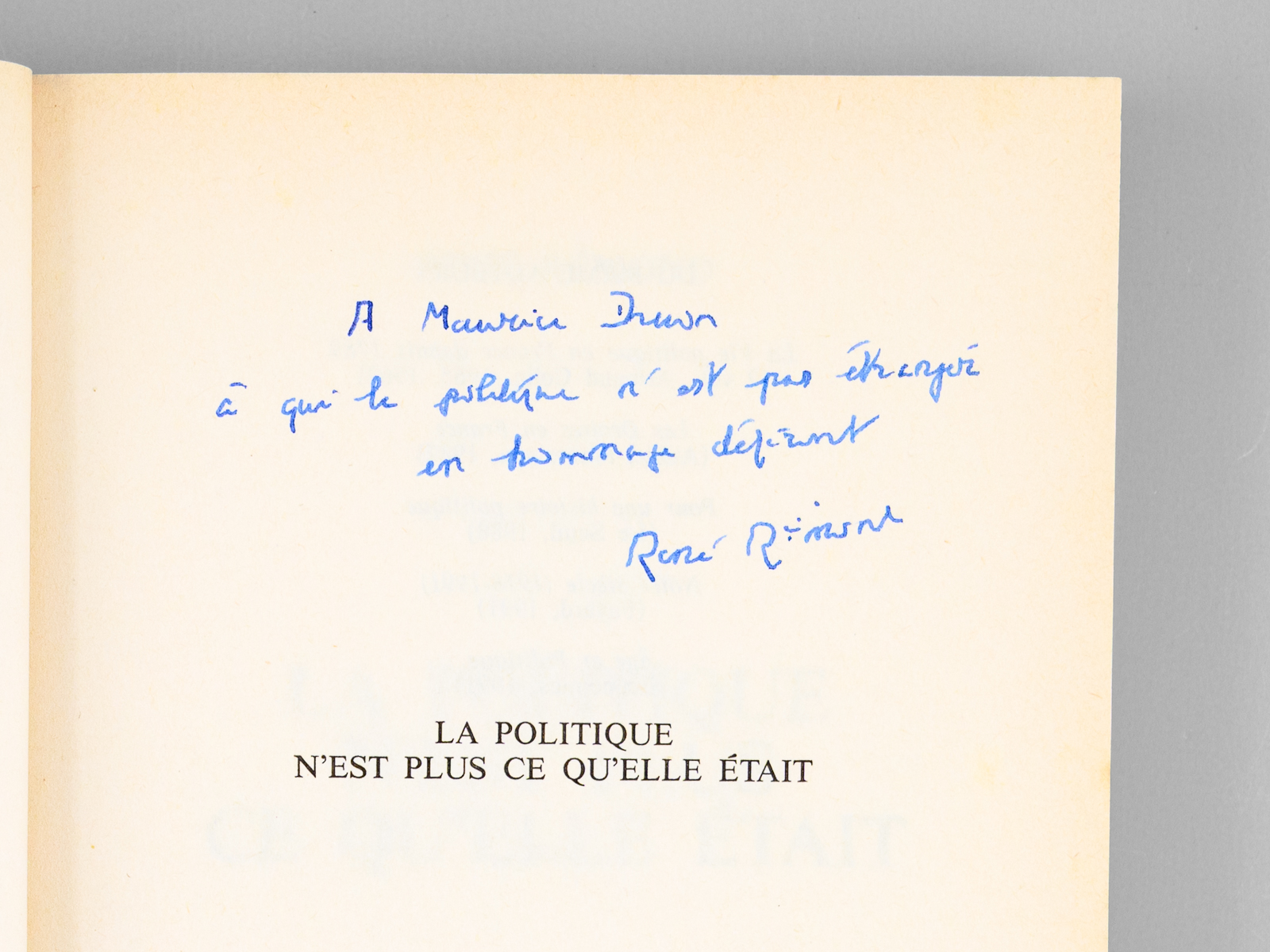 Commentaire : Bel envoi de l'auteur à Maurice Druon : 'A Maurice Druon, à qui la politique n'est pas étrangère. En hommage déférent.'. Etat très satisfaisant (lég. rousseurs sur tr. sup., bon état par ailleurs). L'auteur et le dédicataire furent tous deux académiciens. Maurice Druon (1918-2009), auteur notamment de la célèbre saga historique des Rois maudits, avait été élu à l'Académie Française en 1968, et en devint le secrétaire perpétuel, de 1985 à 1999. René Rémond, quant à lui, sera élu en 1998, au fauteuil de François Furet. Une belle dédicace de l'historien René Rémond, à un dédicataire prestigieux