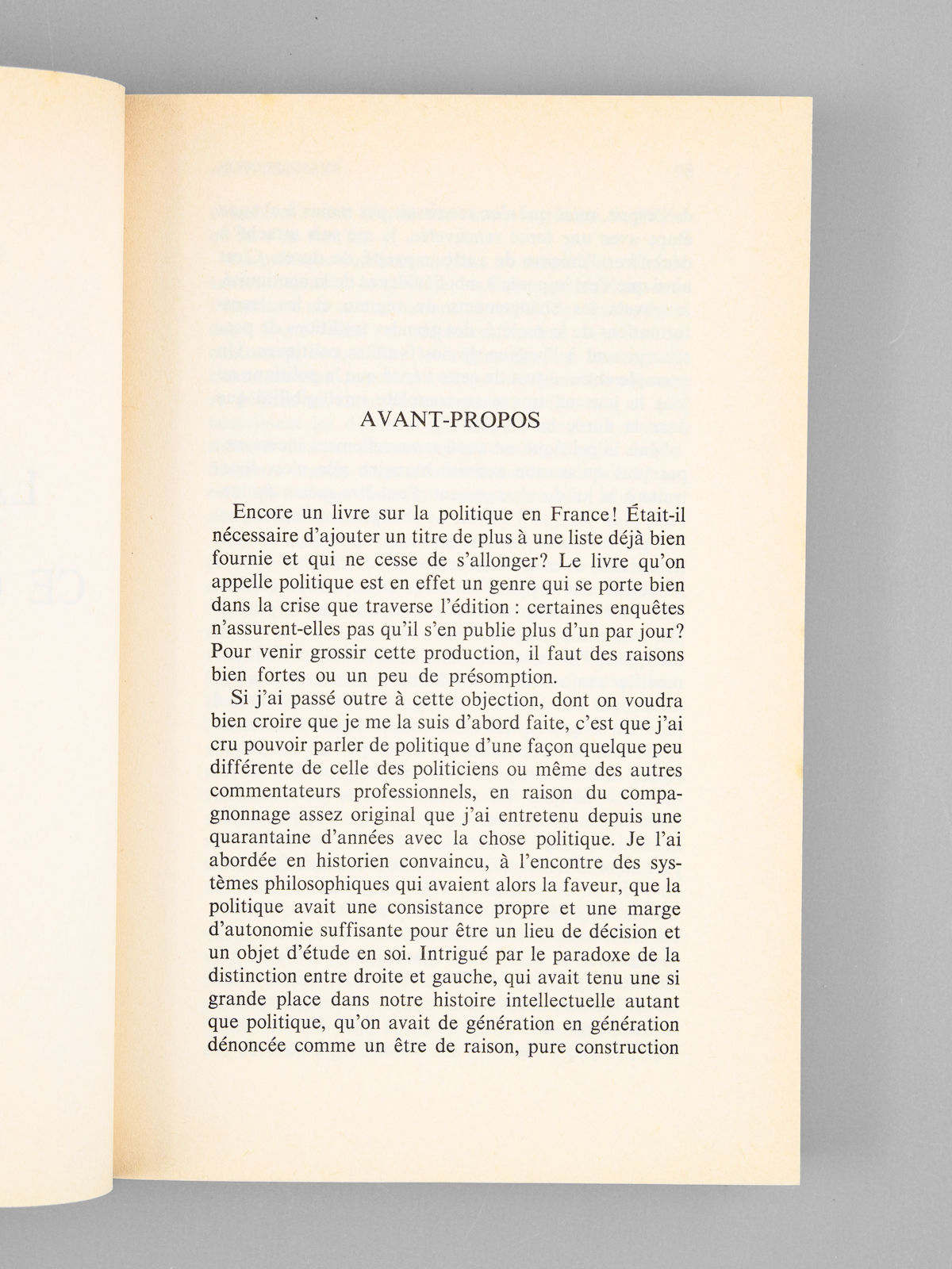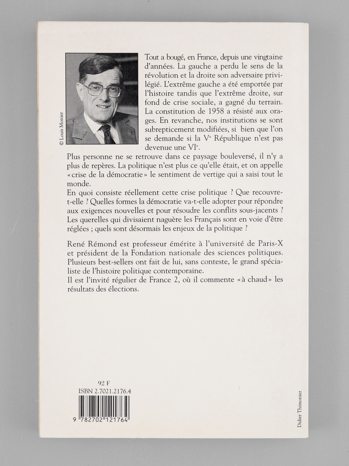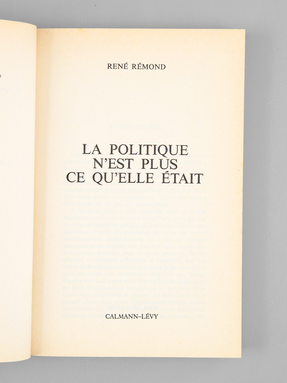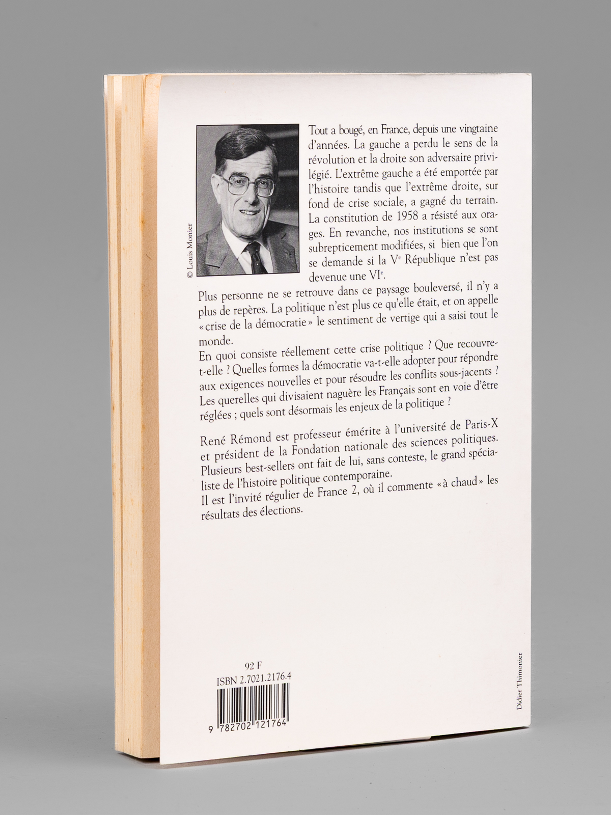 Commentaire : Bel envoi de l'auteur à Maurice Druon : 'A Maurice Druon, à qui la politique n'est pas étrangère. En hommage déférent.'. Etat très satisfaisant (lég. rousseurs sur tr. sup., bon état par ailleurs). L'auteur et le dédicataire furent tous deux académiciens. Maurice Druon (1918-2009), auteur notamment de la célèbre saga historique des Rois maudits, avait été élu à l'Académie Française en 1968, et en devint le secrétaire perpétuel, de 1985 à 1999. René Rémond, quant à lui, sera élu en 1998, au fauteuil de François Furet. Une belle dédicace de l'historien René Rémond, à un dédicataire prestigieux