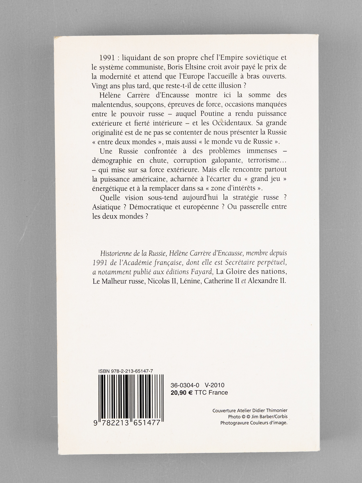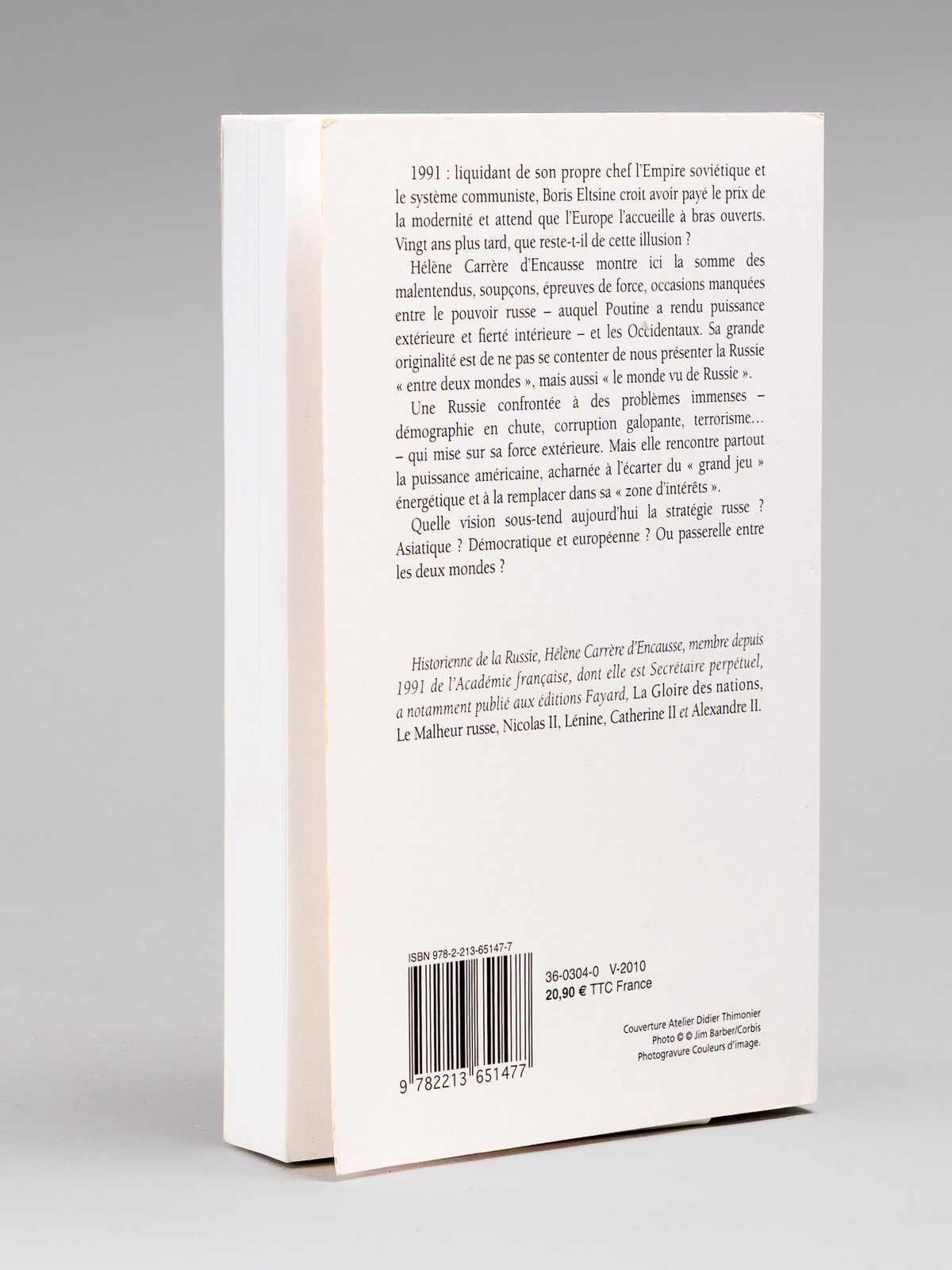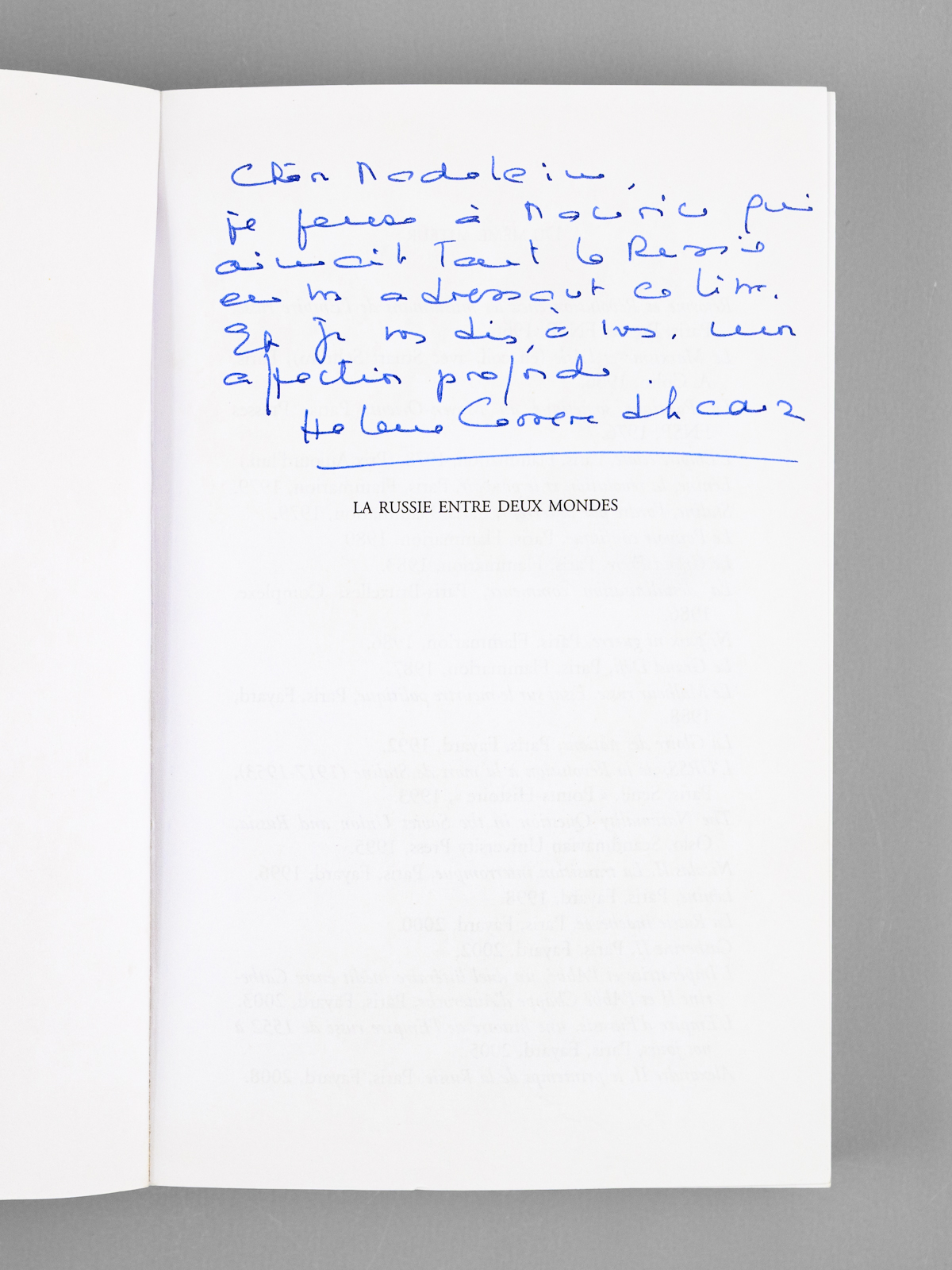 Commentaire : Dédicace de l'auteur à la veuve de l'académicien Maurice Druon (1918-2009), qui était lui-même d'ascendance russe (il était neveu de Joseph Kessel) : 'Chère Madeleine, je pense à Maurice qui aimait tant la Russie, en vous adressant ce livre. Et je vous dis, à vous, ma profonde affection.' Maurice Druon, auteur notamment de la célèbre saga historique des Rois maudits, fut élu à l'Académie Française en 1968. Il en devint le Secrétaire Perpétuel, de 1985 à 1999. Hélène Carrère d'Encausse, élue à l'Académie en 1990, remplaça Maurice Druon à la tête de cette institution. Bon état.