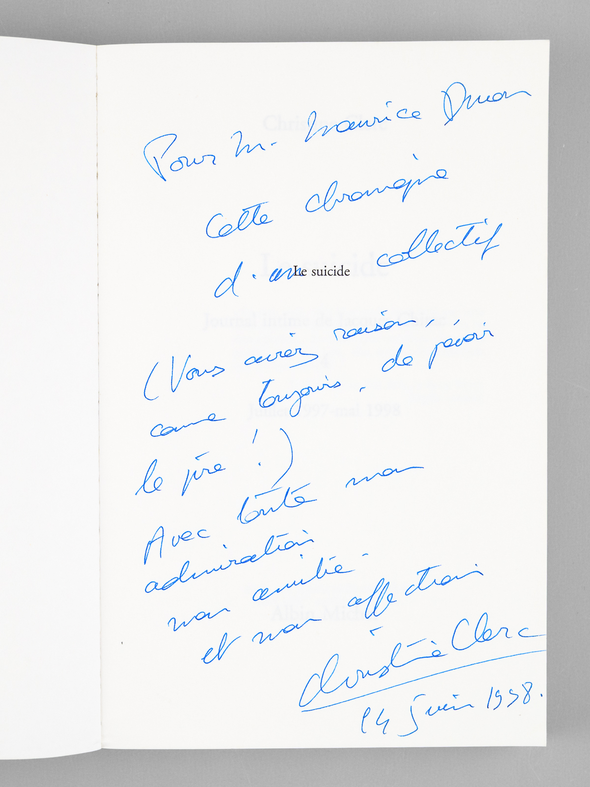 1 vol. in-8 br., Albin Michel, Paris, 1998, 284 pp. Commentaire : Bel envoi de Christine Clerc 'Pour M. Maurice Druon, cette chronique d'un 'suicide' collectif (vous aviez raison, comme toujours, de prévoir le pire !) [ ... ]'. On joint une carte autographe signée de l'auteur. Bon état. De la bibliothèque de Maurice Druon, Secrétaire Perpétuel de l'Académie Française de 1985 à 1999, qui a, comme à son habitude, replié l'angle de certains feuillets dont les passages avaient plus particulièrement retenu son attention.