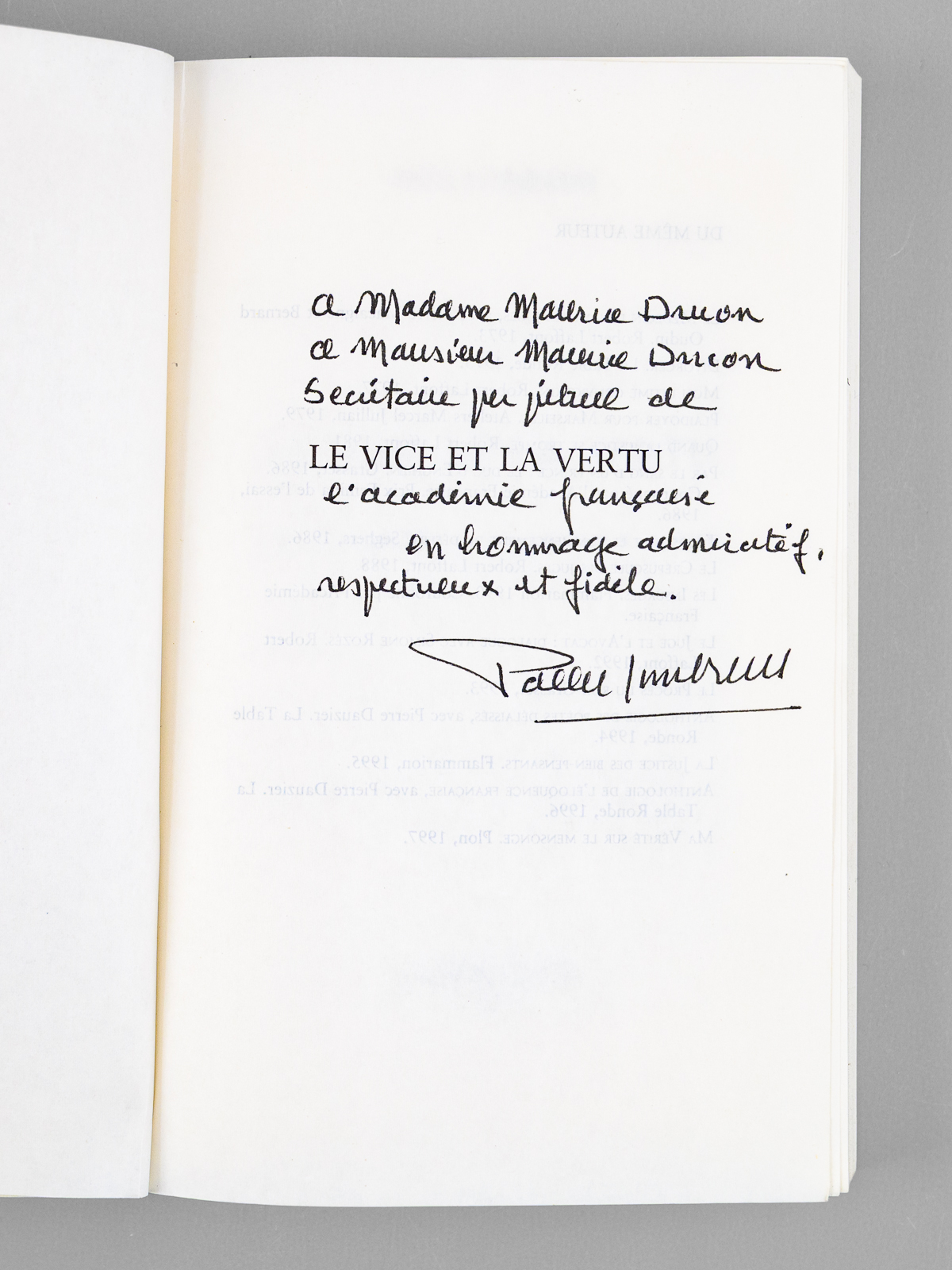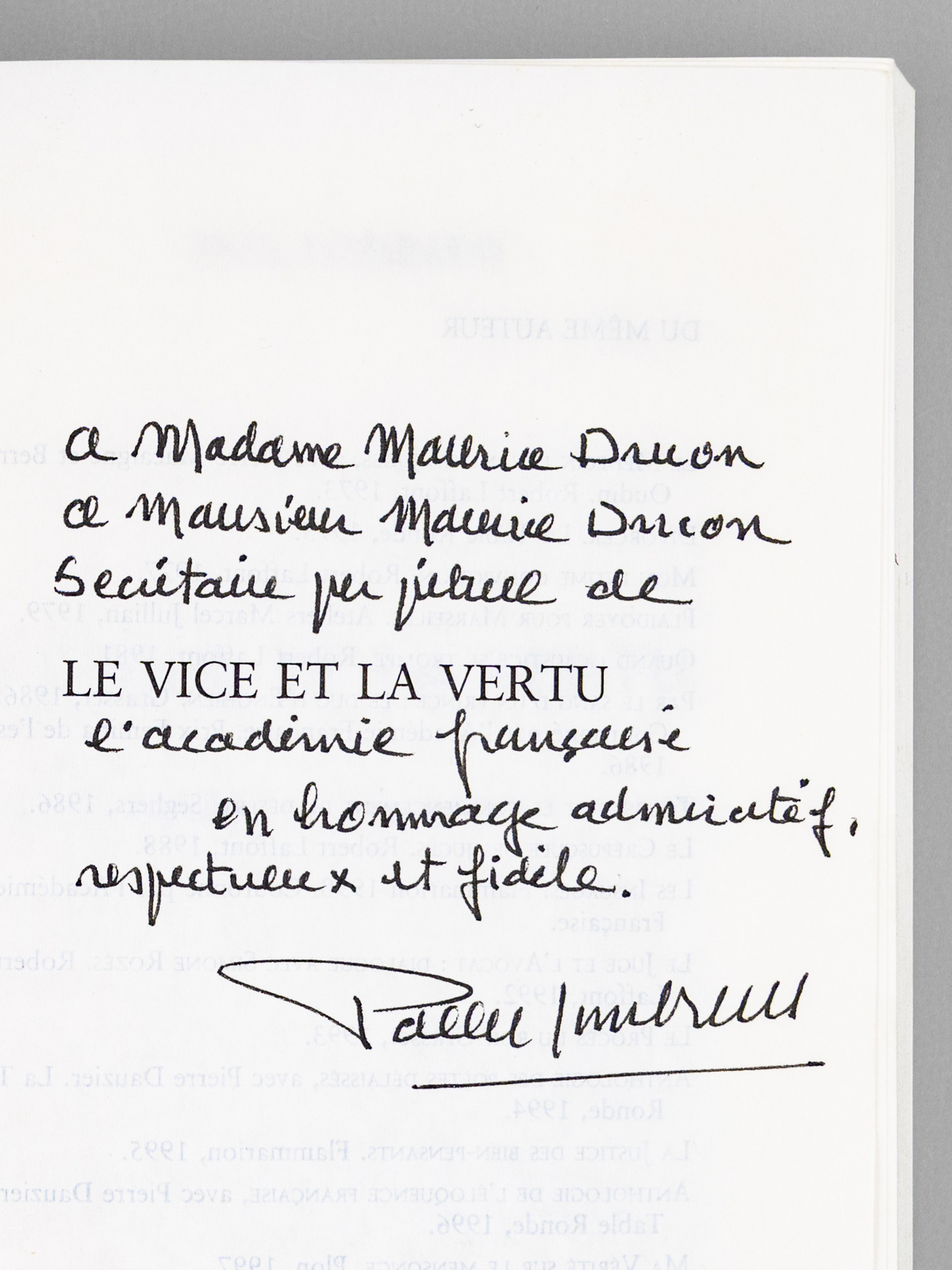 Envoi ms. de l'auteur, 1 vol. in-8 br., Grasset, 1999, 341 pp. Commentaire : Envoi de l'auteur à Maurice Druon et à son épouse : 'A Madame Maurice Druon, à Monsieur Maurice Druon, Secrétaire perpétuel de l'Académie Française. En hommage admiratif, respectueux et fidèle.' Bon état. Le dédicataire, Maurice Druon (1918-2009), était notamment l'auteur de la célèbre saga historique des Rois maudits. Elu à l'Académie Française en 1968, il en devint le secrétaire perpétuel, de 1985 à 1999.