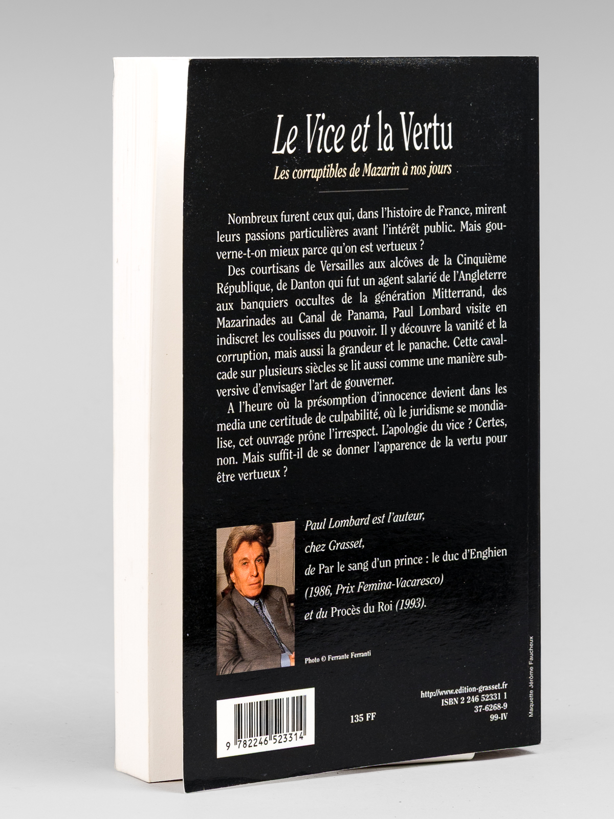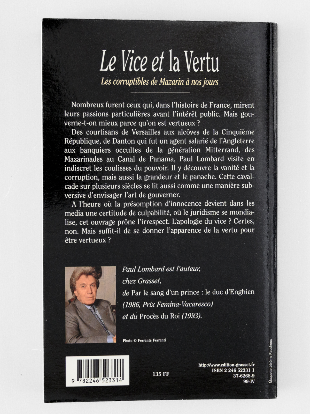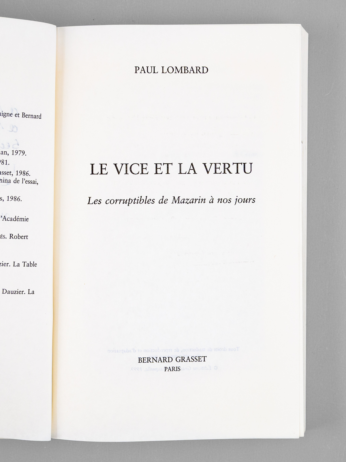 Le Vice et la Vertu. Les corruptibles de Mazarin à nos jours. [ Livre signé par l'auteur - Envoi à Maurice Druon ] - Auteur: LOMBARD, Paul (1927-2017) - Année d'édition: 1999