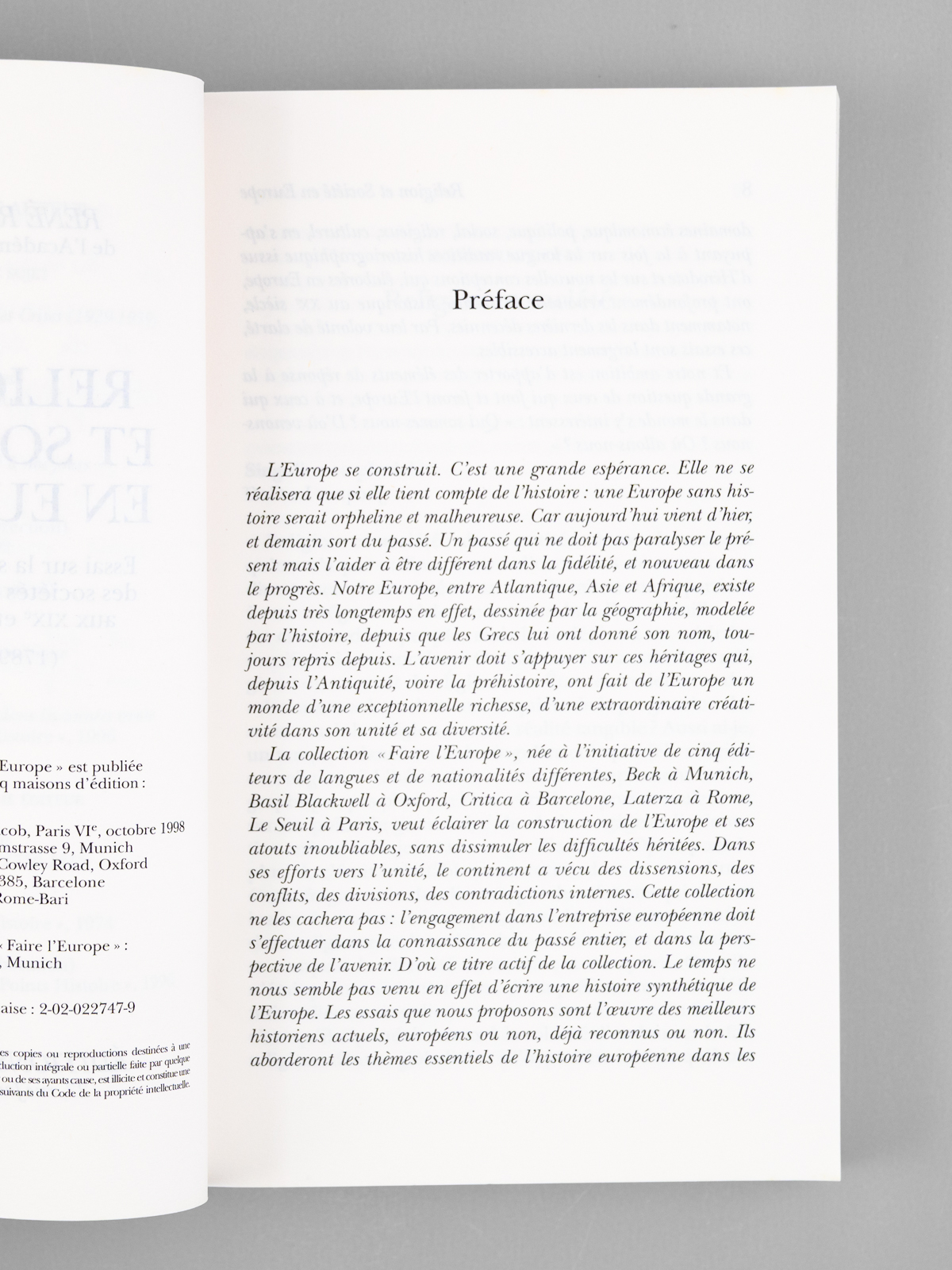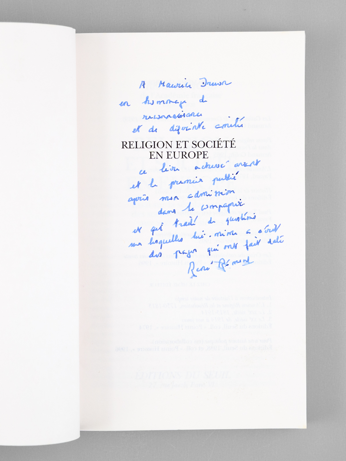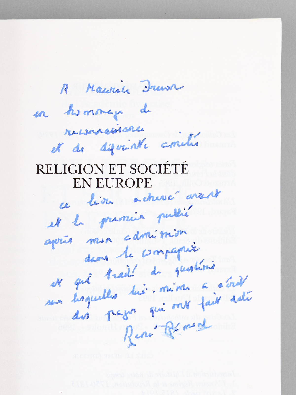 Envoi ms. de l'auteur, 1 vol. in-8 br., coll. Faire l'Europe, éditions du Seuil, 1998,307 pp. Commentaire : Bel envoi de l'auteur à Maurice Druon : 'A Maurice Druon, en hommage de reconnaissance et de déférente amitié. Ce livre achevé avant, et le premier publié après, mon admission dans la compagnie, et qui traite de questions sur lesquelles lui-même a écrit des pages qui ont fait date.'. L'auteur et le dédicataire étaient tous deux académiciens. Maurice Druon (1918-2009), auteur notamment de la célèbre saga historique des Rois maudits, avait été élu à l'Académie Française en 1968, et en devint le secrétaire perpétuel, de 1985 à 1999. René Rémond, quant à lui, avait venait d'être juste d'élu, au fauteuil de François Furet. Une belle dédicace de l'historien René Rémond, à un dédicataire prestigieux