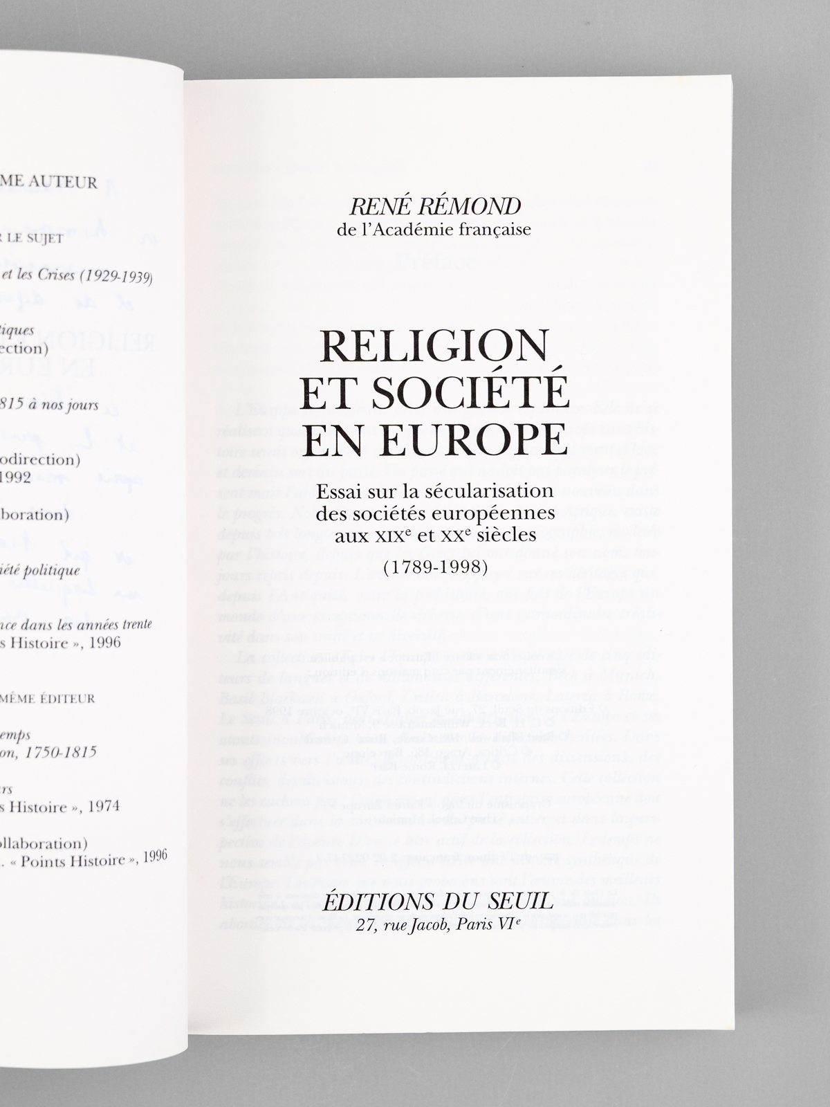 Religion et société en Europe. La sécularisation en Europe [ Livre signé par l'auteur - Envoi à Maurice Druon ] - Auteur: Rémond, René (1918-2007) - Année d'édition: 1998