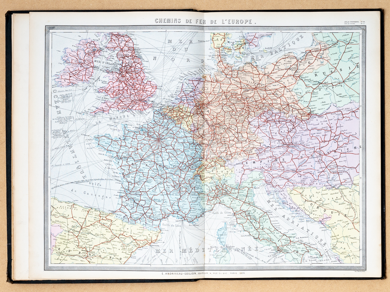 1 vol. in-folio reliure demi-chagrin noir, Andriveau-Goujon, s.d. [ circa 1876 ], 2 ff. et 32 grandes cartes doubles en couleurs Commentaire : Etat très satisfaisant (la carte 11 manquante a été rajoutée par une carte d'un autre exemplaire bruni et imprimé sur papier de moindre qualité, petits accrocs à 2 cartes en marge intérieure, qq. cartes d'autres atlas contrecollées au verso des cartes, rel. un peu frottée, bon état et belle fraîcheur intérieure par ailleurs) pour ce bel atlas imprimé sur beau papier.