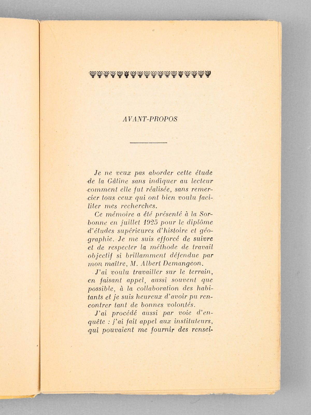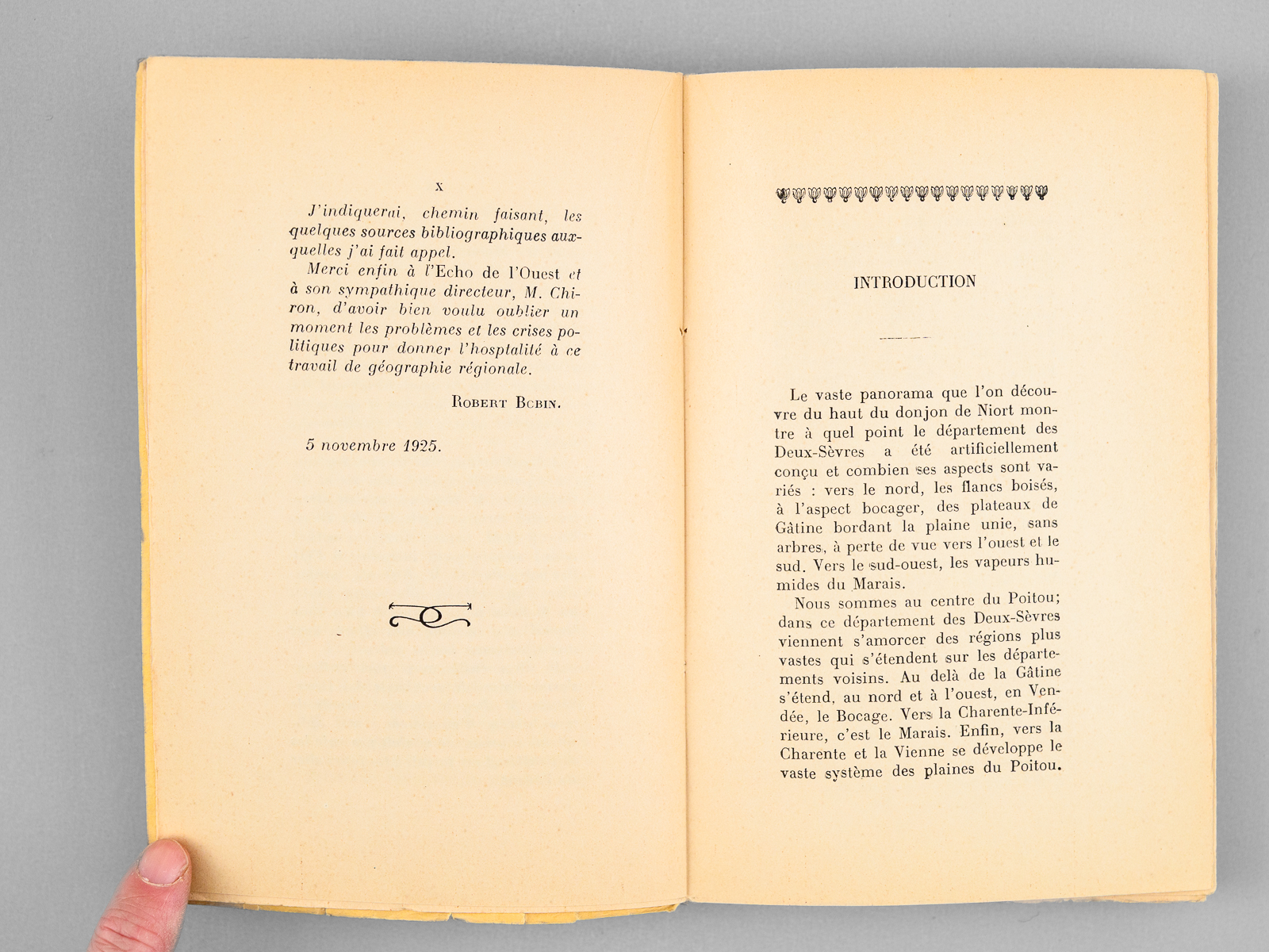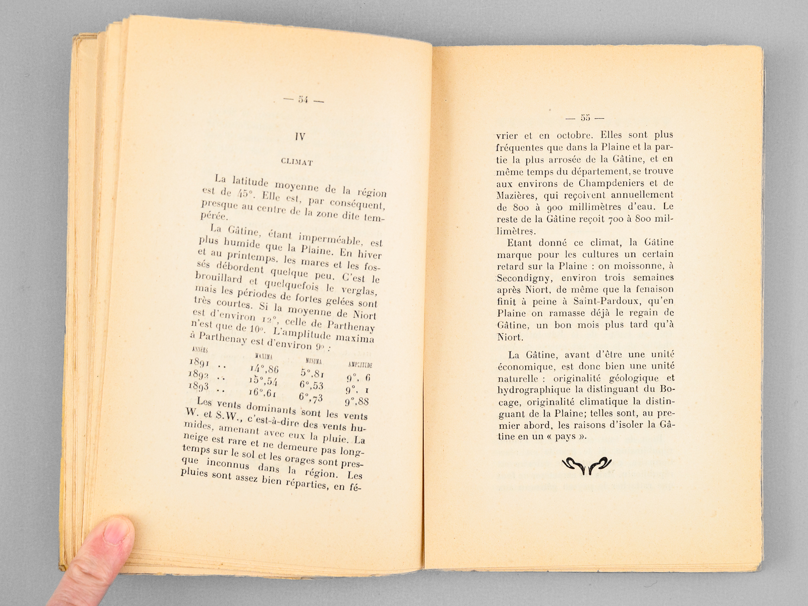 Commentaire : Bon état pour ce livre consacré à la Gâtine vendéenne. Il s'agit du mémoire présenté par l'auteur en 1925 à la Sorbonne, pour son diplôme d'études supérieures d'histoire et géographie. Peu courant, particulièrement avec un envoi de l'auteur.