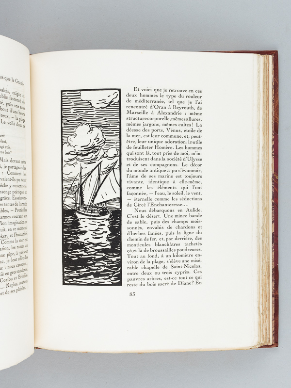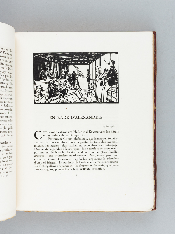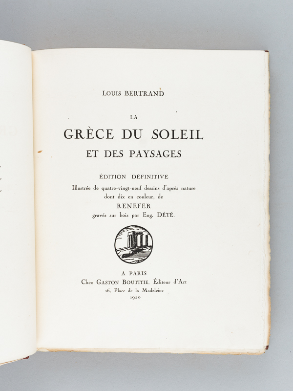 Edition définitive; illustrée de quatre-vingt-neuf dessin d'après nature dont dix en couleur, de Renefer, gravés sur bois par Eug. Dété, Un des 225 exemplaires sur vélin d'Arches numérotés (n° 237), 1 vol. in-4 reliure demi-veau à coins brun raciné, dos à 5 nerfs, couvertures et dos conservés, tête dorée, Chez Gaston Boutitie, 1920, XVIII-184 pp. Commentaire : Bon état (deux nerfs très lég. frottés, dos lég. passé, très bon état par ailleurs) pour ce très bel ouvrage, bien complet des 10 superbes hors texte en couleurs par Raymond Renefer. Louis Bertrand (1866-1941), professeur agrégé, qui enseigna notamment au lycée d'Alger, était passionné par l'Orient. Il fut élu à l'Académie Française en 1925.
