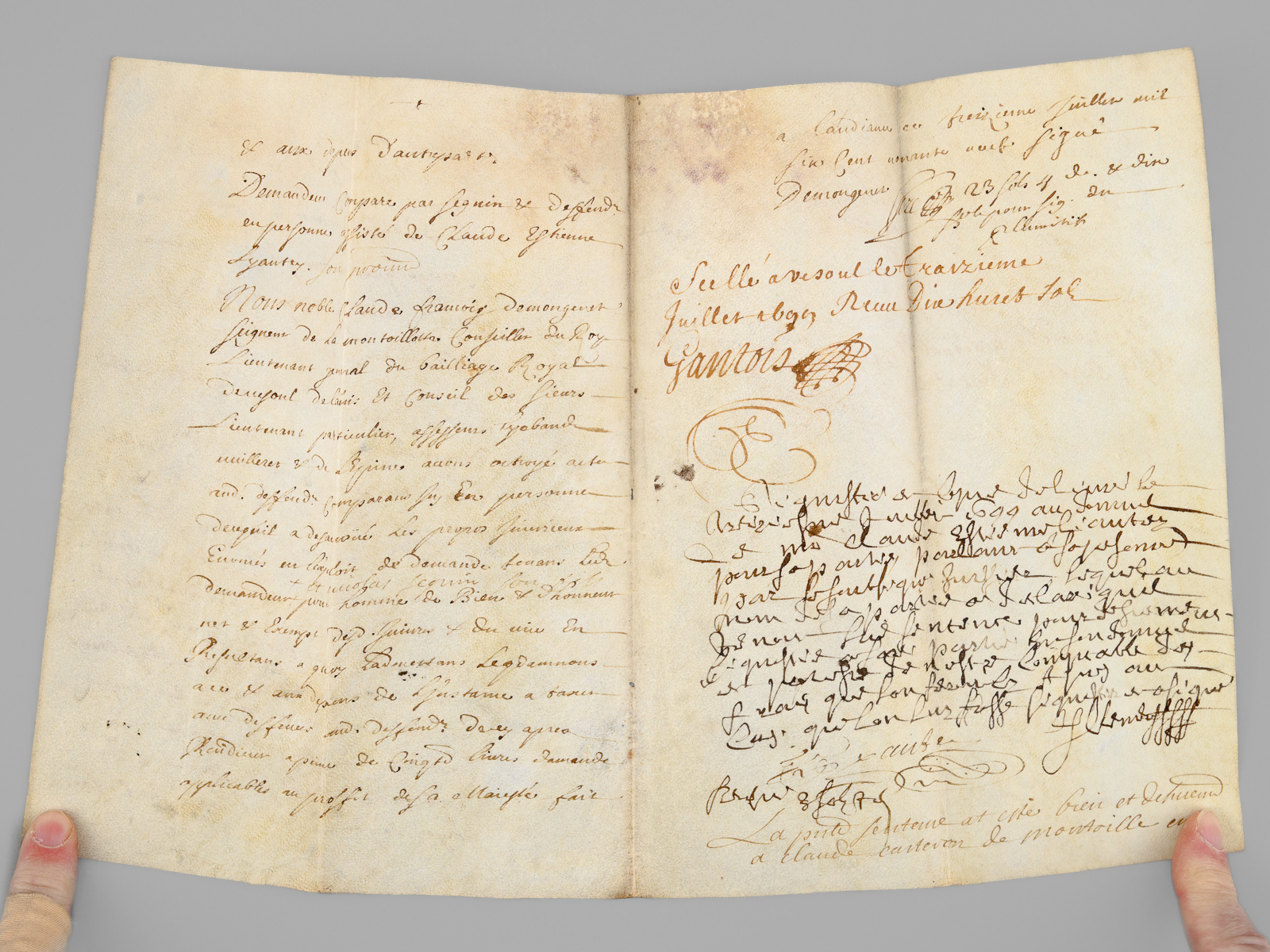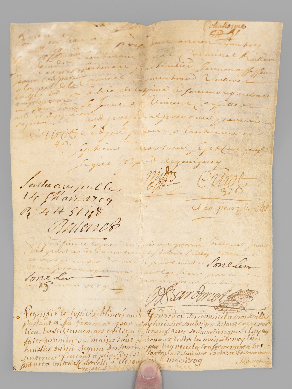 3 actes sur vélin de 2 ff., [ Acte judiciaire condamnant au dépens suite aux poursuites pour injures, Vesoul, juillet 1699 : ] 'Extrait des Registres du greffe du Bailliage Royal de Vesoul. Le Bailly d'Amont au Comté de Bourgogne à tous ceux qui ces présentes verront salut, savoir faisons qu'en la cause pendante audit Bailliage. Entre Claude Carteron de Montoille, défendeur d'une part. Et Sieur Jean Seguin de Vaivre, en la qualité qu'il agit demandeur aux fins de son exploit du septième juillet mil six cent nonante neuf contrôlé le neuf, par lequel il a conclu à ce que ledit défendeur vienne déclarer qu'il tient Nicolas Seguin fils dudit demandeur, né et exempt de vice résultant des injures mentionnées audit exploit, qu'il juge pour l'amende honorable et pour la profitable à ce qu'il soit condamné à lui payer la somme de mil livres sauf taxe [ etc......] » [ Avec un second acte joint daté de 1709, demande de recouvrement de créance ]