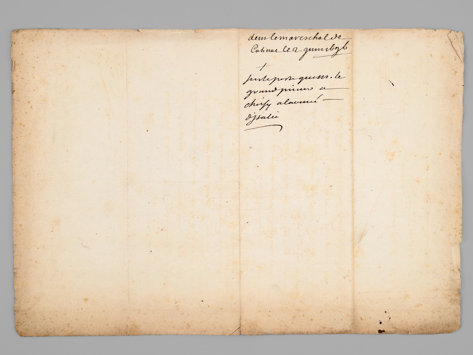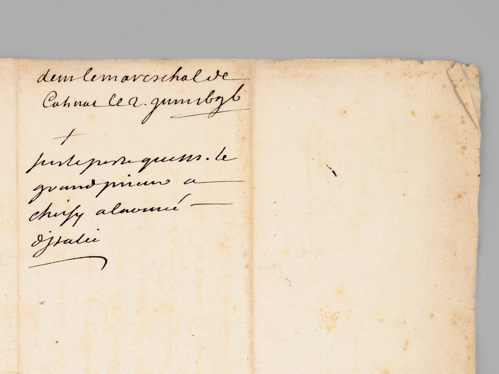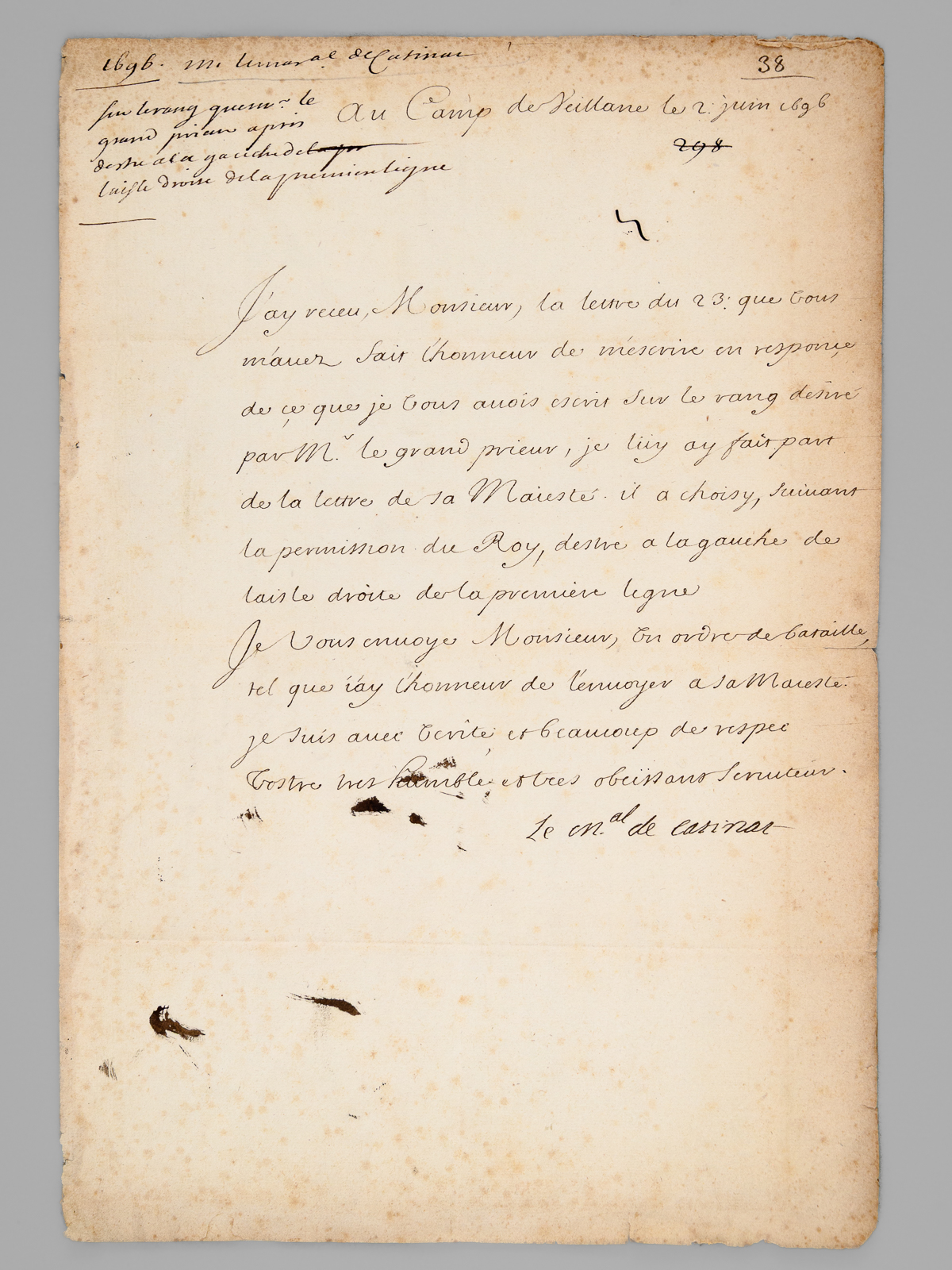 Feuillet double in-4 (34 x 23 cm), filigrane couronnée à la grappe de raison, initiales P. E. F. V. : [ Lettre autographe signée du Maréchal de Catinat, daté du Camp de Veillane, le 2 juin, 1696, 'sur le rang que le Grand Prieur', Philippe de Bourbon 'a choisy à l'armée d'Italie' ] 'J'ay receu, Monsieur, la lettre du 23: que vous m'avez fait l'honneur de m'escrire en responce de ce que je vous avois escrit sur le rang désiré par Mr. le grand prieur, je luy ay fait part de la lettre de sa Majesté. Il a choisy, suivant la permission du Roy, d'estre a la gauche de l'aisle droite de la premiere ligne. Je vous envoye Monsieur, cet ordre de bataille tel que j'ay l'honneur de l'envoyer a sa Majesté. Je suis avec verité et beaucoup de respect votre très humble et très obéissant serviteur' [ Signé : ] Le M[aréch]al de Catinat' et au verso : 'de M. le mareschal de Catinat le 2. juin 1696', 'sur le rang que le grand prieur a choisy à l'armée d'Italie'.