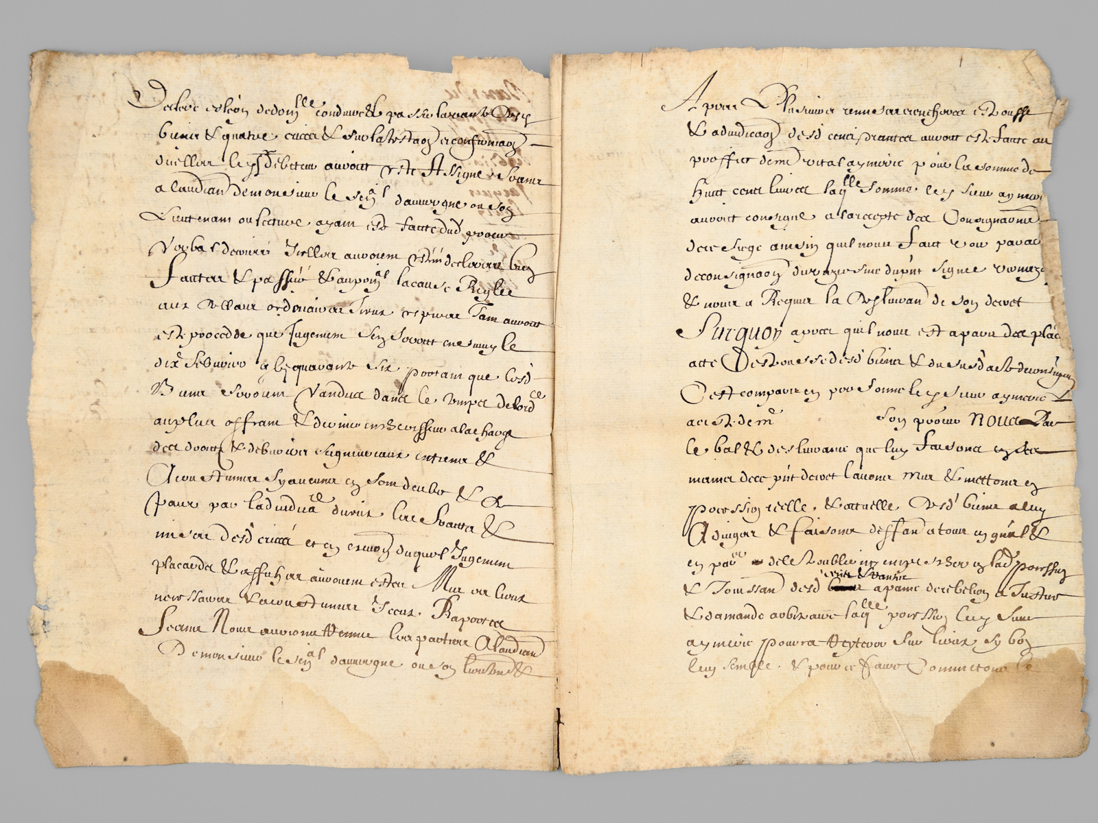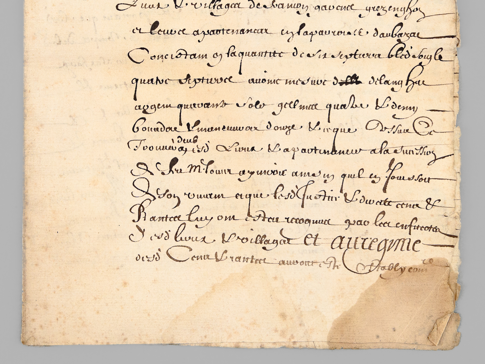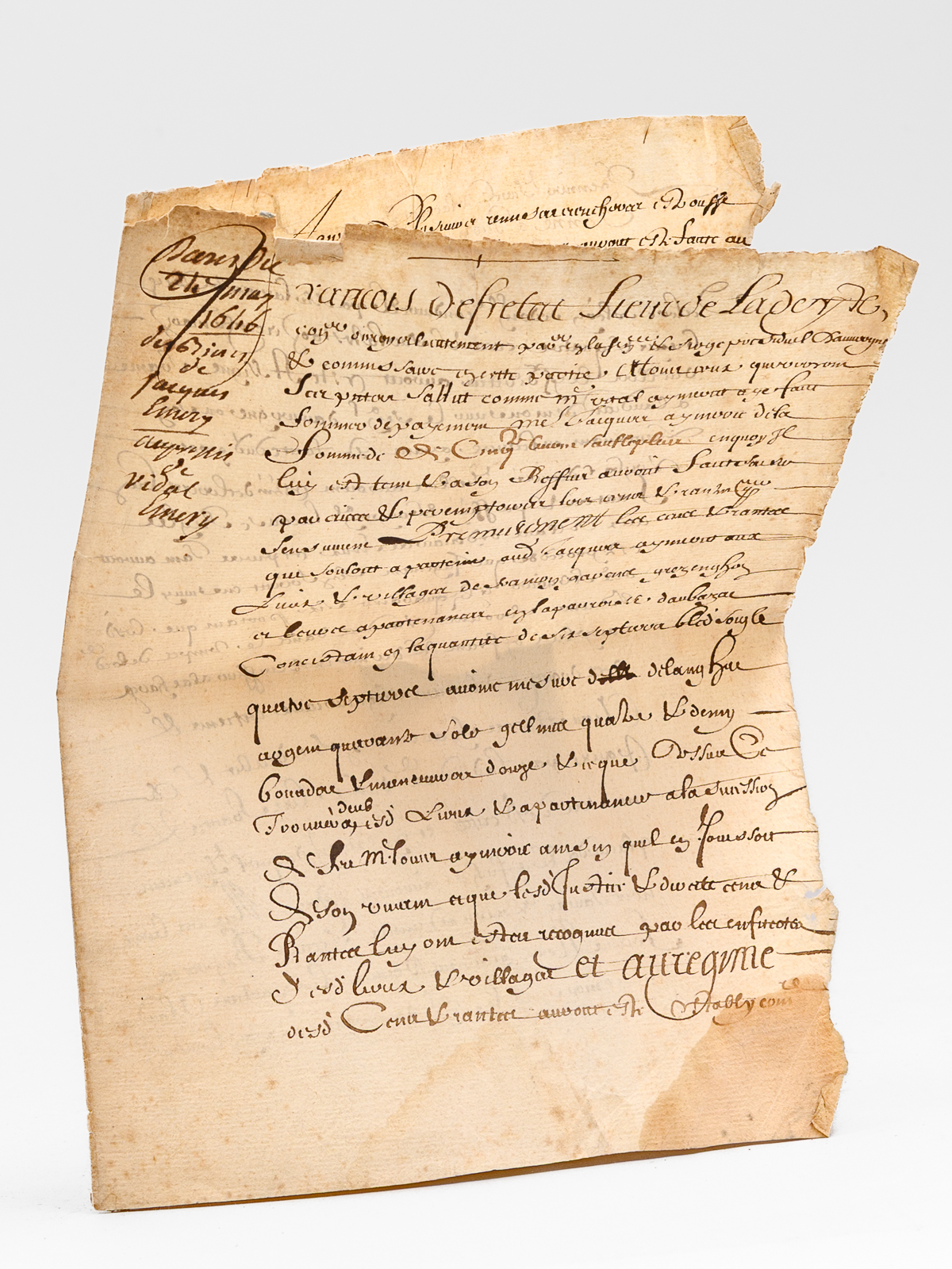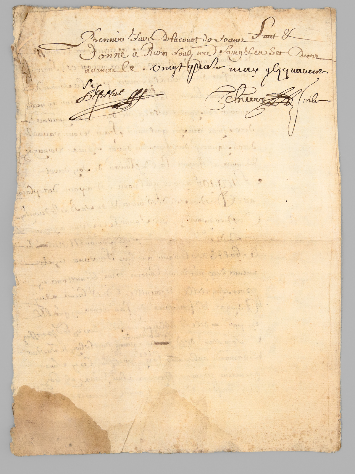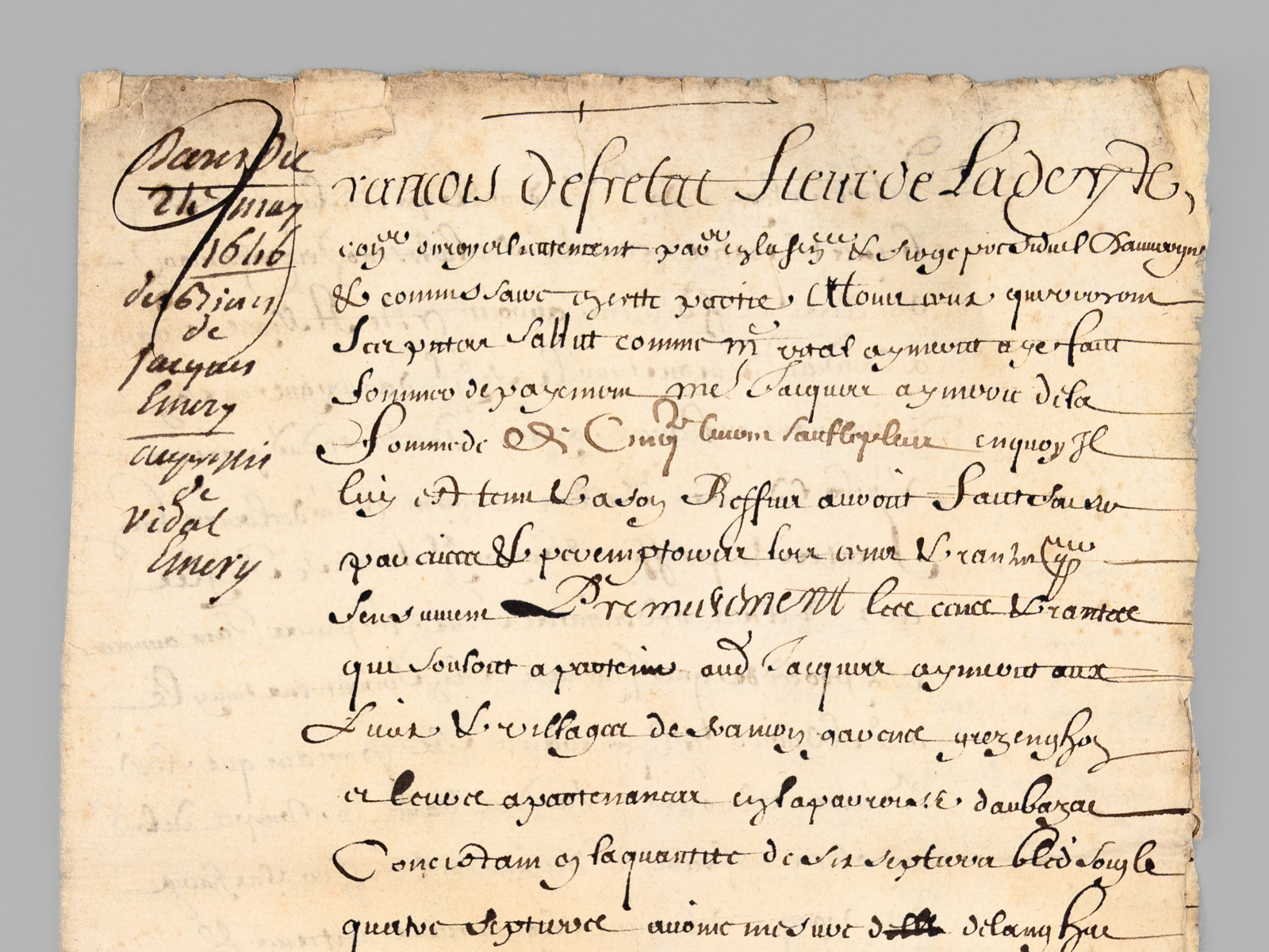 1 pièce manuscrite, de 2 ff.: [ Acte d'adjudication daté de Riom le 24 mai 1646, signé par François de Fretat Sieur de La Deyte : ] ' Francois de Fretat Sieur de La Deyte, con(seill)er du roy en son parlement & siège présidial d'Auvergne et commissaire en cette partie [... ]' [ Concerne notamment l'attribution de terrains en la paroisse d'Aubazat ],