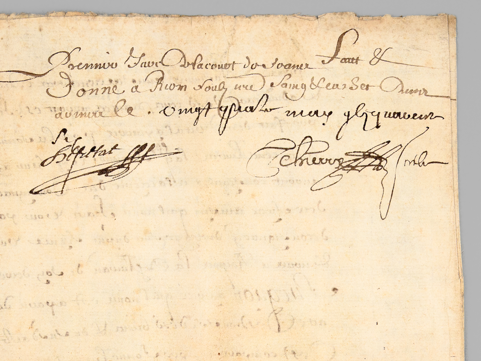 [ Manuscrit - Acte d'adjudication daté de Riom le 24 mai 1646, signé par Francois de Fretat Sieur de La Deyte : ] ' Francois de Fretat Sieur de La Deyte, con(seill)er du roy en son parlement & siège présidial d'Auvergne et comm