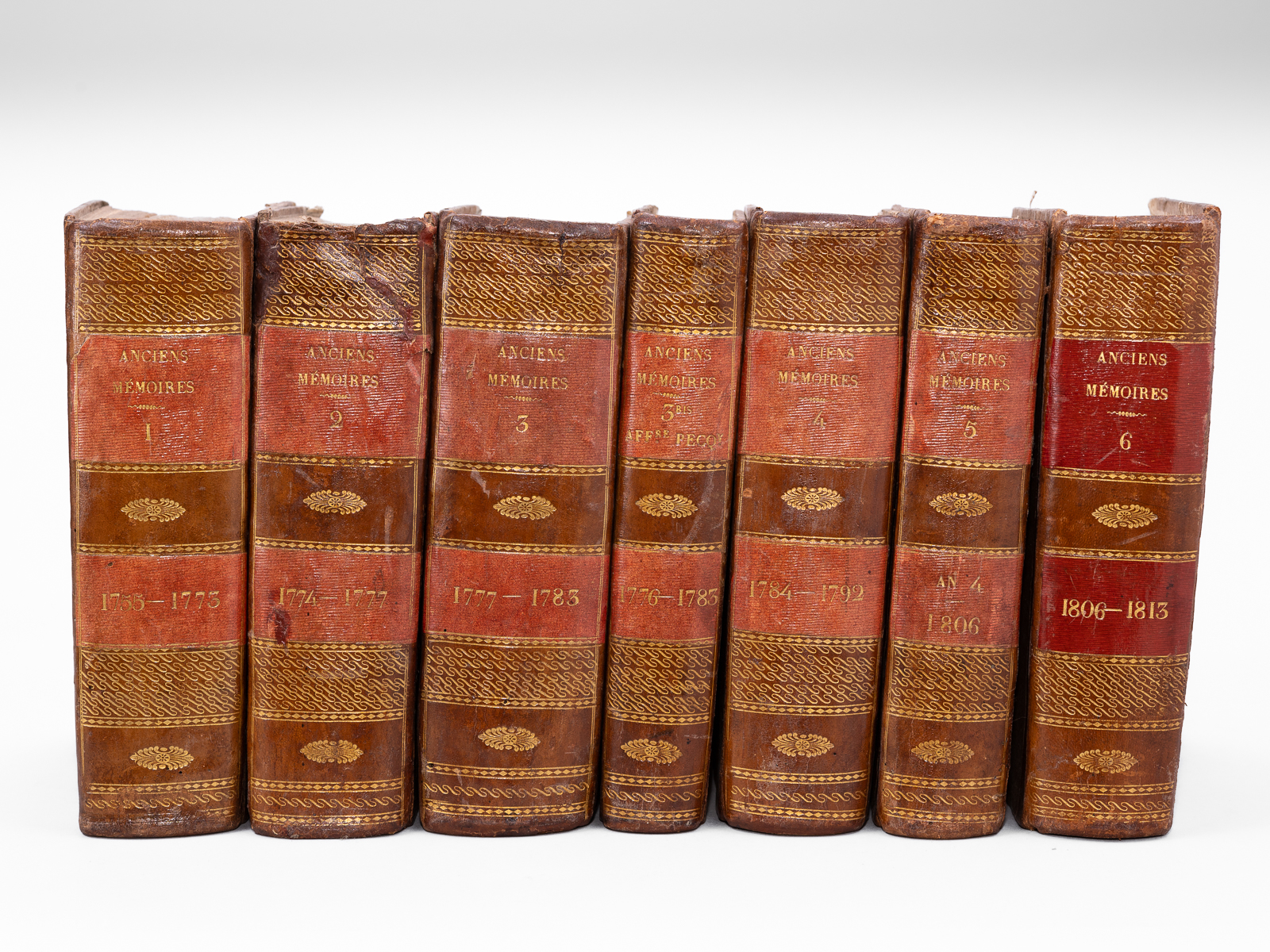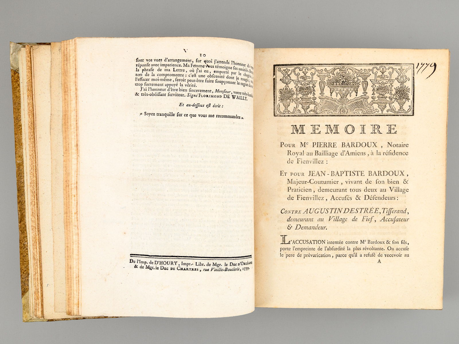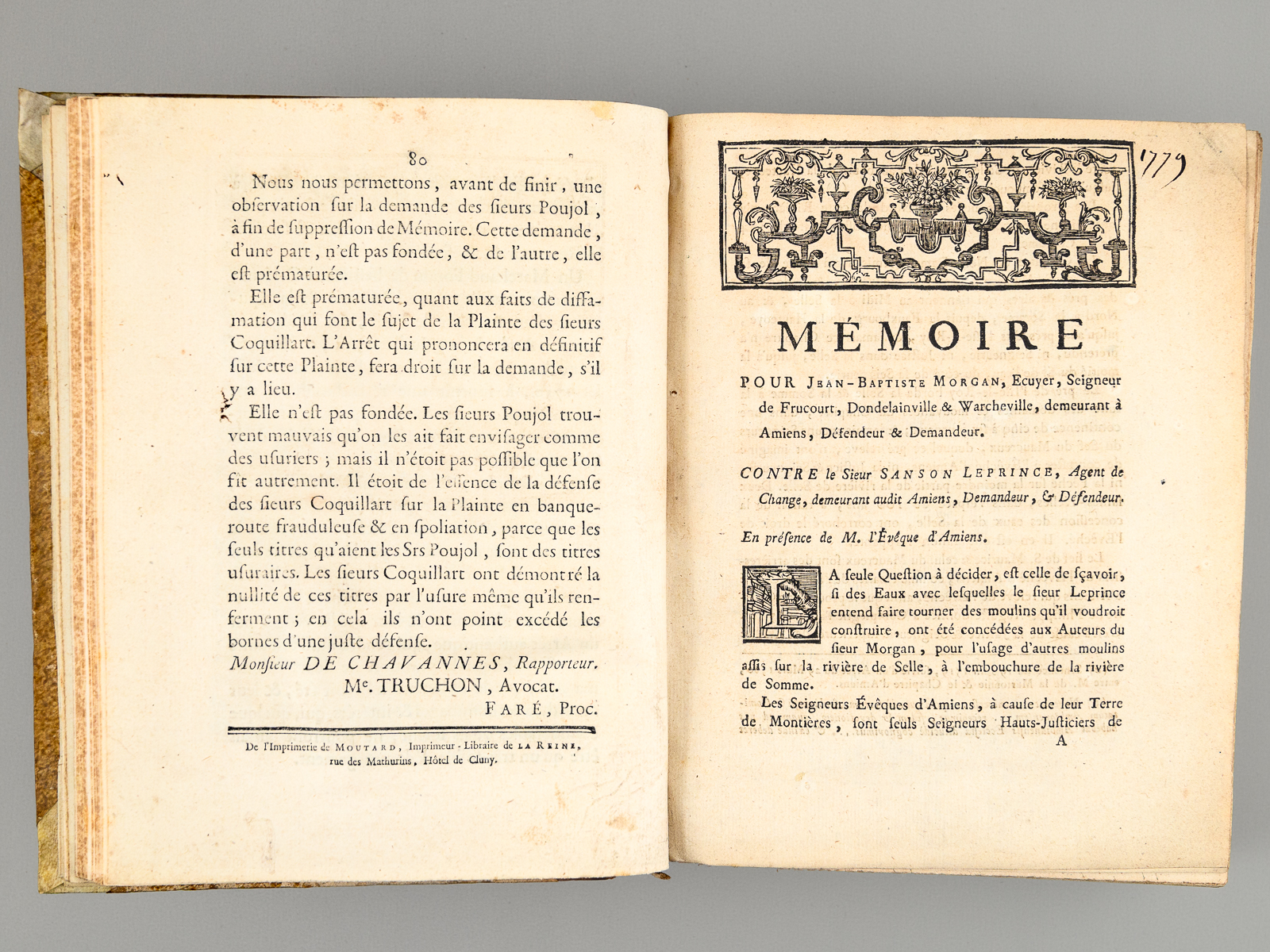 7 vol. in-4 reliure uniforme début XIXe demi-basane marron, dos lisse orné numéroté de 1 à 6 avec un 3bis. Détail [ Contient Notamment ] : Tome I 1755-1773 : Mémoire pour Maître Bourdon, Greffier en chef de l'Hôtel de Ville de Péronne 1755 - Arrests de la Cour de Parlement portant défenses aux nommés Bazin, De La Sauvagère, Mormont & De Renty de récidiver leurs Libelles & diffammations - Sommaire pour Me Jean-Baptiste Ropiquet, Procureur en la Cour contre Messire De La Folie de Vorme, Seigneur de Reincheval - Sommaire pour Jacques Maillard, Fermier de la Ferme de Renancourt - Précis sur Délibéré pour le Sieur Gallot & les Héritiers du Sr Savoye, Propriétaires des Moulins bannaux du Bourg d'Ault - Mémoire pour Me Etienne Lalau, Prêtre Chapelain de la Cathédrale d'Amiens - Mémoire pour la Dame veuve Masset et les Sieurs Masset... tous Marchands Commissionnaires à Saint-Valéry sur Somme, Intimés Contre la prétendue Communauté des Gribaniers de la même Ville - Mémoire sur Délibéré pour le Sieur Dubus Avocat en Parlement... Elu en l'Election de Senlis - Observations Sommaires pour les Habitans, Corps & Communautés d'Wavant & Beauvoir-Rivière contre le Vicomte de Marle & la Dame son Epouse - Mémoire et Consultation pour M. Luneau de Boisjermain, Soucripteur de l'Encyclopédie contre le Sieur Briasson et le Sieur Lebreton - Mémoire pour Me Boistel, Ecuyer, Seigneur de Belloy-sur-Somme, Avocat en Parlement au Bailliage & Siège Présidial d'Amiens - Mémoire pour les Maïeurs & Echevins de la Ville d'Abbeville, Défendeurs ; contre le receveur Général des Domaines & Bois de la Généralité de Picardie - Mémoire pour les Maire, Echevins et Officiers Municipaux de la Ville d'Amiens, Intervenans, contre le Sieur Le Seneschal, Receveur Général des Domaines & Bois de Picardie, Demandeur - Précis pour Me Jean-Baptiste Hesse, Curé d'Agnière, Doyen de Chrétienté de Grandvilliers - Précis pour les Srs Claude & Balthazar Picquet Seigneurs de Belloy-sur-Somme - Mémoire pour le Marquis de Gouy contre la Marquise de Gouy, par Le Go, Procureur. 1772 - Addition au Mémoire par De Vergès et Linguet - A Messieurs les Grands Bailli, Lieutenant-Particulier & Hommes de Fiefs, Gradués de la Gouvernance & Bailliage Royal d'Arras. 1773 - Mémoire signifié pour les Sieurs Dégardin, Bailli-Général de la Châtellenie & Comté d'Oisy - Mémoire pour le Sieur Ducandas, Chanoine de l'église Cathédrale d'Amiens - etc... ; Tome II 1774-1777 : Consultation pour le Marquis de Soyecourt 1774 - Mémoire pour la Communauté des Procureurs au Parlement contre les Prévot et Echevins de la Ville de Paris, les Conseillers et Quartiniers, les Six Corps des Marchands, De l'Imprimerie de Louis-Charles Caron, Amiens, 1774 - Mémoire pour Anéglique Galletn Veuve Clément, Contre Joseph & Jean-Baptiste Leroi, neveux & héritiers de Me Jean-Baptiste Leroi, en son vivant Curé de Warloy 1774 - Mémoire pour le Sieur Louis-Pierre-François Assegond Marchand Corroyeyr à Dieppe Contre Charles Duval, Marchand Tanneur à Blangy en Normandie - Mémoire sur Délibéré pour le Sieur Jean Marchant du Casseau, Avocat en Parlement, Intimé, Contre Timothée Girault, ci-devant Meunier du moulin de Saint-Eloy de Ferrière, Appelant, et les Abbé Prieur & Religieux de l'Abbaye Royale de Ferriere - Précis pour Gabriel Bos é Consors intimés Contre Me Jean Martin, Prêtre, Curé d'Allenay, appellant et contre Firmin Machet, Ménager à Bourseville - Mémoire pour les Maire, Echevins, Habitans & Corps commun de la Ville d'Albert en Auvergne contre M. le Comte de Merle, Brigadier des Armée du Roi, ci-devant son Ambassadeur en la Cour de Portugal 1775 - Précis pour la Demoiselle Elizabeth Mouret, Demanderesse, Contre Maître Watier & le Sieur Calixte Vilbault, dit Condé - Observations pour le Receveur-Général des Domaines & Bois de la Généralité d'Amiens, Demandeur, Contre le Sieur François-Alexandre de Bucy, Chevalier, Seigneur de Villers-Saint-Christophe, 1755 - Réponses Sommaires du Sieur de Bucy, Chevalier, Seigneur de Villers, aux Observations du Sieur le Sénéchal - Extrait de Titres et Observations Sommaires pour Monsieur le Comte de Crequi Canaples contre les Habitans de Beauquêne 1775 - Mémoire pour la Comtesse de Béthune, De l'Imprimerie de Philippe-Denys Pierres, Paris, Seguier, Avocat, Linguet Avocat 1775 - lettre de M . le Président de Meinières à Madame la Comtesse de Béthune - Mémoire pour la Comtesse de Béthune, Seconde Partie - Observations sur un Imprimé ayant pour titre : Mémoire pour Me Gerbier ancien Avocat, De l'Imprimerie de Philippe-Denys Pierres, Paris, 1775 - Supplêment aux Réflexions pour Me Linguet, Avocat de la Comtesse de Béthune - Mémoire pour la ville d'Amiens 1776 - Mémoire pour le sieur Isidore-Parfait Mimerel Chapelain de la Chapelle de Notre-Dame, dite de l'Aurore, érigée dans l'Eglise Cathédrale d'Amiens, Défendeur, contre le Sieur Asselin, Vicaire de la Paroisse de Notre-Dame, 1776 - Précis pour le Sieur Flesselle, Entrepreneur de l'un des Manufactures de la Ville d'Amiens, & encore les Sieurs Mercier & Doucet tous deux Voituriers au Village de Saint-Maurice-lès-Amiens, Contre les soi-disant Compagnons Fluqueurs & Déchargeurs de la Ville d'Amiens 1776 - Affaire très-intéressante pour le Commerce, en ce que l'Arrêt à intervenir doit faire réglement 1776 - mémoire pour les Syndic, Habitans, Corps & Communauté de la Paroisse de Vaux sous Amiens , Contre les Abbé, Prieurs & Religieux de l'Abbaye de Saint Jean d'Amiens, Ordre de Prémontré 1776 - Mémoire pour Firmin Sannier, Laboureur demeurant au Village de Métigny-Laleu, Défendeur, 1777 - Mémoire Me Cochepin, Seigneu de Métigny 1777 (avec plan dépliant en couleurs) - Mémoire Signié pour Sieur Louis-Robert Cocu, ci-devant négociant à Amiens, Appellant, contre Louis Vautour, Marchand de Modes à la même ville, 1777 - Précis pour Messie Vollant de Bervill, Marqu