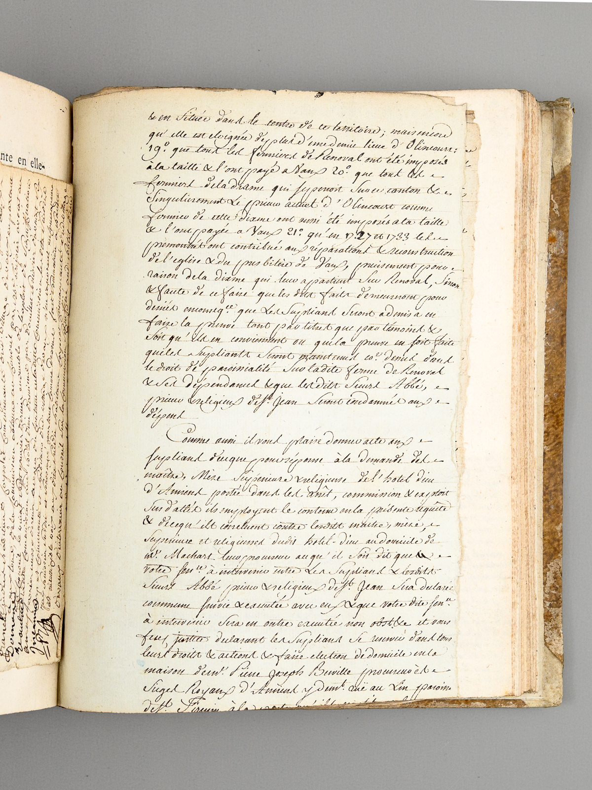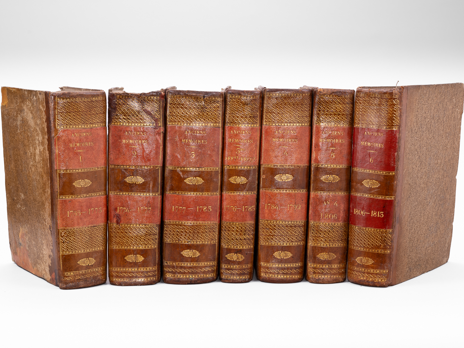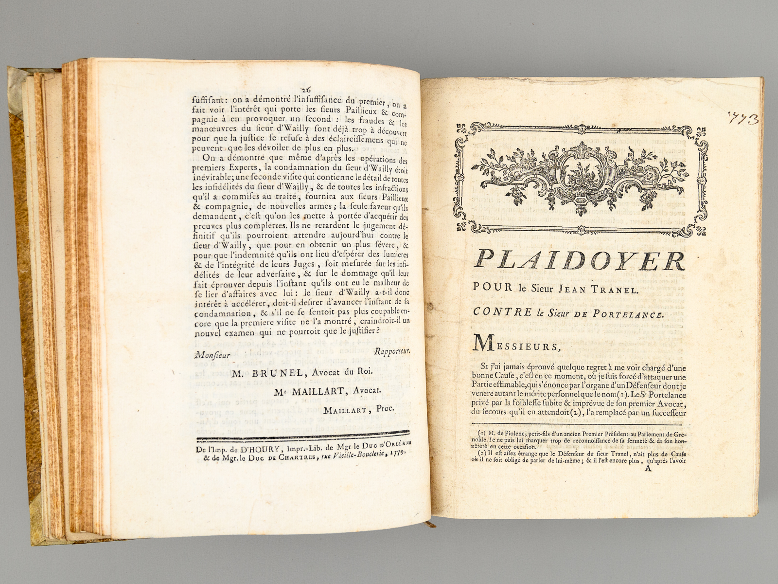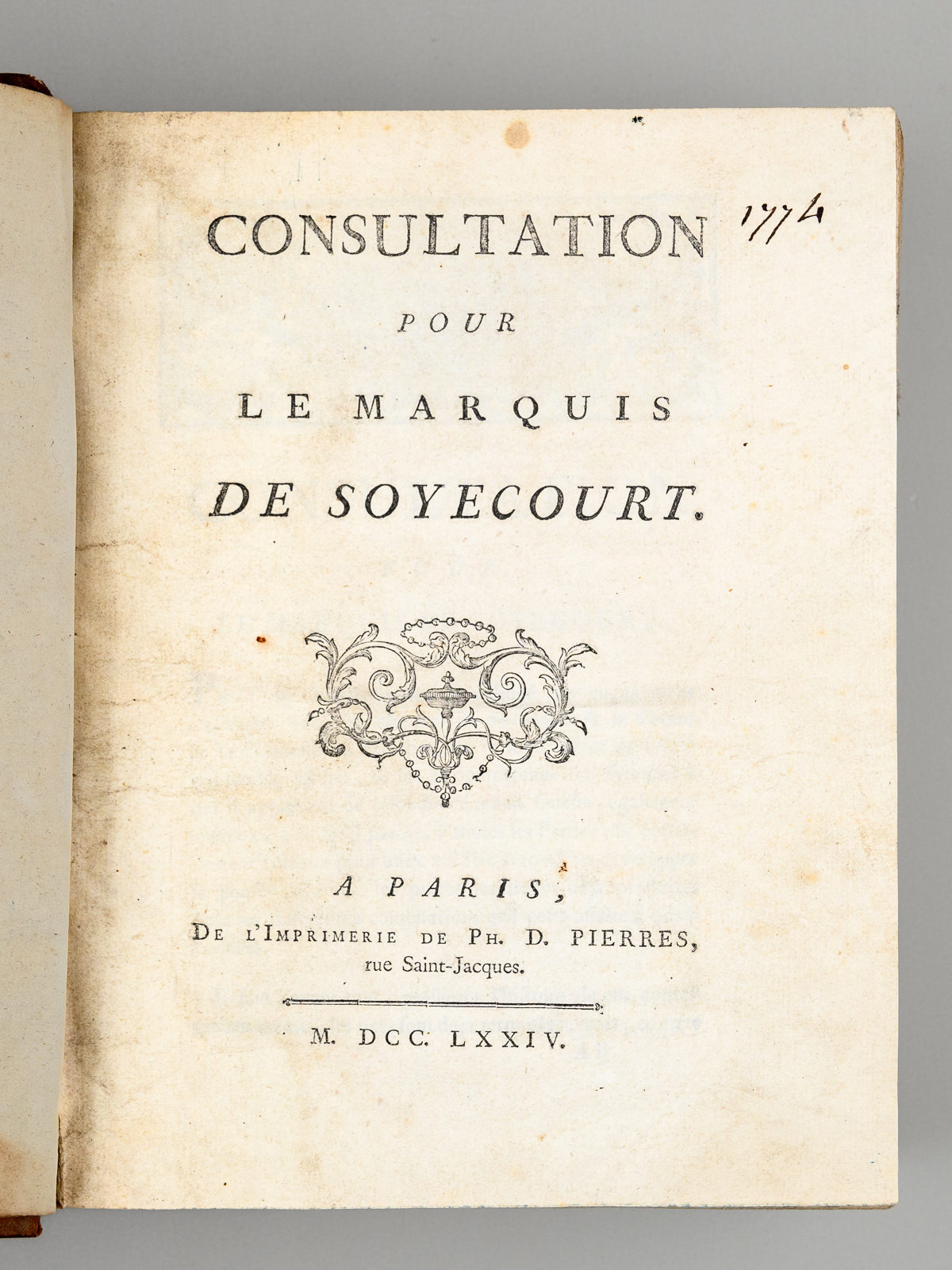 7 vol. in-4 reliure uniforme début XIXe demi-basane marron, dos lisse orné numéroté de 1 à 6 avec un 3bis. Détail [ Contient Notamment ] : Tome I 1755-1773 : Mémoire pour Maître Bourdon, Greffier en chef de l'Hôtel de Ville de Péronne 1755 - Arrests de la Cour de Parlement portant défenses aux nommés Bazin, De La Sauvagère, Mormont & De Renty de récidiver leurs Libelles & diffammations - Sommaire pour Me Jean-Baptiste Ropiquet, Procureur en la Cour contre Messire De La Folie de Vorme, Seigneur de Reincheval - Sommaire pour Jacques Maillard, Fermier de la Ferme de Renancourt - Précis sur Délibéré pour le Sieur Gallot & les Héritiers du Sr Savoye, Propriétaires des Moulins bannaux du Bourg d'Ault - Mémoire pour Me Etienne Lalau, Prêtre Chapelain de la Cathédrale d'Amiens - Mémoire pour la Dame veuve Masset et les Sieurs Masset... tous Marchands Commissionnaires à Saint-Valéry sur Somme, Intimés Contre la prétendue Communauté des Gribaniers de la même Ville - Mémoire sur Délibéré pour le Sieur Dubus Avocat en Parlement... Elu en l'Election de Senlis - Observations Sommaires pour les Habitans, Corps & Communautés d'Wavant & Beauvoir-Rivière contre le Vicomte de Marle & la Dame son Epouse - Mémoire et Consultation pour M. Luneau de Boisjermain, Soucripteur de l'Encyclopédie contre le Sieur Briasson et le Sieur Lebreton - Mémoire pour Me Boistel, Ecuyer, Seigneur de Belloy-sur-Somme, Avocat en Parlement au Bailliage & Siège Présidial d'Amiens - Mémoire pour les Maïeurs & Echevins de la Ville d'Abbeville, Défendeurs ; contre le receveur Général des Domaines & Bois de la Généralité de Picardie - Mémoire pour les Maire, Echevins et Officiers Municipaux de la Ville d'Amiens, Intervenans, contre le Sieur Le Seneschal, Receveur Général des Domaines & Bois de Picardie, Demandeur - Précis pour Me Jean-Baptiste Hesse, Curé d'Agnière, Doyen de Chrétienté de Grandvilliers - Précis pour les Srs Claude & Balthazar Picquet Seigneurs de Belloy-sur-Somme - Mémoire pour le Marquis de Gouy contre la Marquise de Gouy, par Le Go, Procureur. 1772 - Addition au Mémoire par De Vergès et Linguet - A Messieurs les Grands Bailli, Lieutenant-Particulier & Hommes de Fiefs, Gradués de la Gouvernance & Bailliage Royal d'Arras. 1773 - Mémoire signifié pour les Sieurs Dégardin, Bailli-Général de la Châtellenie & Comté d'Oisy - Mémoire pour le Sieur Ducandas, Chanoine de l'église Cathédrale d'Amiens - etc... ; Tome II 1774-1777 : Consultation pour le Marquis de Soyecourt 1774 - Mémoire pour la Communauté des Procureurs au Parlement contre les Prévot et Echevins de la Ville de Paris, les Conseillers et Quartiniers, les Six Corps des Marchands, De l'Imprimerie de Louis-Charles Caron, Amiens, 1774 - Mémoire pour Anéglique Galletn Veuve Clément, Contre Joseph & Jean-Baptiste Leroi, neveux & héritiers de Me Jean-Baptiste Leroi, en son vivant Curé de Warloy 1774 - Mémoire pour le Sieur Louis-Pierre-François Assegond Marchand Corroyeyr à Dieppe Contre Charles Duval, Marchand Tanneur à Blangy en Normandie - Mémoire sur Délibéré pour le Sieur Jean Marchant du Casseau, Avocat en Parlement, Intimé, Contre Timothée Girault, ci-devant Meunier du moulin de Saint-Eloy de Ferrière, Appelant, et les Abbé Prieur & Religieux de l'Abbaye Royale de Ferriere - Précis pour Gabriel Bos é Consors intimés Contre Me Jean Martin, Prêtre, Curé d'Allenay, appellant et contre Firmin Machet, Ménager à Bourseville - Mémoire pour les Maire, Echevins, Habitans & Corps commun de la Ville d'Albert en Auvergne contre M. le Comte de Merle, Brigadier des Armée du Roi, ci-devant son Ambassadeur en la Cour de Portugal 1775 - Précis pour la Demoiselle Elizabeth Mouret, Demanderesse, Contre Maître Watier & le Sieur Calixte Vilbault, dit Condé - Observations pour le Receveur-Général des Domaines & Bois de la Généralité d'Amiens, Demandeur, Contre le Sieur François-Alexandre de Bucy, Chevalier, Seigneur de Villers-Saint-Christophe, 1755 - Réponses Sommaires du Sieur de Bucy, Chevalier, Seigneur de Villers, aux Observations du Sieur le Sénéchal - Extrait de Titres et Observations Sommaires pour Monsieur le Comte de Crequi Canaples contre les Habitans de Beauquêne 1775 - Mémoire pour la Comtesse de Béthune, De l'Imprimerie de Philippe-Denys Pierres, Paris, Seguier, Avocat, Linguet Avocat 1775 - lettre de M . le Président de Meinières à Madame la Comtesse de Béthune - Mémoire pour la Comtesse de Béthune, Seconde Partie - Observations sur un Imprimé ayant pour titre : Mémoire pour Me Gerbier ancien Avocat, De l'Imprimerie de Philippe-Denys Pierres, Paris, 1775 - Supplêment aux Réflexions pour Me Linguet, Avocat de la Comtesse de Béthune - Mémoire pour la ville d'Amiens 1776 - Mémoire pour le sieur Isidore-Parfait Mimerel Chapelain de la Chapelle de Notre-Dame, dite de l'Aurore, érigée dans l'Eglise Cathédrale d'Amiens, Défendeur, contre le Sieur Asselin, Vicaire de la Paroisse de Notre-Dame, 1776 - Précis pour le Sieur Flesselle, Entrepreneur de l'un des Manufactures de la Ville d'Amiens, & encore les Sieurs Mercier & Doucet tous deux Voituriers au Village de Saint-Maurice-lès-Amiens, Contre les soi-disant Compagnons Fluqueurs & Déchargeurs de la Ville d'Amiens 1776 - Affaire très-intéressante pour le Commerce, en ce que l'Arrêt à intervenir doit faire réglement 1776 - mémoire pour les Syndic, Habitans, Corps & Communauté de la Paroisse de Vaux sous Amiens , Contre les Abbé, Prieurs & Religieux de l'Abbaye de Saint Jean d'Amiens, Ordre de Prémontré 1776 - Mémoire pour Firmin Sannier, Laboureur demeurant au Village de Métigny-Laleu, Défendeur, 1777 - Mémoire Me Cochepin, Seigneu de Métigny 1777 (avec plan dépliant en couleurs) - Mémoire Signié pour Sieur Louis-Robert Cocu, ci-devant négociant à Amiens, Appellant, contre Louis Vautour, Marchand de Modes à la même ville, 1777 - Précis pour Messie Vollant de Bervill, Marqu
