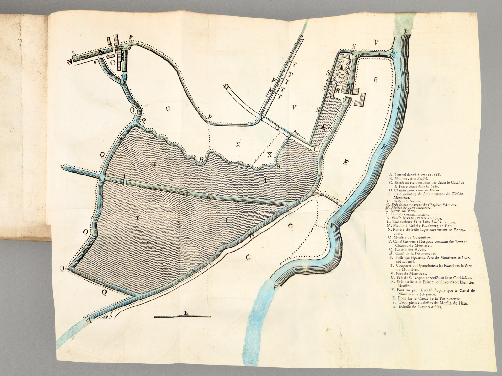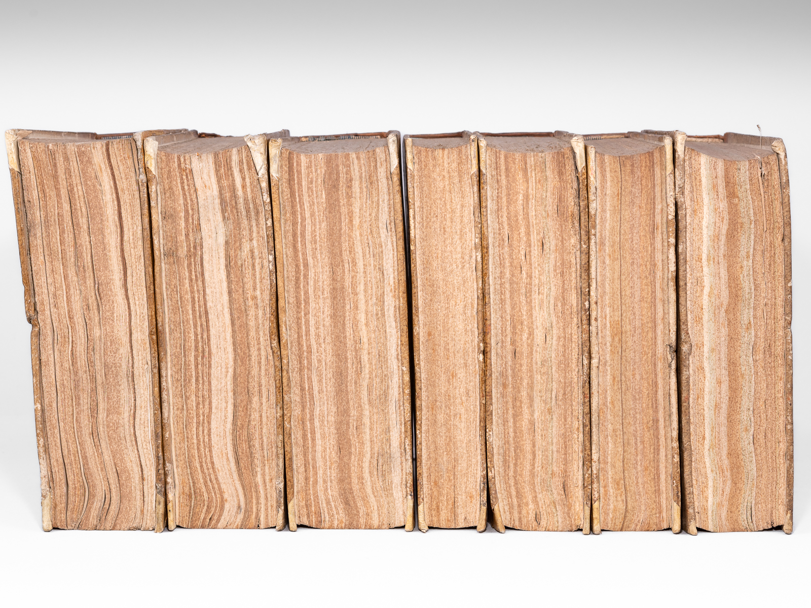 Commentaire : Cet ensemble unique et remarquable provient de la bibliothèque de l'amiénois Pierre-Joseph Berville (1751-1832). Fils d'un procureur au bailliage, homme de loi dès avant la Révolution, il est secrétaire général de l'assemblée provinciale de Picardie entre 1782 et 1787, premier suppléant aux Etats-Généraux en 1789, secrétaire du conseil général de la Somme en 1790 puis administrateur des hospices d'Amiens en l'an IV. Sous le Premier Empire, il sera nommé secrétaire général de la préfecture de la Somme. Il sera député de la Somme en 1815, pendant les Cent-Jours, puis, révoqué à la Seconde Restauration, il deviendra juge de paix dans le Canton de Charenton. Cet ensemble exceptionnel, rassemblant près de 200 mémoires souvent rares, et relié avec soin, nous fait rentrer d'une manière unique dans le détail des querelles judiciaires en Picardie, de la fin du règne de Louis XV jusqu'aux dernières années du Premier Empire. Notre descriptif rapide se contente de citer une partie des imprimés contenus dans les 7 volumes. Parmi ceux-ci, on notera la présence du mémoire en défense rédigé par l'avocat Simon Linguet dans l'affaire de la marquise de Gouy, où la présence de 2 plans dépliants en couleurs venant en illustration de plaidoiries. Bon ensemble (premier plat du premier volume coupé sans manque, accroc à une coiffe en tête, restauration ancienne avec mq. au dernier feuillet du tome 4, qq. petits frott. et usures, très bon état par ailleurs).