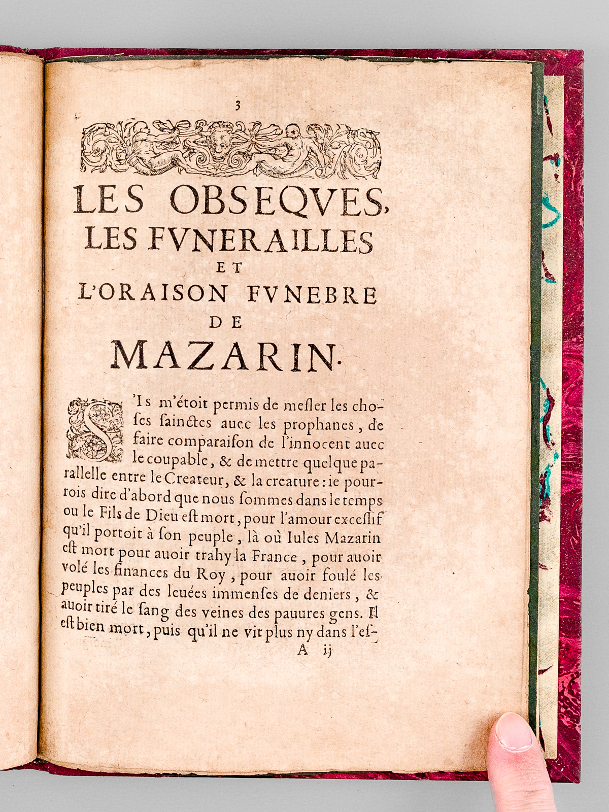 Recueil de 9 mazarinades en 1 vol. in-8 reliure bradel début XXe demi-percaline bordeaux : Apologie pour Monseigneur le Cardinal Mazarin, tirée d'une Conférence entre son Eminence et Monsieur ****** homme de probité & excellent casuiste. Tenuë à Saint Germain en Laye deux iours consécutifs. Première Journée, Chez François Preuveray, Paris, 1649, 39 pp. [ la 'seconde journée' commence à la page 21 - 'C'est une apologie telle que la fronde l'a pu et dû faire. La pièce est d'aillurs fort spirituelle et embrasse la vie presque entière du cardinal ; elle a paru après la comédie de l'ambassade espagnole au parlement' Moreau, 127 - ref BM00127 ] [ Suivi de : ] Discours sur l'Entrevue du Cardinal Mazarin et de Monsieur d'Hocquincour, Gouverneur de Péronne, s. n., 1649, 15 pp. ['pièce imprimée au cours de la première semaine de juillet 1649' selon Carrier, oeuvre collective à laquelle le Cardinal de Retz aurait peut-être pris part d'après Myriam Tsimbidy - 'Bonne pièce à laquelle il ne manque que d'être rare [ ... ] La cour était à Amiens ; et le siège de Cambray avait été levé. Si nous en croyons Madame de Motteville, le cardinal voulait seulement se raccommoder avec d'Hocquincourt ; et il ne songeait pas à lui enlever sa place. Le voyage réussit pleinement' nous dit Moreau, 1145 - BM02094 ] [ Suivi de : ] La Confession Générale de Iulle Mazarin sur tous les Crimes par luy commis contre le Pape & tous les Princes Chrestiens, s.n., A Paris, 1649, 4 pp. [Texte paru durant le blocus de Paris - 'Curieuse et rare' d'après Moreau 747 - BM00071 ] [ Suivi de : ] Les entretiens de Mazarin, et de La Rivière au Retour du Sabat, s.n., Paris, 1649, 8 pp. ['Au commencement du blocus. Il y a de l'esprit, mais encore plus d'ordure. Moustarot était apparemment un grand sorcier, puisque c'était lui qui donnait des Caractères à Mazarin pour la reine, et à La Rivière pour le duc d'Orléans... à moins qu'il ne soit une corruption d'Astaroth' nous dit Moreau, 1249 [ Suivi de : ] L'Amende Honorable de Iules Mazarin, des Crimes qu'il a commis contre Dieu, contre le Roy, & contre luy-mesme, s.n., A Paris, 1649, 8 pp. [ Texte paru la deuxième semaine de janvier 1649 d'après Carrier - 'Peu de jours après l'arrêt du 8 janvier. C'est je crois, le premier pamphlet où il est parlé de vingt-cinq mille personnes qui auraient été jetées en prison pour n'avoir pas payé la taille, et dont six mille seraient mortes de faim' nous dit Moreau, 76 - BM00695 ] [ Suivi de : ] Lettre de Monsieur le Mareschal de Tyrenne envoyée à Monsieur le Duc de Bouillon, Chez Pierre Variquet, A Paris, 1649, 8 pp. [Moreau, 2026 ] [ Suivi de : ] Echo de la France Troublée, par le Déguisé Mazarin, Représenté par la figure d'un Ours, par le Sr. Barroys, Chez Nicolas Vivenay, Paris, 1649, 8 pp. [ 'Texte paru pendant le blocus de Paris' selon Carrier ; 'Moitié prose, moitié vers ; le tout fort ridicule' nous dit Moreau, 1178 - BM00653 ] [ Suivi de : ] Lethimologie de Mazarin avec l'Explication de ses Armes, Chez la Vesve Musnier, Paris, 1649, 8 pp. [ 'Mazarin, de Mazar, bourreau, et de in, privatif de toute bonne qualité. Des faisceaux consulaires, l'auteur fait des haches, et des trois étoiles, trois roues. Médiocrement spirituel' selon Moreau, 1305 ][ Suivi de : ] Les Obsèques, les Funérailles et l'Oraison Funèbre de Mazarin, Chez N. Charles, à Paris, 1649, 8 pp. [ Moreau, 2565 ]