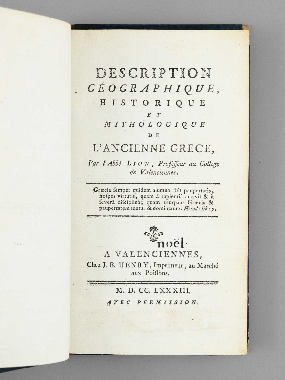 Commentaire : Rare exemplaire de cette édition valenciennoise imprimée sur un bon papier vergé. L'abbé Lion était professeur au Collège de Valenciennes. Etat très satisfaisant (mq. en coiffe sup., très bon état par ailleurs, ex-libris en garde).