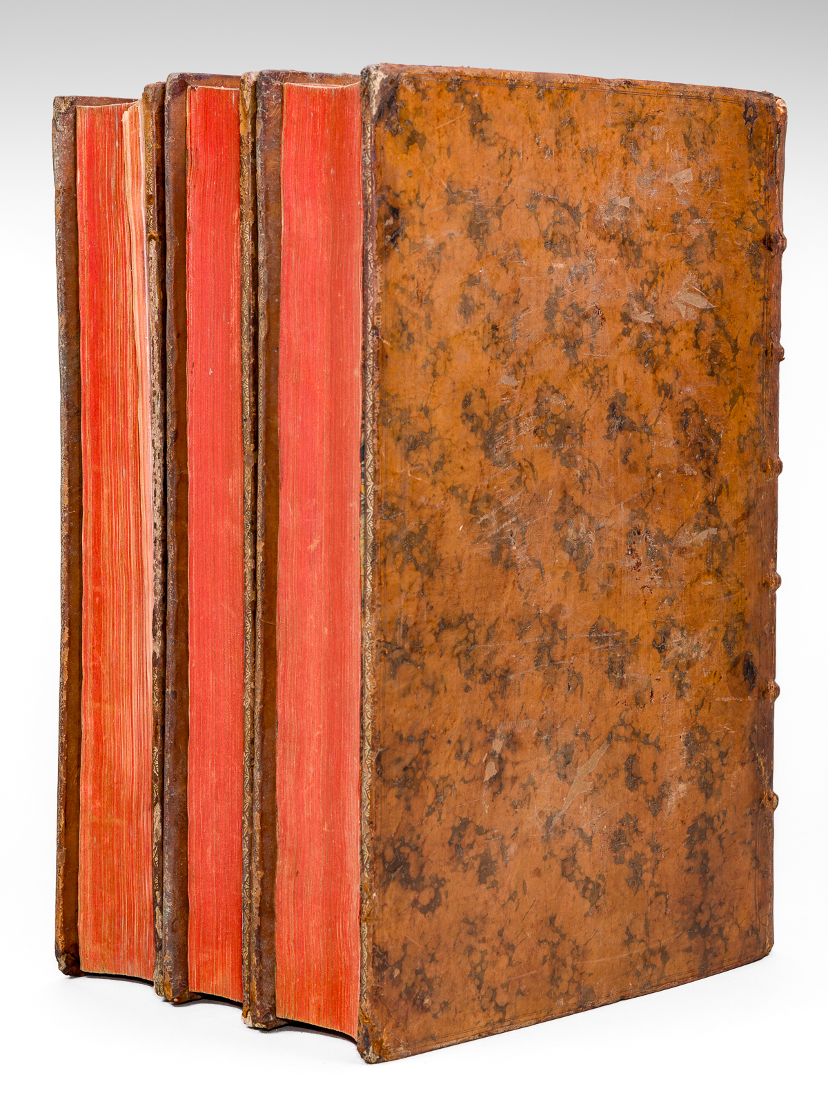 3 vol. in-folio reliure de l'époque pleine basane marbrée, dos à 6 nerfs orné, Chez la Veuve Estienne et Fils, Paris, 1748, Tome I : 4 ff., XXVII-544 pp. [ Etat général du Commerce ] et 1140 col. ; Tome II : 2 ff., 1774 col. ; Tome III : 2 ff., 1316-684 col.