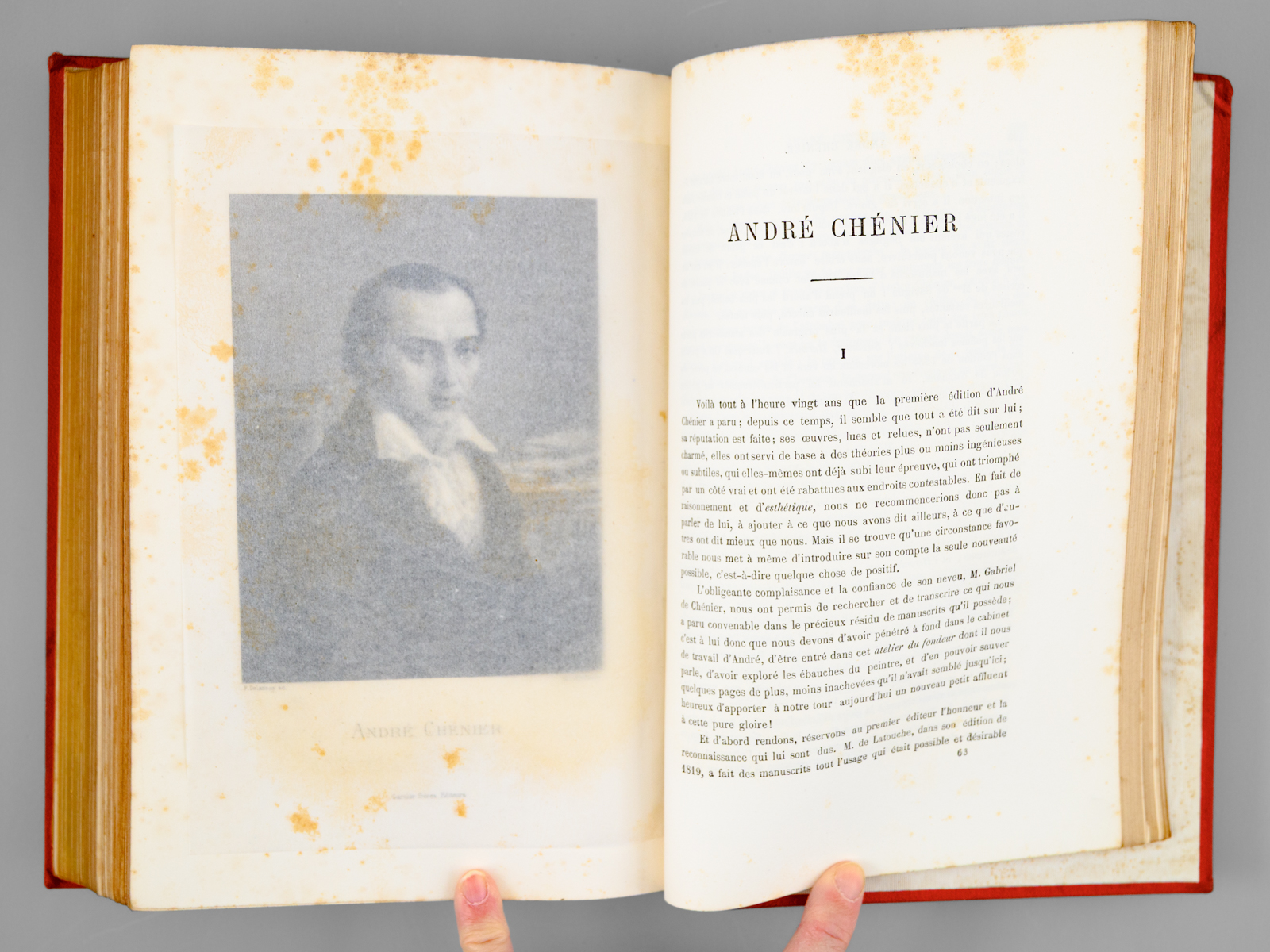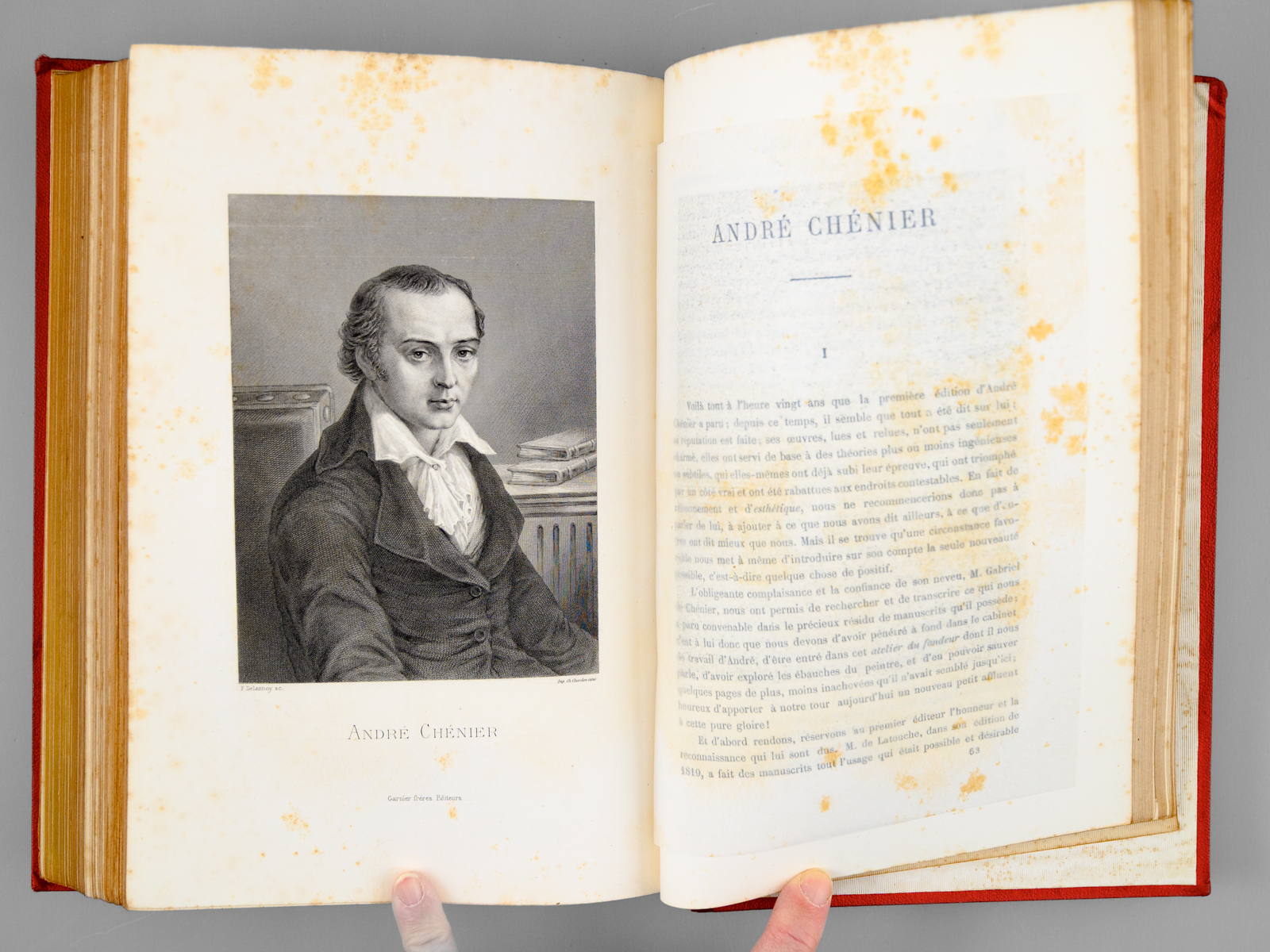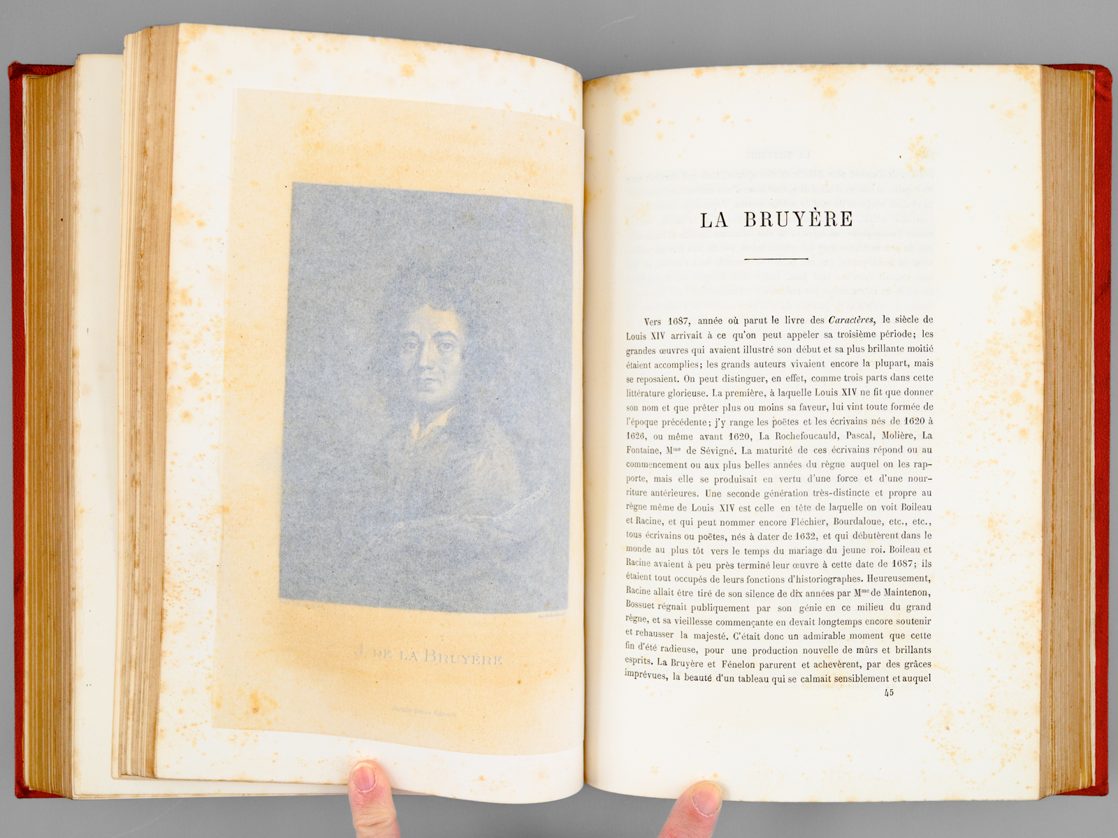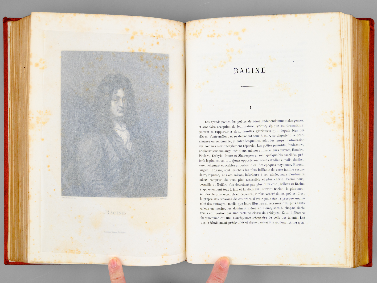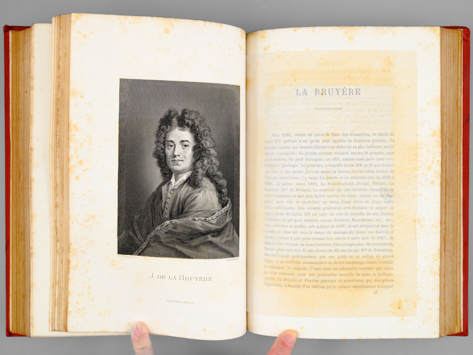 Commentaire : Cet impressionnant ensemble réunit une longue galerie de portraits d'écrivains (Villehardouin, Joinville,Froissart, Retz, Perrault, Bourdaloue, Saint-Simon, Buffon, Le Sage, Vauvenargues, Diderot, Beaumarchais, Villon, Rabelais, Pascal, Molière, Rousseau, etc...) et dee femmes célèbre (dont plusieurs écrivains) : Marguerite de Navarre, Marie Stuart, Madame de Maintenon, Madame Récamier, Madame Necker, George Sand, Eugénie de Guérin, Madame de Lambert, la Grande Mademoiselle, Madame de Longueville, Madame de La Vallière, la Princesse des Ursins, Mademoiselle Aïssé, Madame du Deffand, la marquise de Créqui, Madame de Staël, Madame de Krüdener, Madame de Duras, Sophie Gay, etc. Etat très satisfaisant (2 chocs en coins, coiffes un peu frottées, qq. rouss., bon exemplaire par ailleurs).