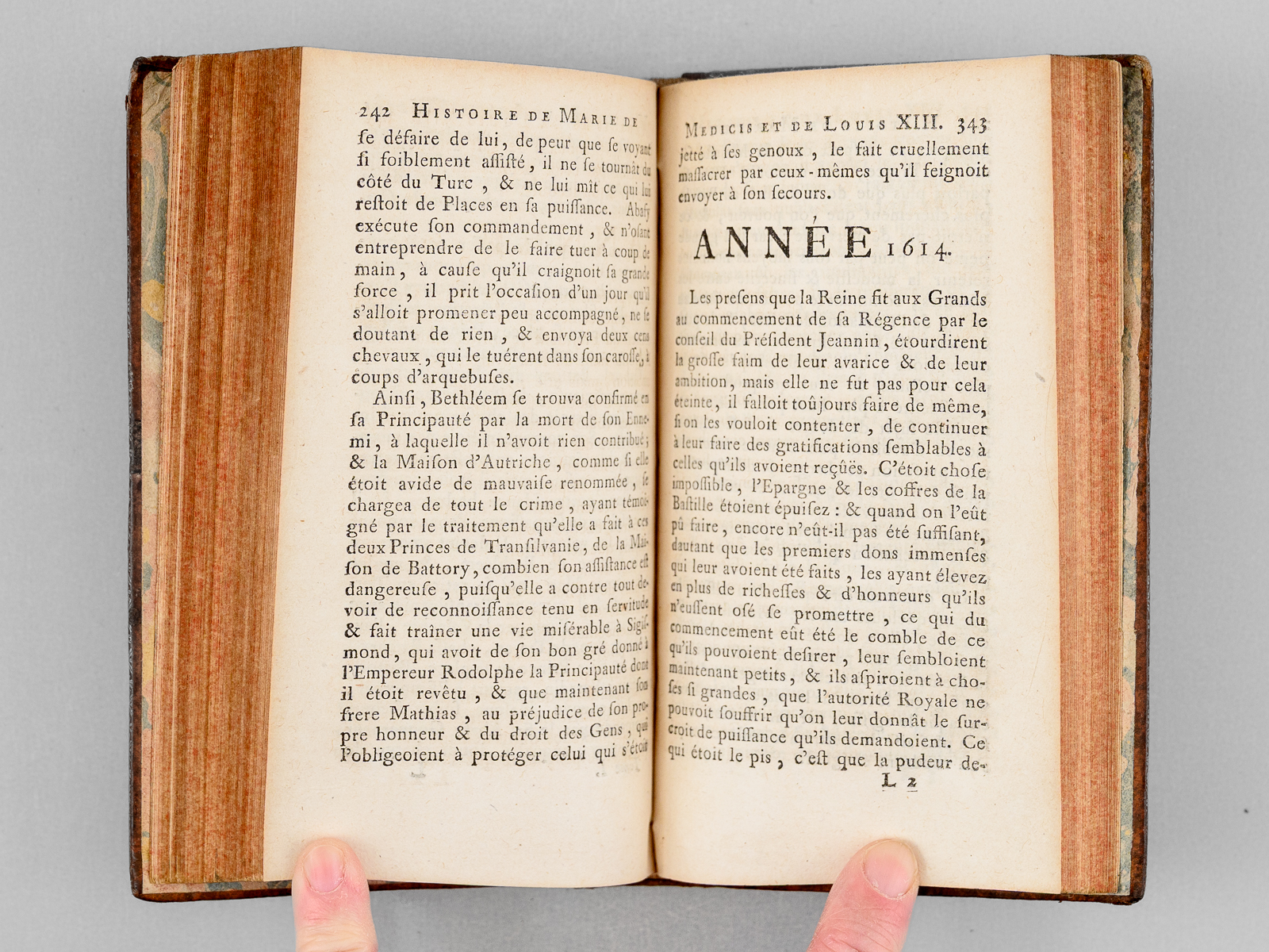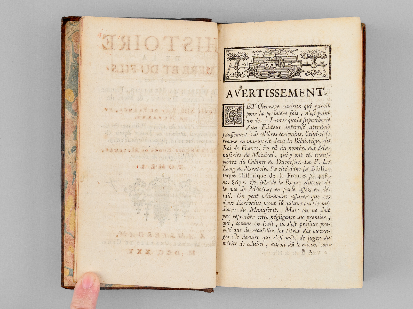 Par François Eudes de Mézeray, Historiographe de France, 2 vol. in-12 reliure de l'époque plein veau marbré, dos à 5 nerfs orné, filet doré en coupes, Chez Michel-Charles Le Cene, A Amsterdam, Michel-Charles Le Cene, Amsterdam, 1730, 1 f., 406 pp. et 12 ff. n. ch. ; 4 ff., 350 pp. et 18 ff. n. ch. Commentaire : Quérard attribue cet ouvrage détaillant toutes les passionnantes intrigues de la période au Cardinal de Richelieu lui-même. Quérard, Super. III, 249 : 'Si l'on en croit Camusat [ ... ] l'éditeur de 'L'Histoire de la Mère et du Fils' serait l'auteur des 'Amours de Sapho', c'est-à-dire Du Castre d'Auvigny'. Etat satisfaisant (manques en dos et coiffes, longue annotation ancienne relative à l'ouvrage en garde, bon état par ailleurs). Prix en l'état