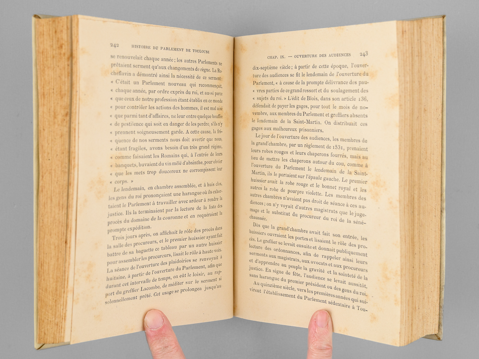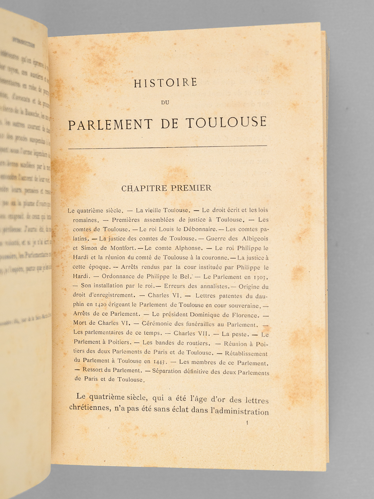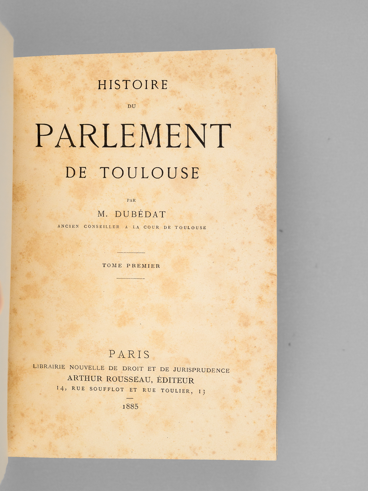 E.O., 1 vol. in-12 rel. plein vélin blanc, titre ms. à l'encre sur dos, Librairie Nouvelle de Droit et de Jurisprudence, Arthur Rousseau éditeur, Paris, 1885, 759 pp. Commentaire : Etat très satisfaisant (des soulignements au crayon à papier, bel exemplaire par ailleurs) pour ce Tome 1, qui s'achève en 1610. Peu courant en exemplaire d'époque, particulièrement en relié. En 1886, cet ouvrage fut couronné par l'Académie Française (Prix Thérouanne).