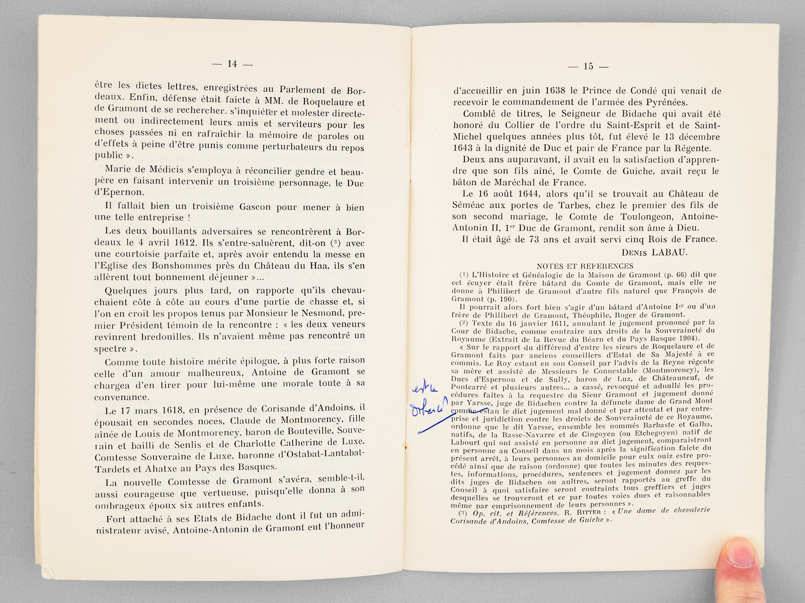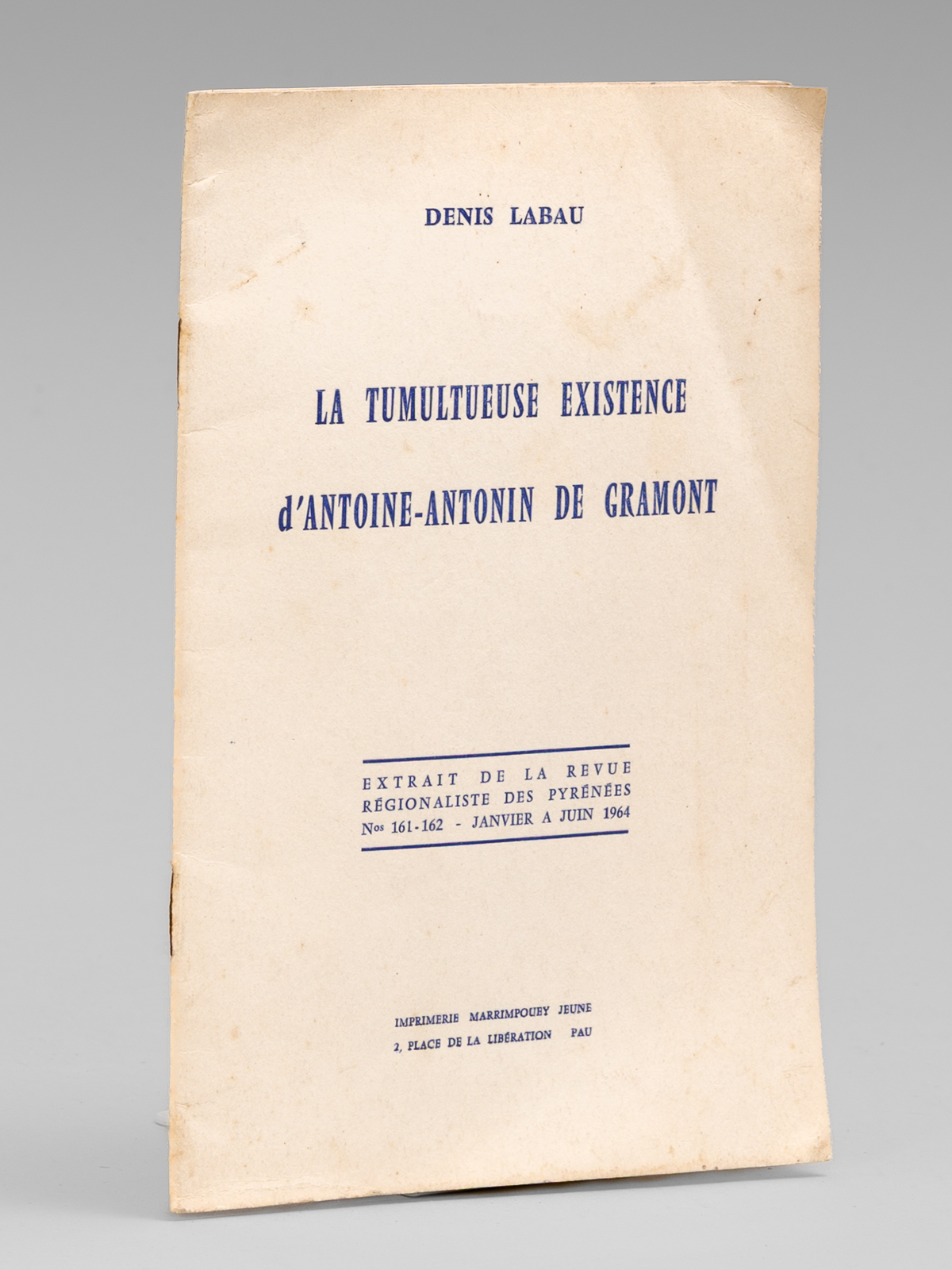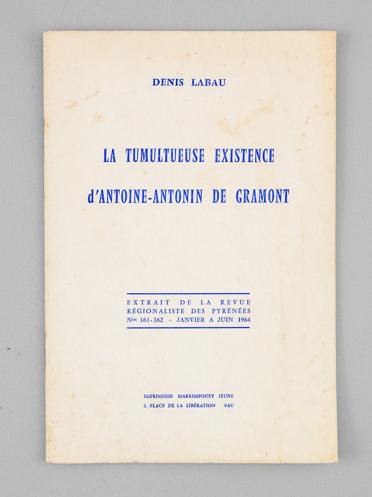 1 brochure in-8, Extrait de la Revue Régionaliste des Pyrénées, Nos 161-162 - Janvier à Juin 1964, Imprimerie Marrimpouey Jeune, Pau, 1964, 15 pp. Commentaire : Hommage de l'auteur (non signé) à René Cuzacq qui a, conformément à son habitude, largement corrigé et annoté au stylo la plaquette. Etat très satisfaisant (couv. lég. frottée, annotations).
