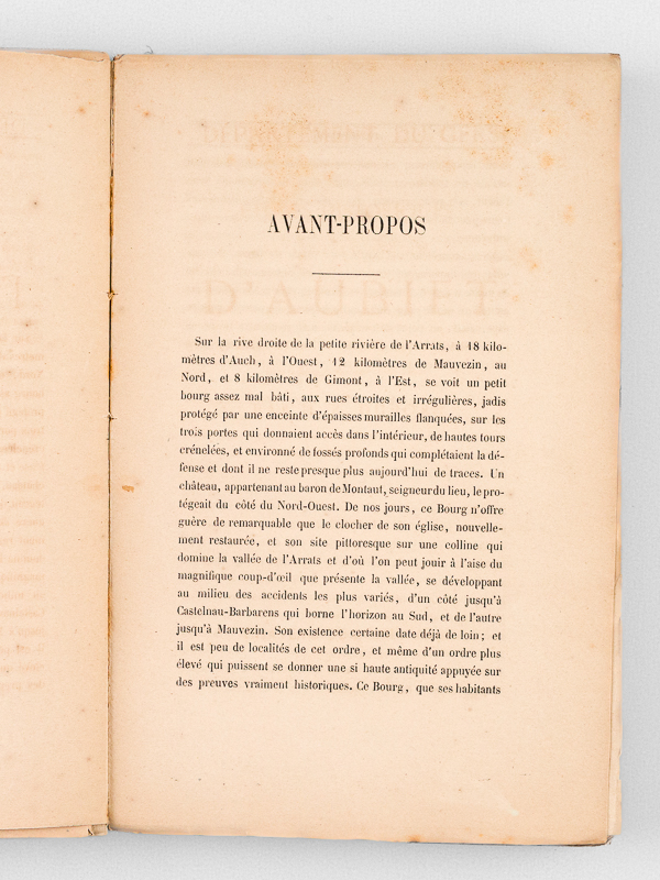 Commentaire : Rare exemplaire de cette importante monographie, ouvrage de référence sur la commune d'Aubiet, à l'est d'Auch. Etat très satisfaisant (couv. lég. frottée avec petite fente et petit mq. en couv., bon exemplaire par ailleurs)