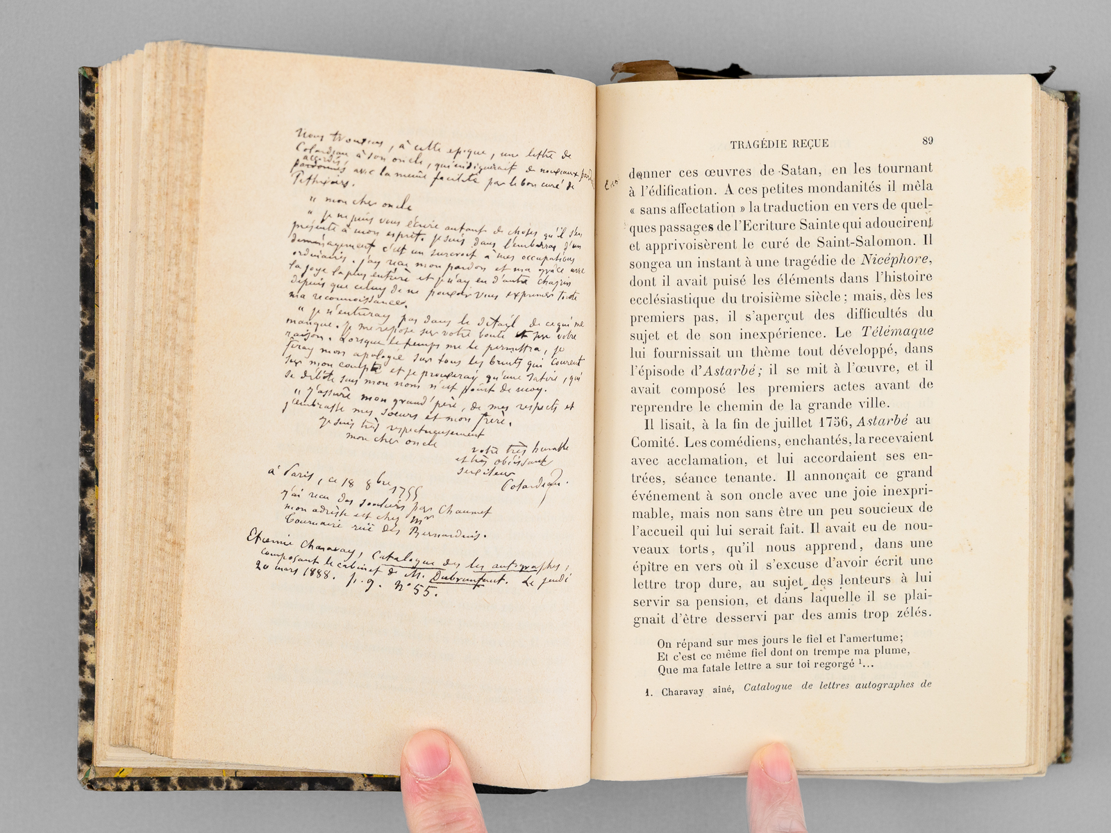 Commentaire : Exemplaire unique de l'auteur, qu'il a fait relier et entièrement interfolier, pour lui permettre d'y rédiger ses corrections et ajouts. Gustave Desnoireterres a fortement enrichi l'exemplaire de ses notes autographes, parfois portées sur des feuillets volants. 'M. Desnoiresterres s'est beaucoup occupé du XVIIIe siècle, de ses moeurs et de ses célébrités. Il en a scruté le côté intime avec talent et fait revivre avec habileté l'intéressante physionomie' (Larousse, GDU, VI, 573). Bon état (un seul des 3 portraits signalés) pour ce remarquable exemplaire enrichi par l'auteur. Vicaire, III, 221