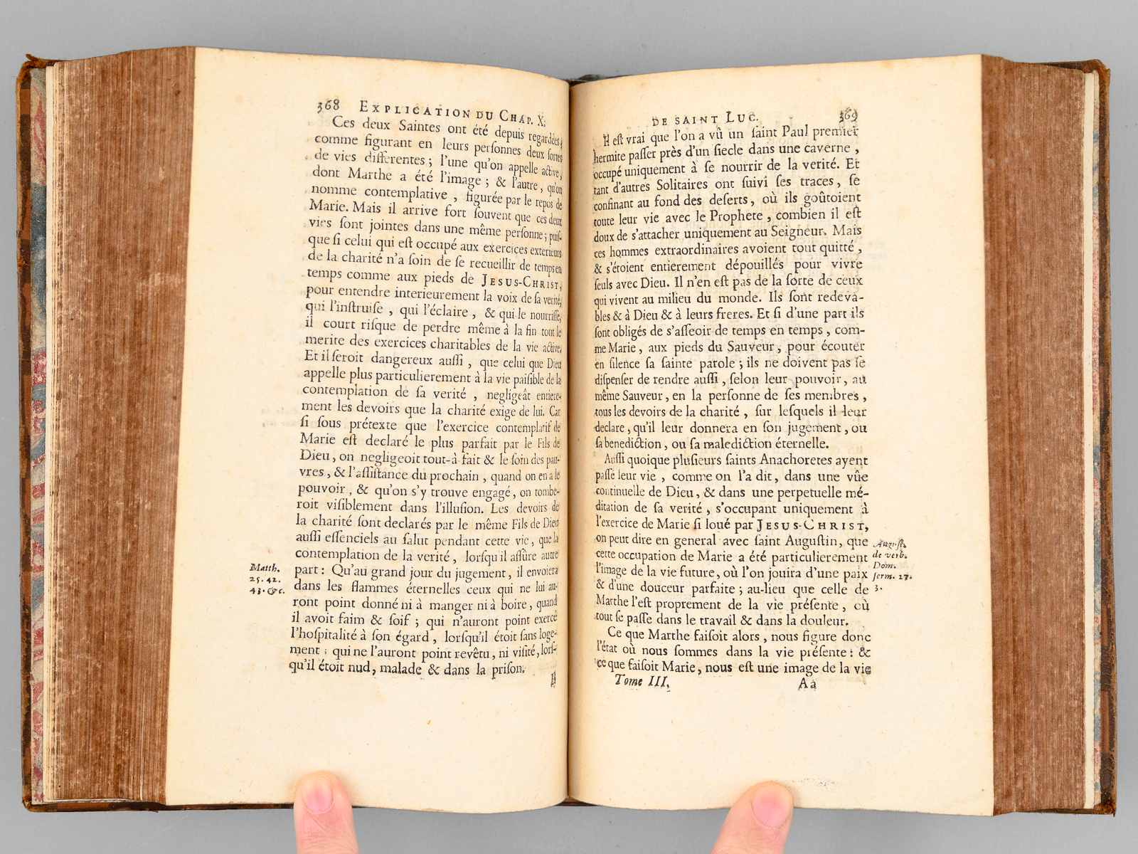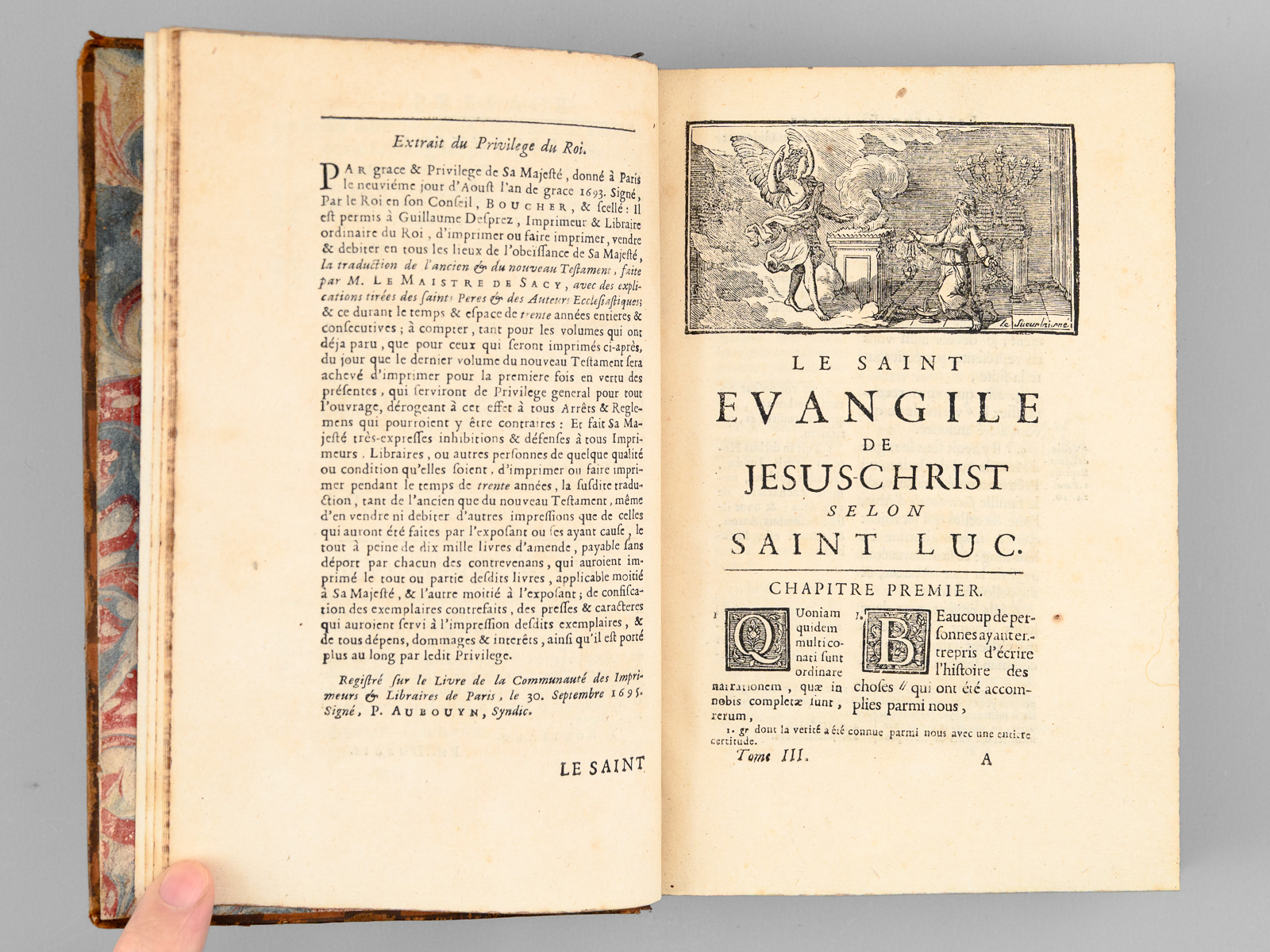1 vol. in-8 rel. d'époque pleine basane marron, dos à 5 nerfs orné, tranches rouges, mention 'Bibliothèque Asiatique' au dos en tête, Chez Guillaume Desprez, Paris, 1705 Commentaire : Complet de l'Evangile selon Saint Luc. Etat très satisfaisant (petits mq. en coiffe, gommette de papier au dos en queue, coins un peu frottés, bon état par ailleurs) pour ce curieux exemplaire. Voir également dans notre catalogue d'autres volumes de cette Bible de Sacy en 32 volumes, souvent enrichis des notes manuscrites d'un annotateur, qui semble fort intéressé par les civilisations de l'Asie (cet exemplaire n'est pas annoté).