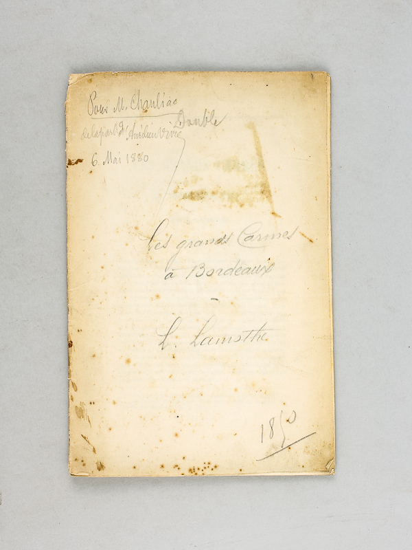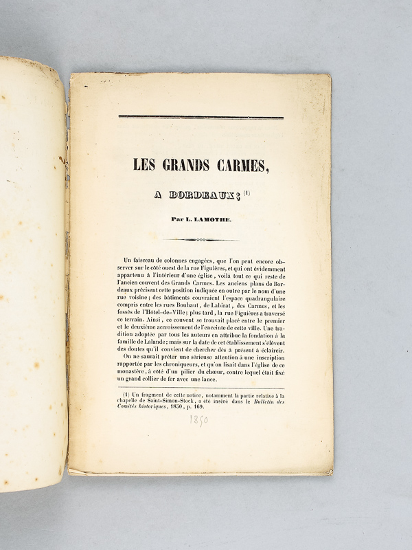 Commentaire : Une note imprimée précise : 'Un fragment de cette notice [ ... ] a été insérée dans le Bulletin des Comités historiques'. Une note manuscrite sur la couv. indique : 'Pour M. Chauliac, de la part d'Aurélien Vivie'. rare tiré-à-part, bien complet de l'étude intéressante sur l'ancien couvent des Grands-Carmes à Bordeaux. Etat très satisfaisant