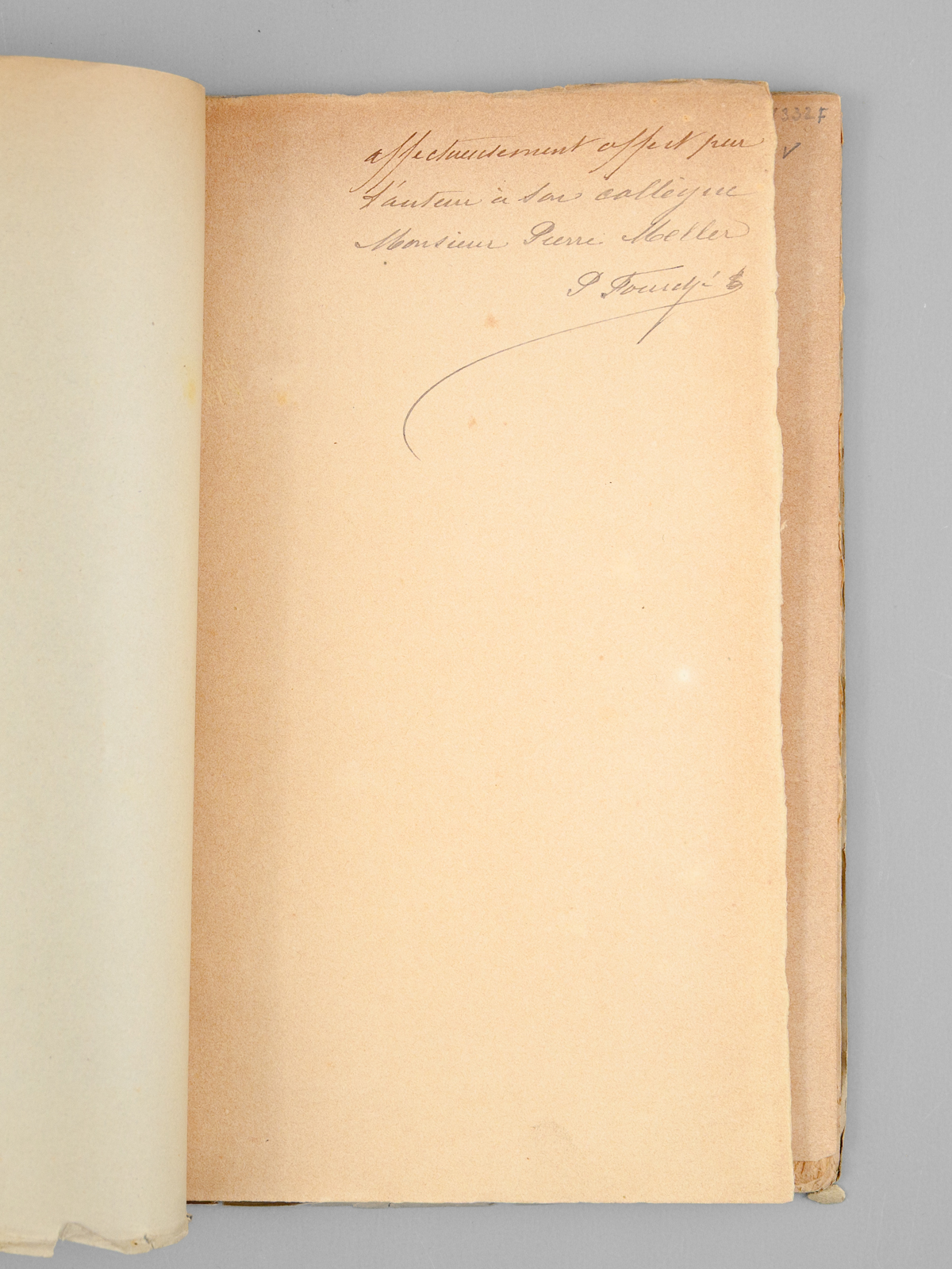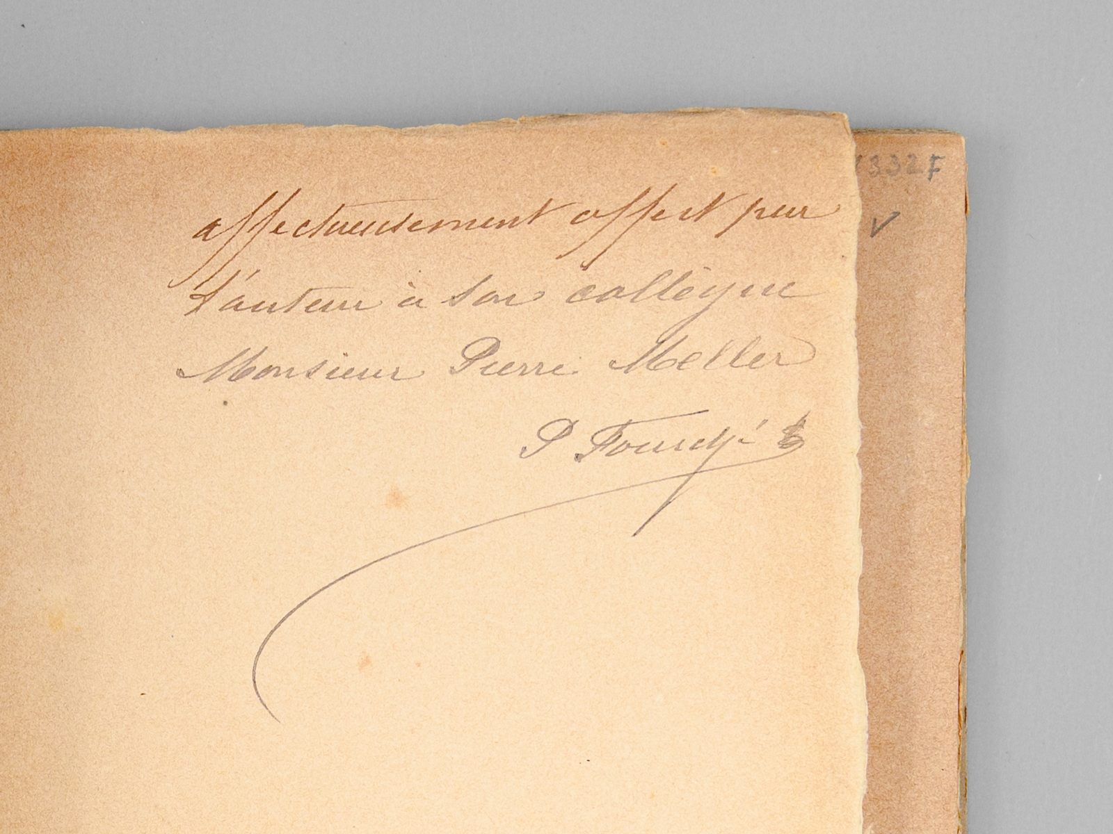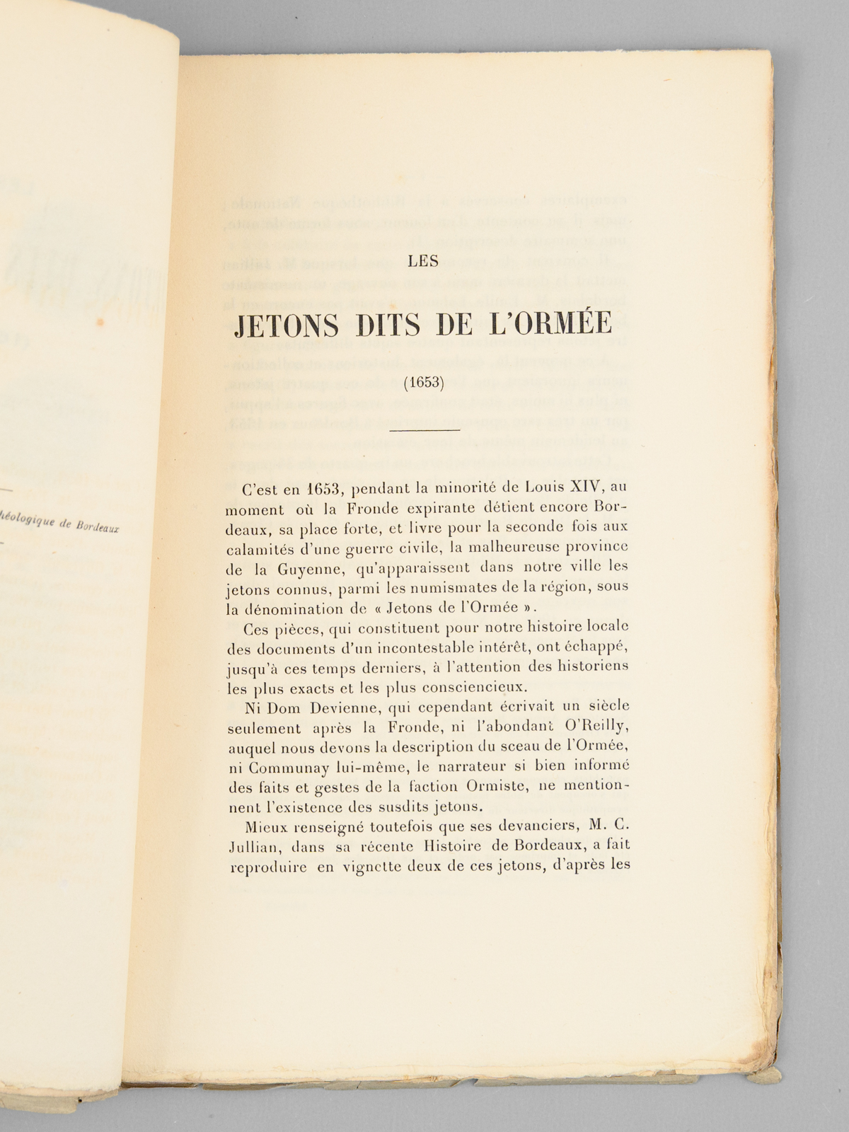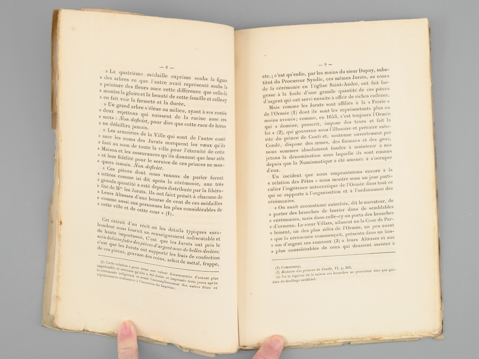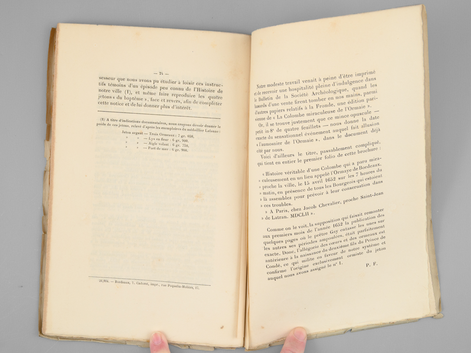 Commentaire : Rare exemplaire de ce tiré-à-part imprimé sur beau hollande, consacré aux jetons frappés lors de la 'Fronde bordelaise' de l'Ormée, et dédicacé par l'auteur à l'érudit Pierre Meller. Etat très satisfaisant (marges de la couv. frottée, bon état par ailleurs).