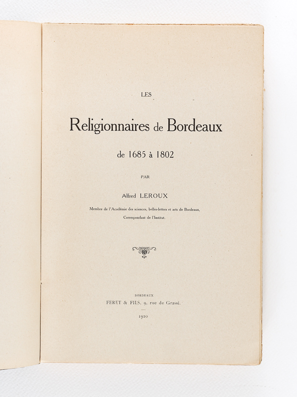 E.O., 1 vol. grand in-8 br., Féret & Fils, Bordeaux, 1920, XII-378 pp. Commentaire : Bon exemplaire (très bon état) pour ce livre sur l'histoire des Protestants à Bordeaux, de la révocation de l'Edit de Nantes au Concordat.
