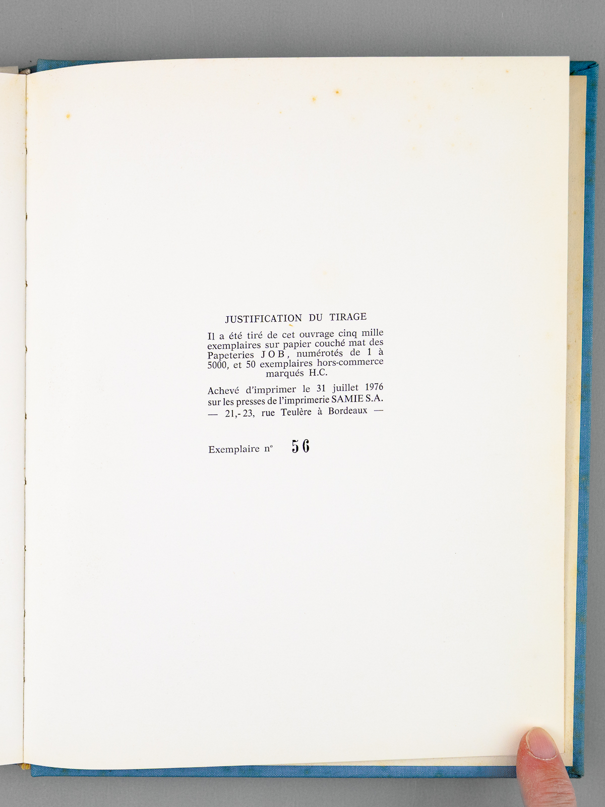 Tirage à 5000 exemplaires sur papier couché mat numéroté (n° 56), 1 vol. grand in-8 reliure pleine toile bleue éditeur, Editions Féret et Fils, Bordeaux, 1976, 210 pp. avec tableau généalogique dépliant