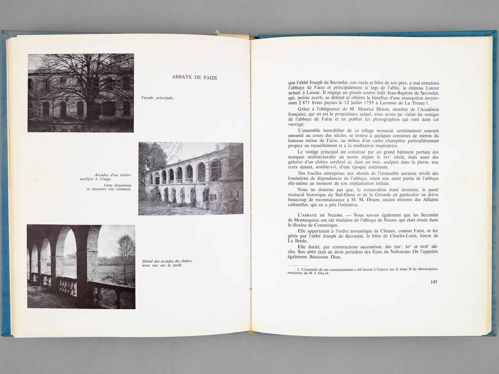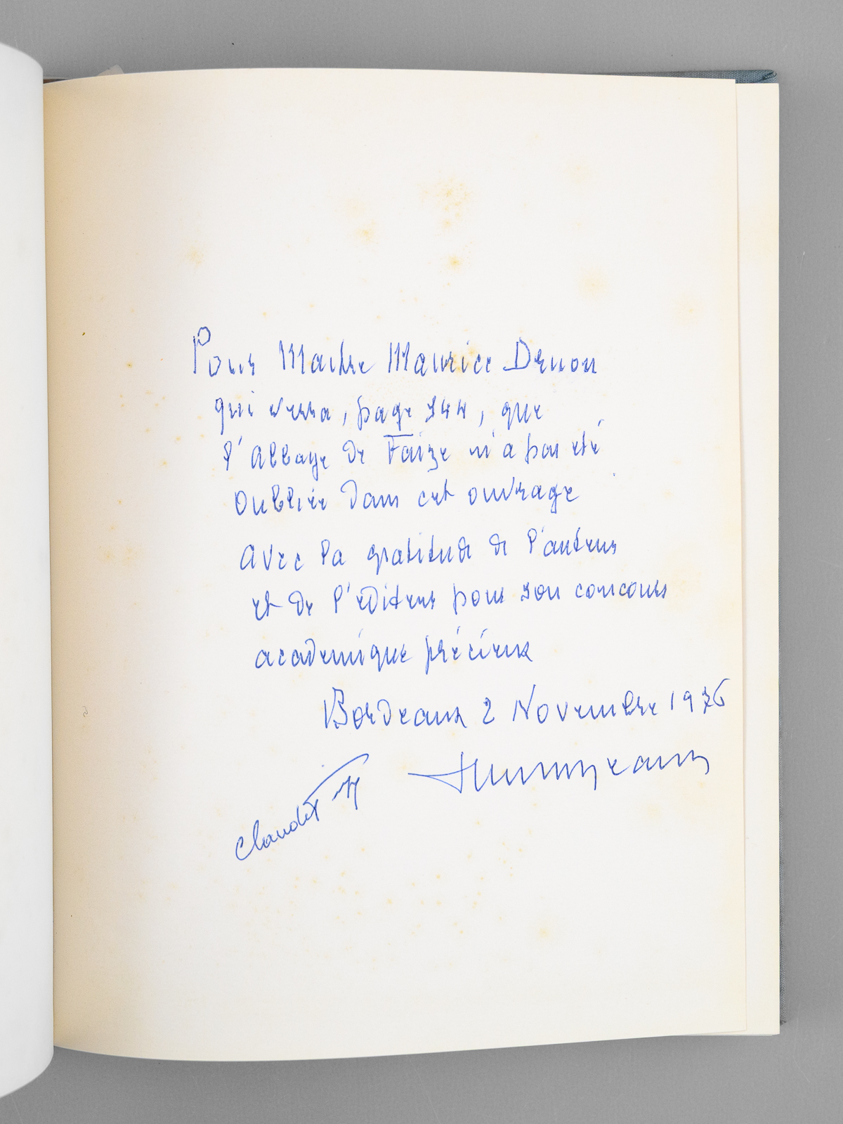 Commentaire : Très bel envoi de Jean-Max Eylaud 'pour Maître Maurice Druon qui verra, page 144, que l'Abbaye de Faize n'a pas été oubliée dans cet ouvrage. Avec la gratitude de l'auteur et de l'éditeur pour son concours académique précieux'. Remarquable provenance pour cette monographie évoquant notamment l'Abbaye de Faise qui fut propriété des Secondat : de la bibliothèque de Maurice Druon, qui acquit le domaine en 1972. L'exemplaire est également signé par Claude Martin, de Clairac. Bon état (sans jaquette).