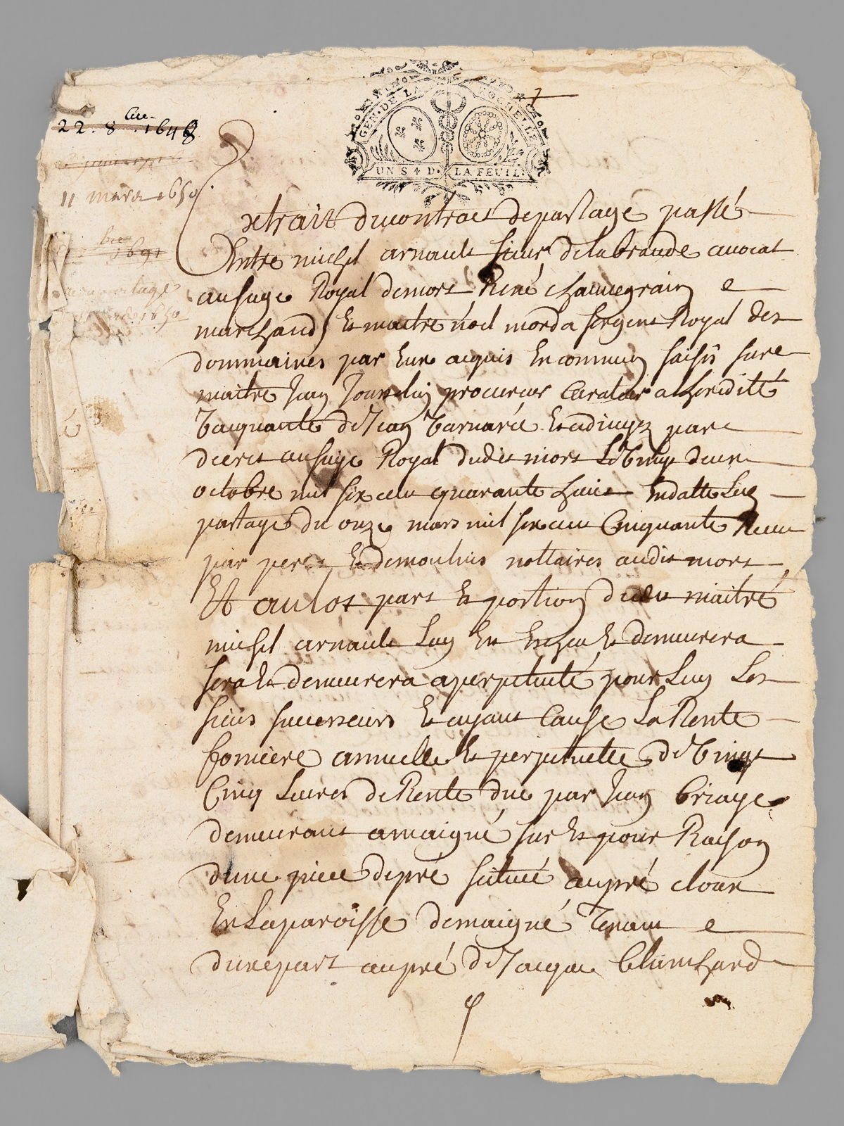 Lot d'archives privées du XVIIe et XVIIIe siècles relatives à l'Abbaye de Saint-Liguaire, La Tiffardière, Magné, dans la chastellenie de Niort [ 10 documents ] - Auteur: Collectif - Année d'édition: 1660