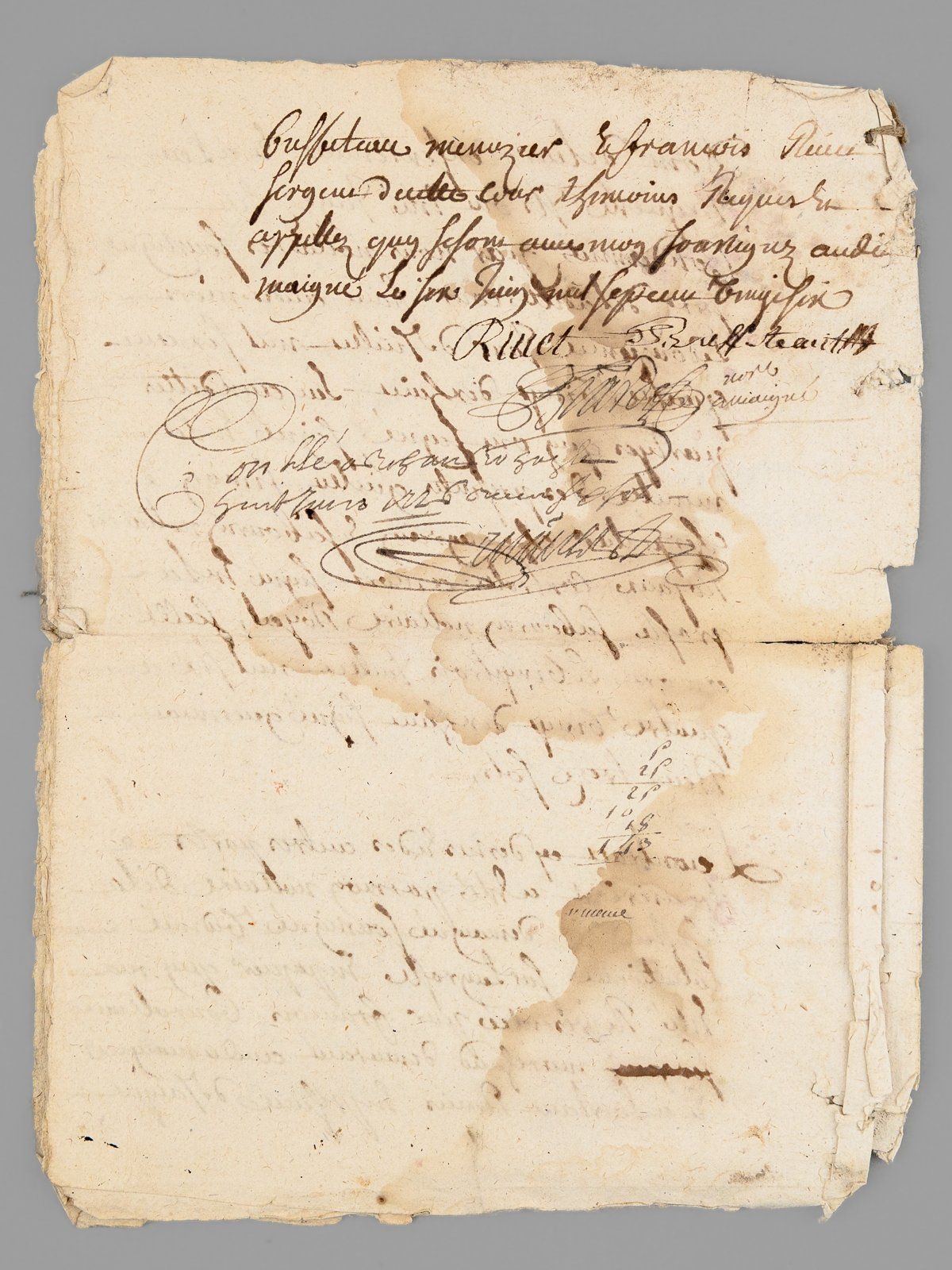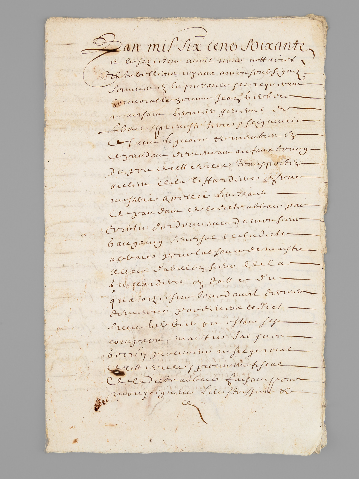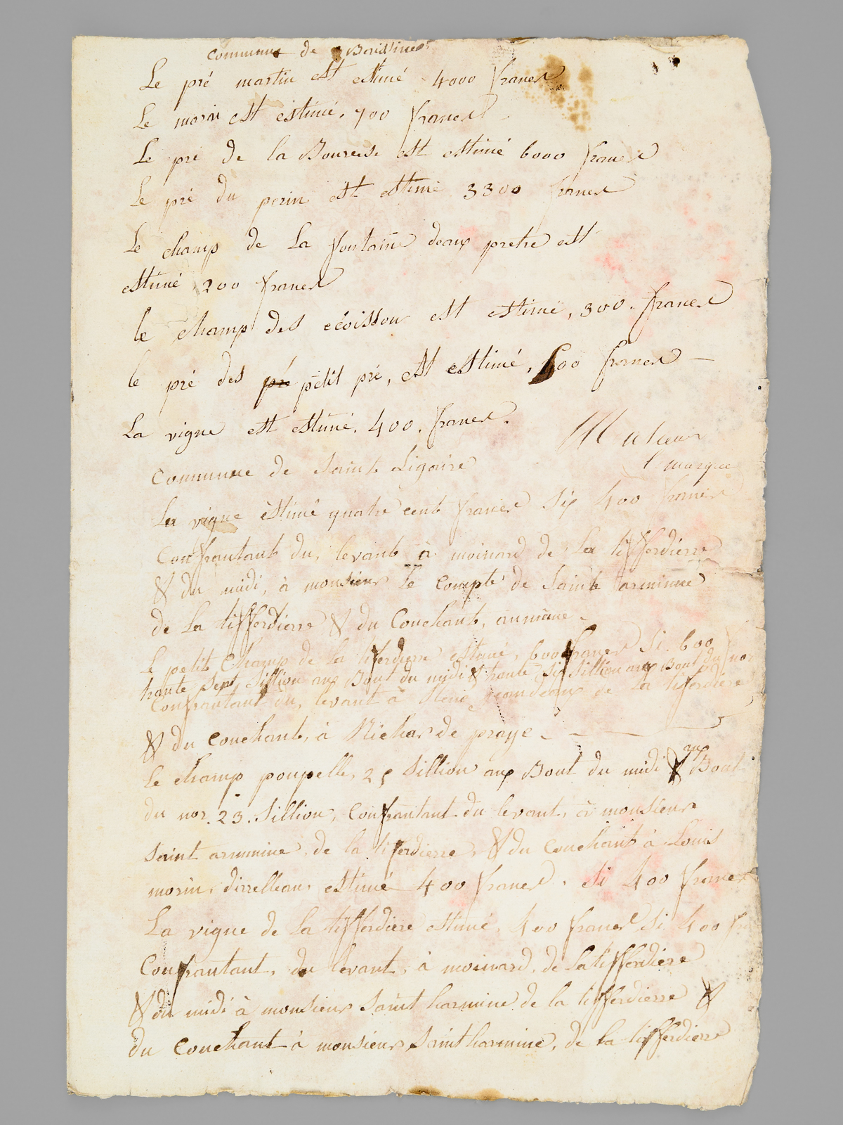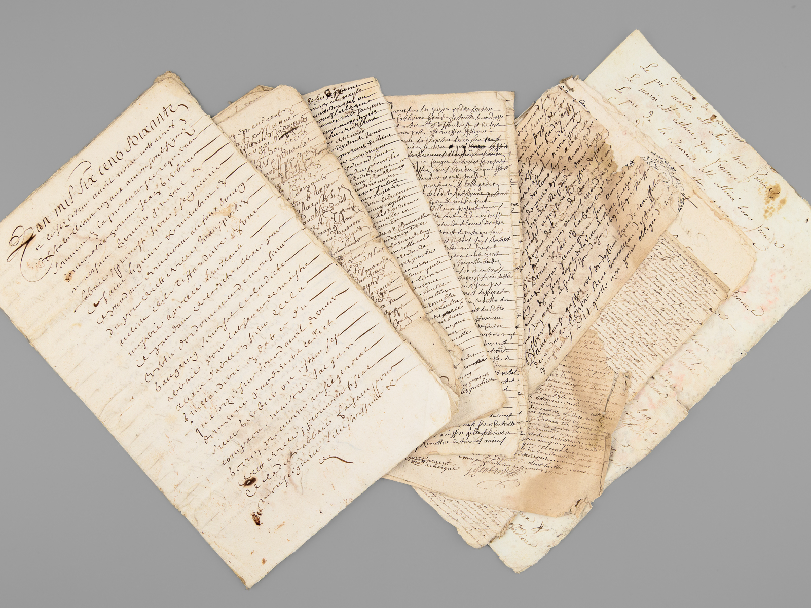 10 documents d'archives datés de : 1660 (6 ff., évoquant notamment l'Abbaye de Saint-Liguaire, la Tiffardière, le 'faux-bourg du pont', etc...) ; 1678 (2 ff.) ; 1695 (2 ff.) ; 1687 (2 ff.) ; 4 ff. ; 1 f. ; 1693 (1 f.) ; 2 ff., 6 ff. (1726) ; 2 ff. Commentaire : Lot de 10 documents, essentiellement du XVIIe siècle, relatifs à l'Abbaye de Saint-Liguaire, La Tiffardière, Magné, dans la chastellenie de Niort. Prix de l'ensemble, en l'état (mouill. et qq. petit mq.) pour ce lot à étudier. L'ancienne Abbaye de Saint-Liguaire, le lieu-dit de La Tiffardière et la commune de Magné sont situés à l'ouest de la ville de Niort.