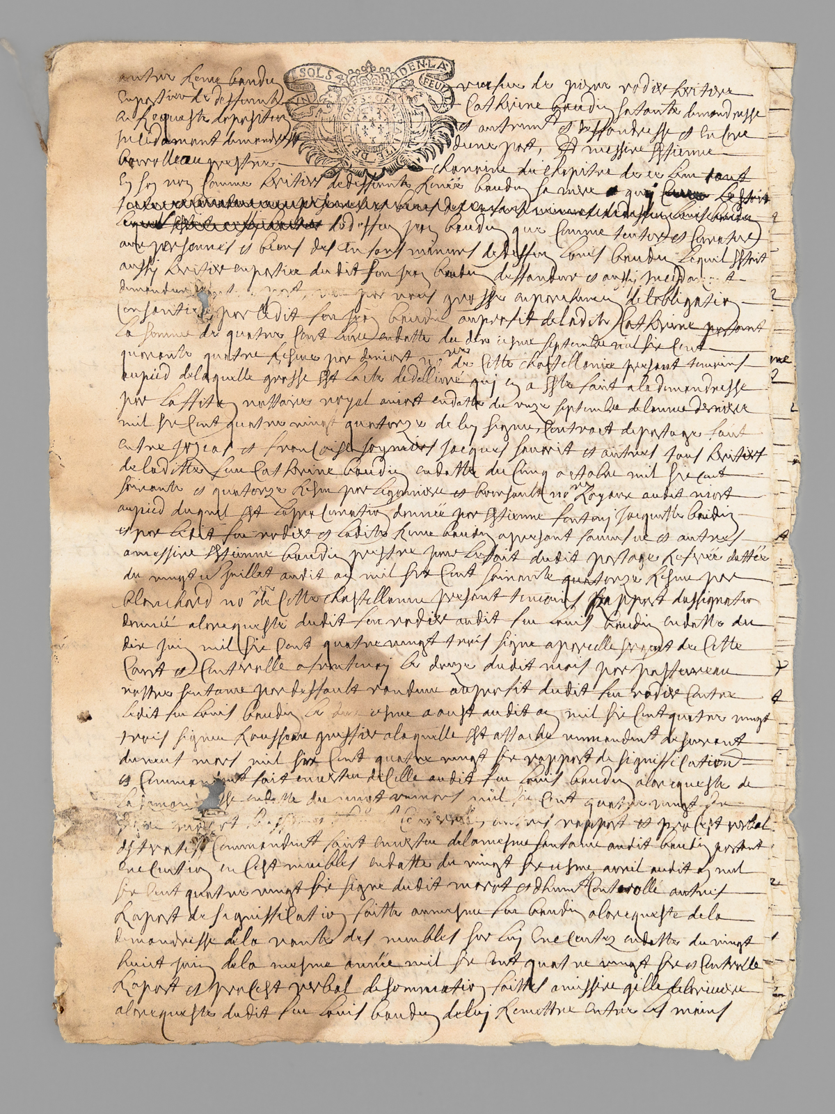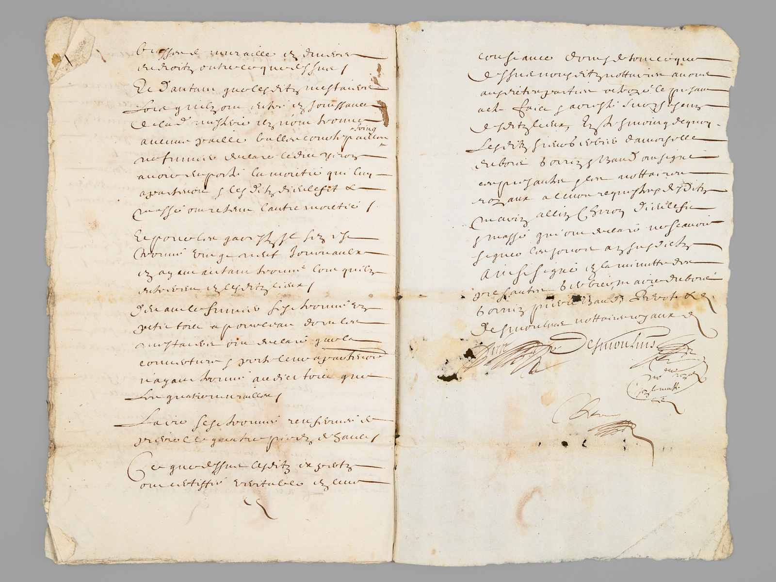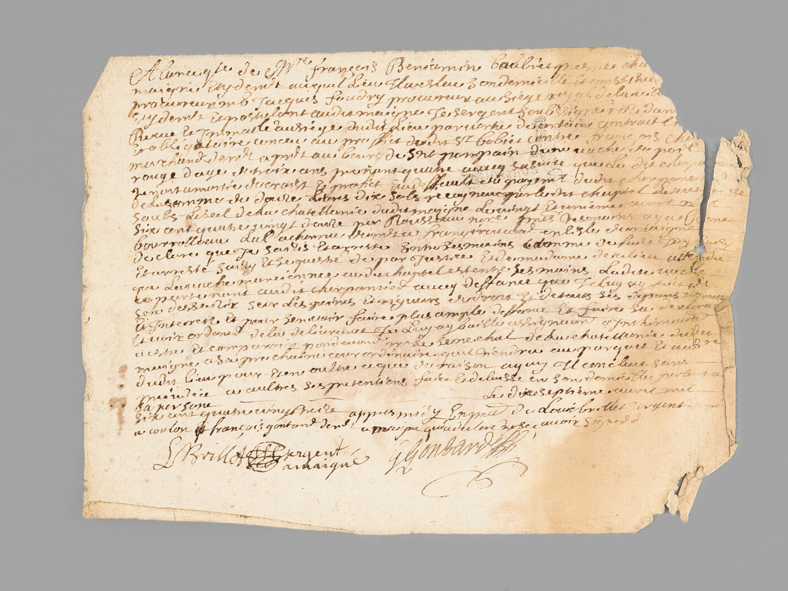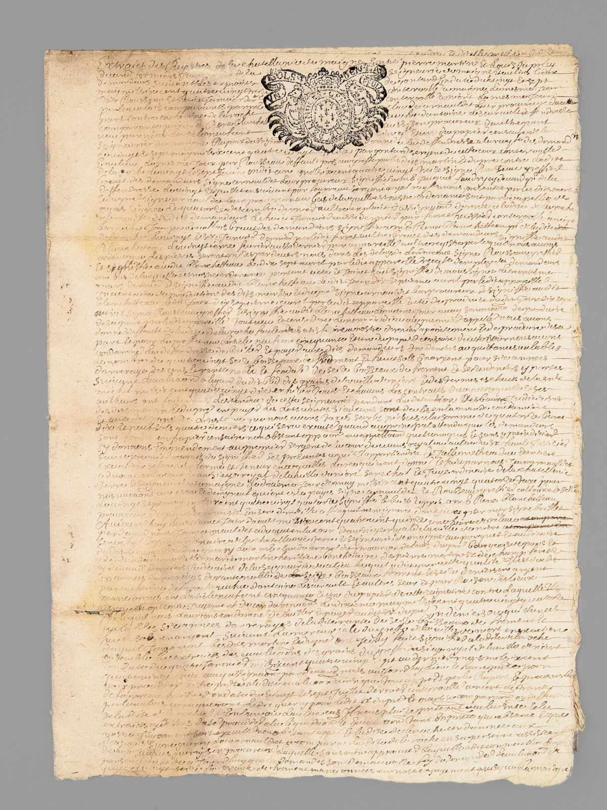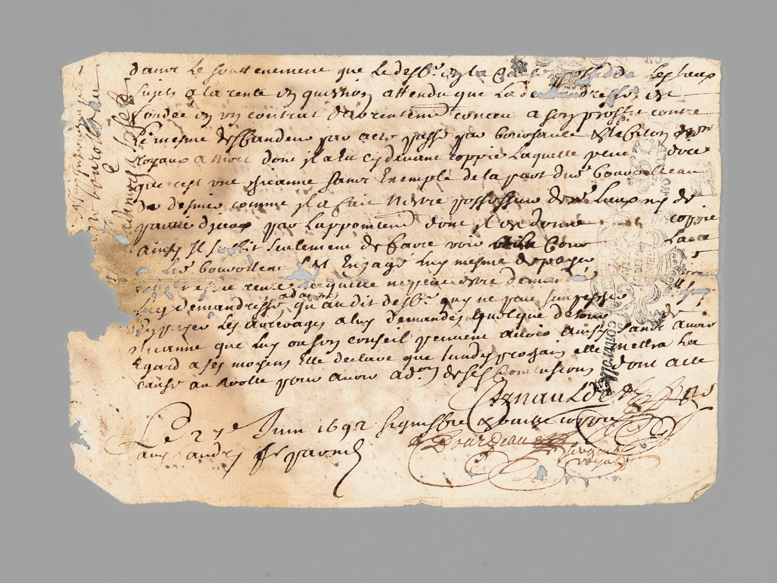 10 documents d'archives datés de : 1660 (6 ff., évoquant notamment l'Abbaye de Saint-Liguaire, la Tiffardière, le 'faux-bourg du pont', etc...) ; 1678 (2 ff.) ; 1695 (2 ff.) ; 1687 (2 ff.) ; 4 ff. ; 1 f. ; 1693 (1 f.) ; 2 ff., 6 ff. (1726) ; 2 ff. Commentaire : Lot de 10 documents, essentiellement du XVIIe siècle, relatifs à l'Abbaye de Saint-Liguaire, La Tiffardière, Magné, dans la chastellenie de Niort. Prix de l'ensemble, en l'état (mouill. et qq. petit mq.) pour ce lot à étudier. L'ancienne Abbaye de Saint-Liguaire, le lieu-dit de La Tiffardière et la commune de Magné sont situés à l'ouest de la ville de Niort.