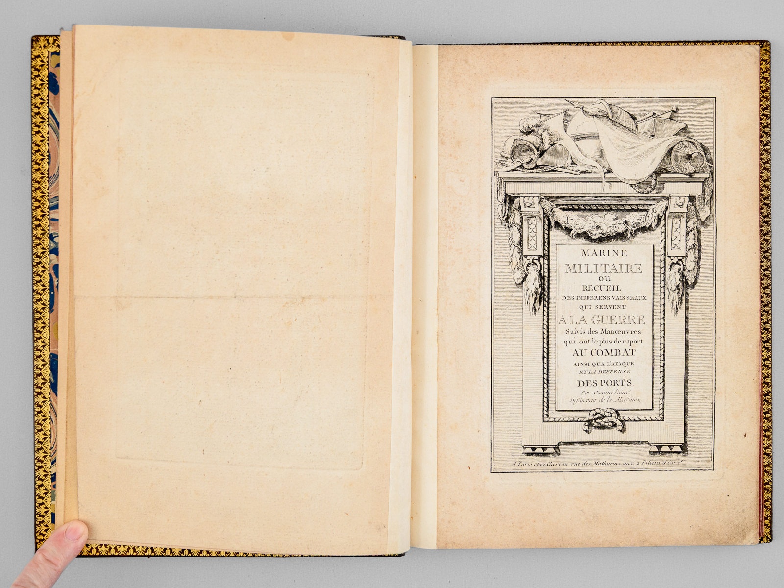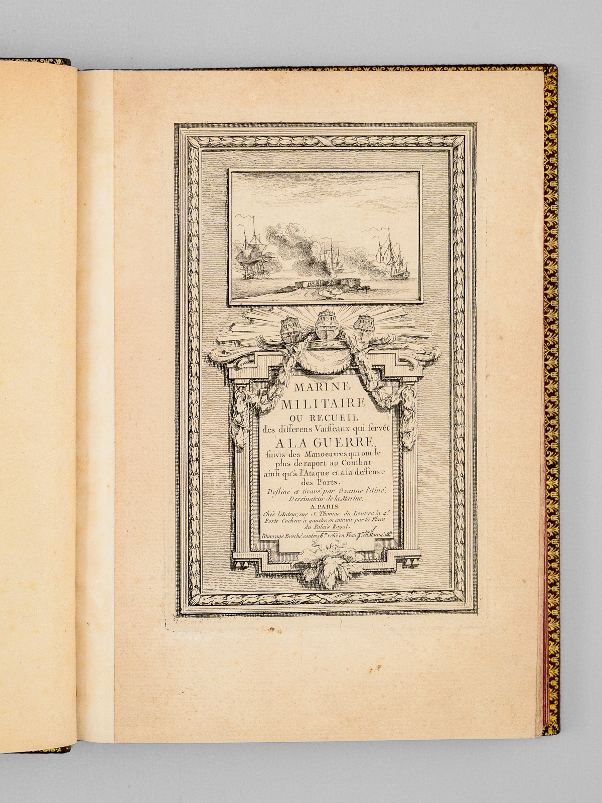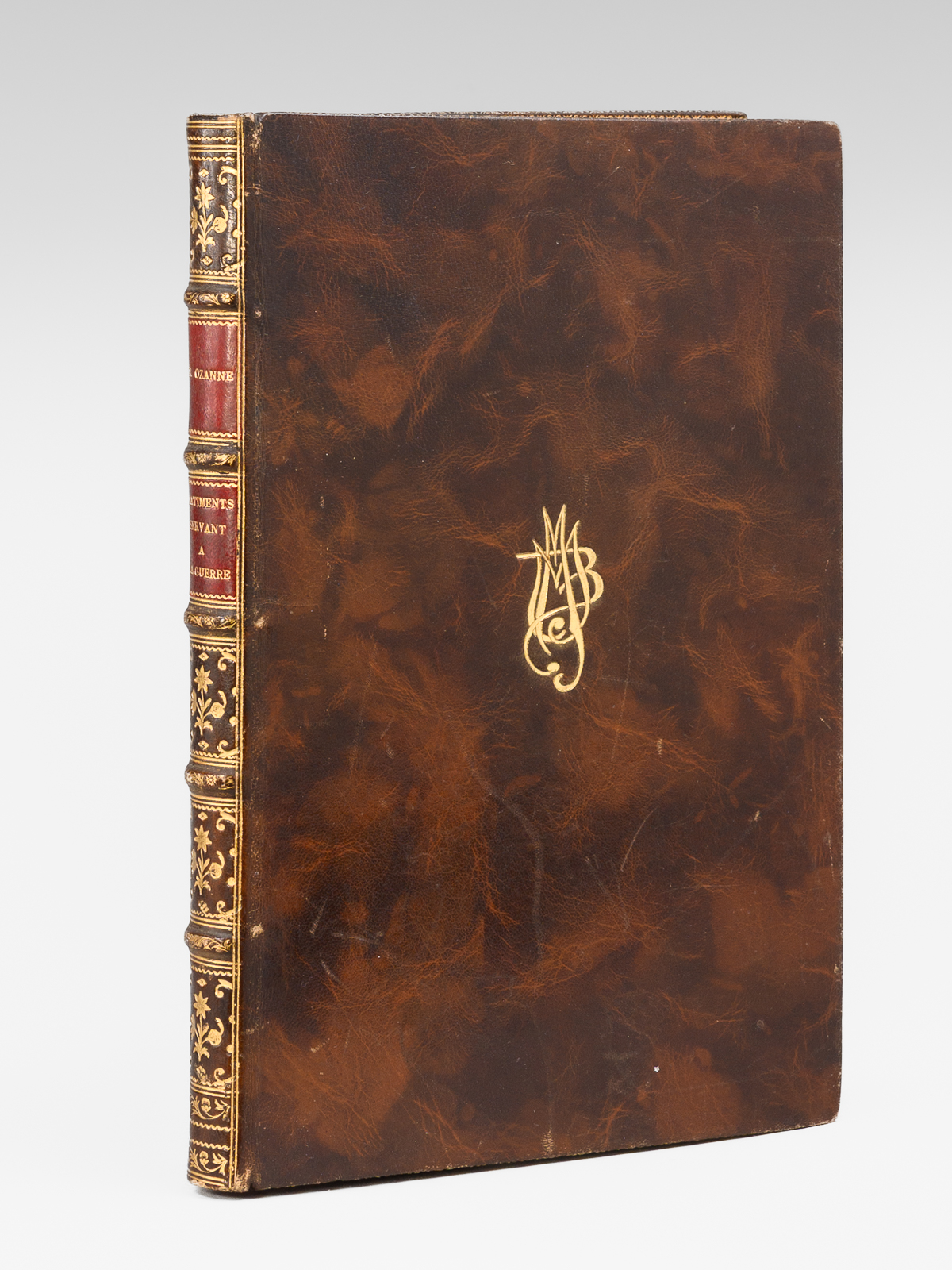 Marine militaire ou Recueil des differens vaisseaux qui servent à la guerre, suivis des Manoeuvres qui ont le plus de raport au Combat ainsi qu'à l'Attaque et à la deffense des Ports, Dessiné et gravé par Ozanne l'Aîné, Dessinateur de la Marine, 1 vol. grand in-8 reliure postérieure moitié XXe siècle plein box marbré, dos à 5 nerfs dorés richement orné, coupes et chasses ornées, chiffre doré stylisé 'MMB' au premier plat, tranches rouges, Chez l'Auteur, rue S. Thomas du Louvre, Paris, s.d [1762] et Chez Chereau, rue des Mathurins aux 2 Piliers d'Or, s.d., 2 ff. (Titre 'Chez l'auteur' et titre 'Chez Chereau'), 49 planches (l'avertissement et la table gravée au verso sont numérotés 2 et 3 en recto verso, la planche 50 double).