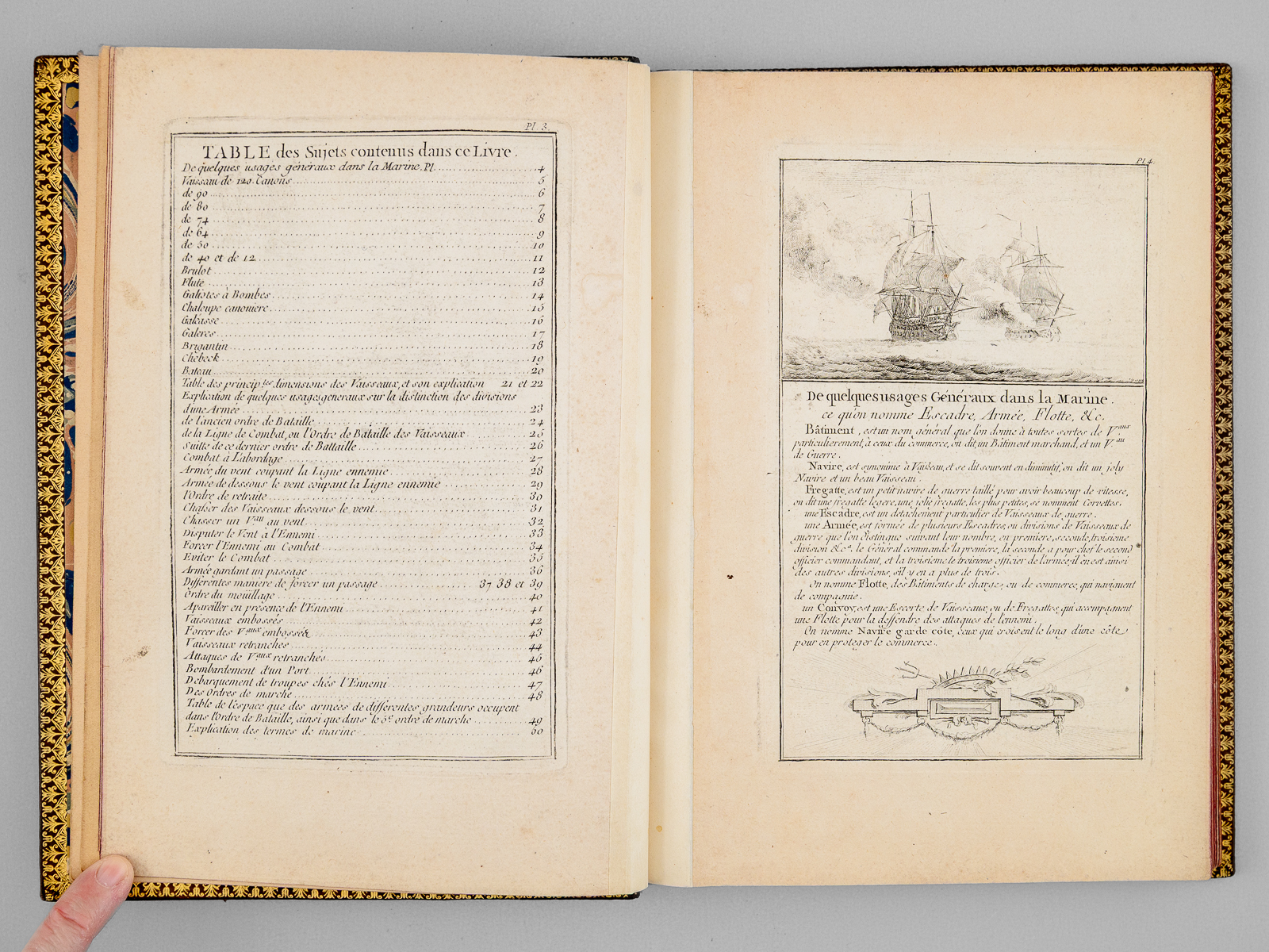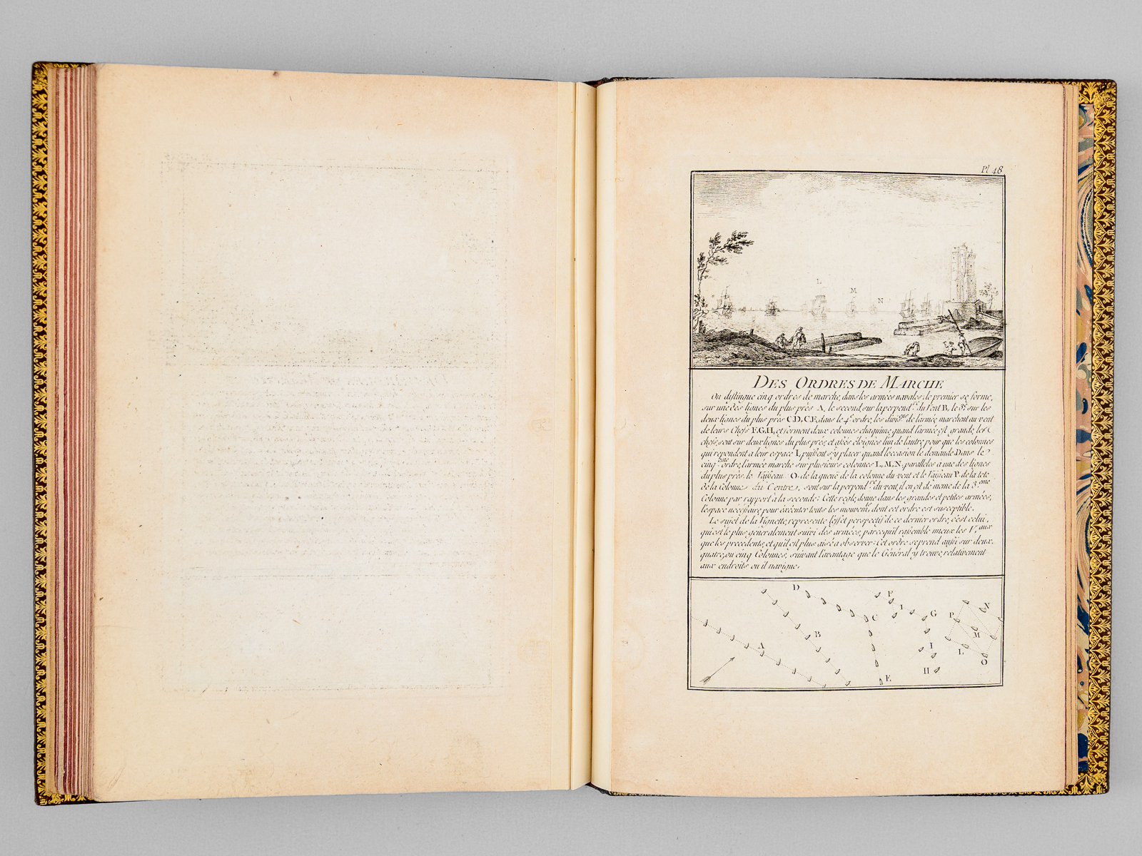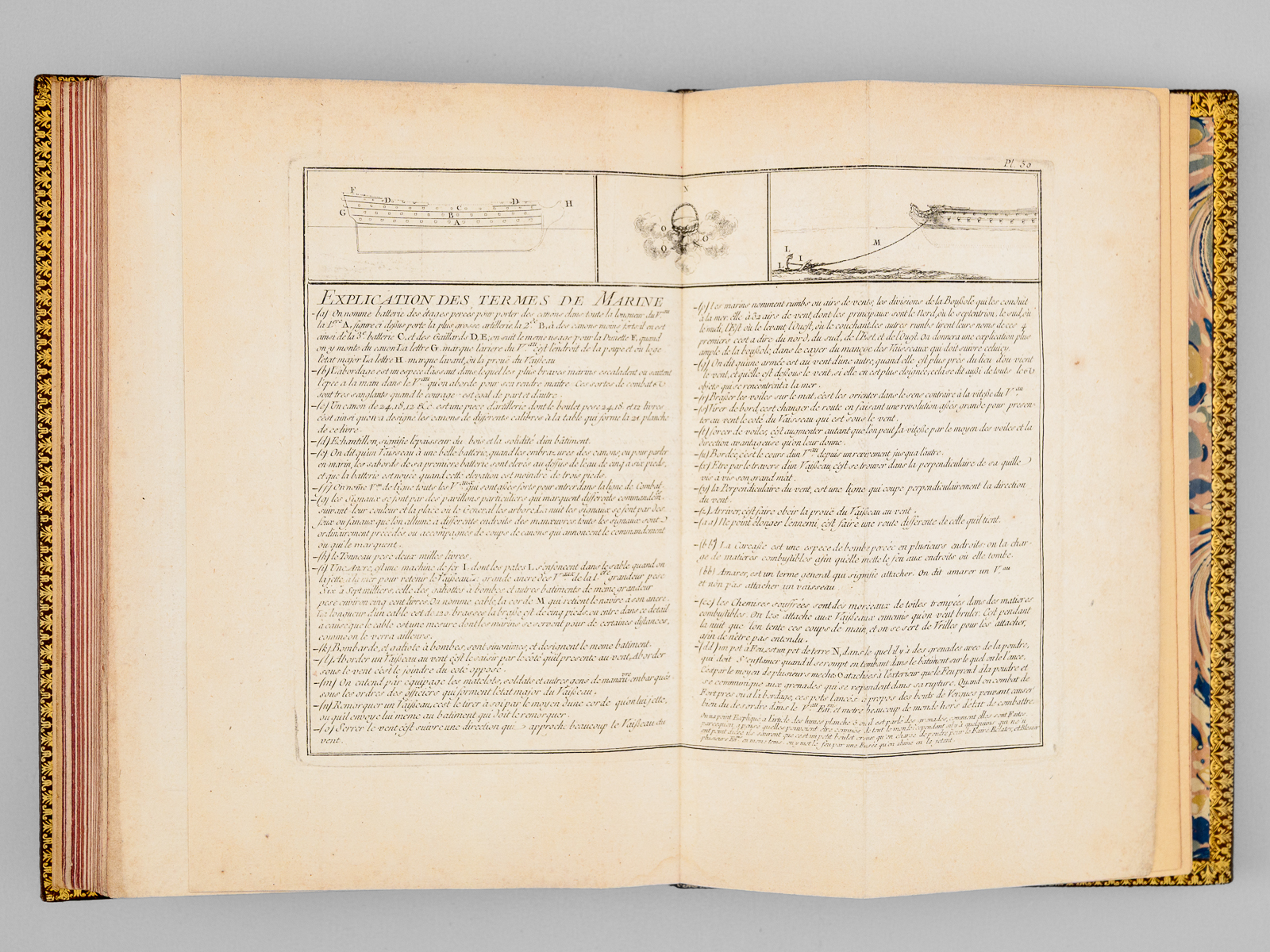Marine militaire ou Recueil des differens vaisseaux qui servent à la guerre, suivis des Manoeuvres qui ont le plus de raport au Combat ainsi qu'à l'Attaque et à la deffense des Ports, Dessiné et gravé par Ozanne l'Aîné, Dessinateur de la Marine, 1 vol. grand in-8 reliure postérieure moitié XXe siècle plein box marbré, dos à 5 nerfs dorés richement orné, coupes et chasses ornées, chiffre doré stylisé 'MMB' au premier plat, tranches rouges, Chez l'Auteur, rue S. Thomas du Louvre, Paris, s.d [1762] et Chez Chereau, rue des Mathurins aux 2 Piliers d'Or, s.d., 2 ff. (Titre 'Chez l'auteur' et titre 'Chez Chereau'), 49 planches (l'avertissement et la table gravée au verso sont numérotés 2 et 3 en recto verso, la planche 50 double).